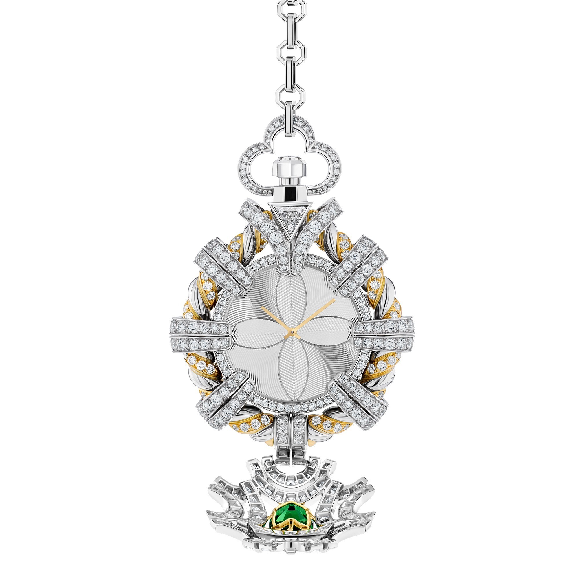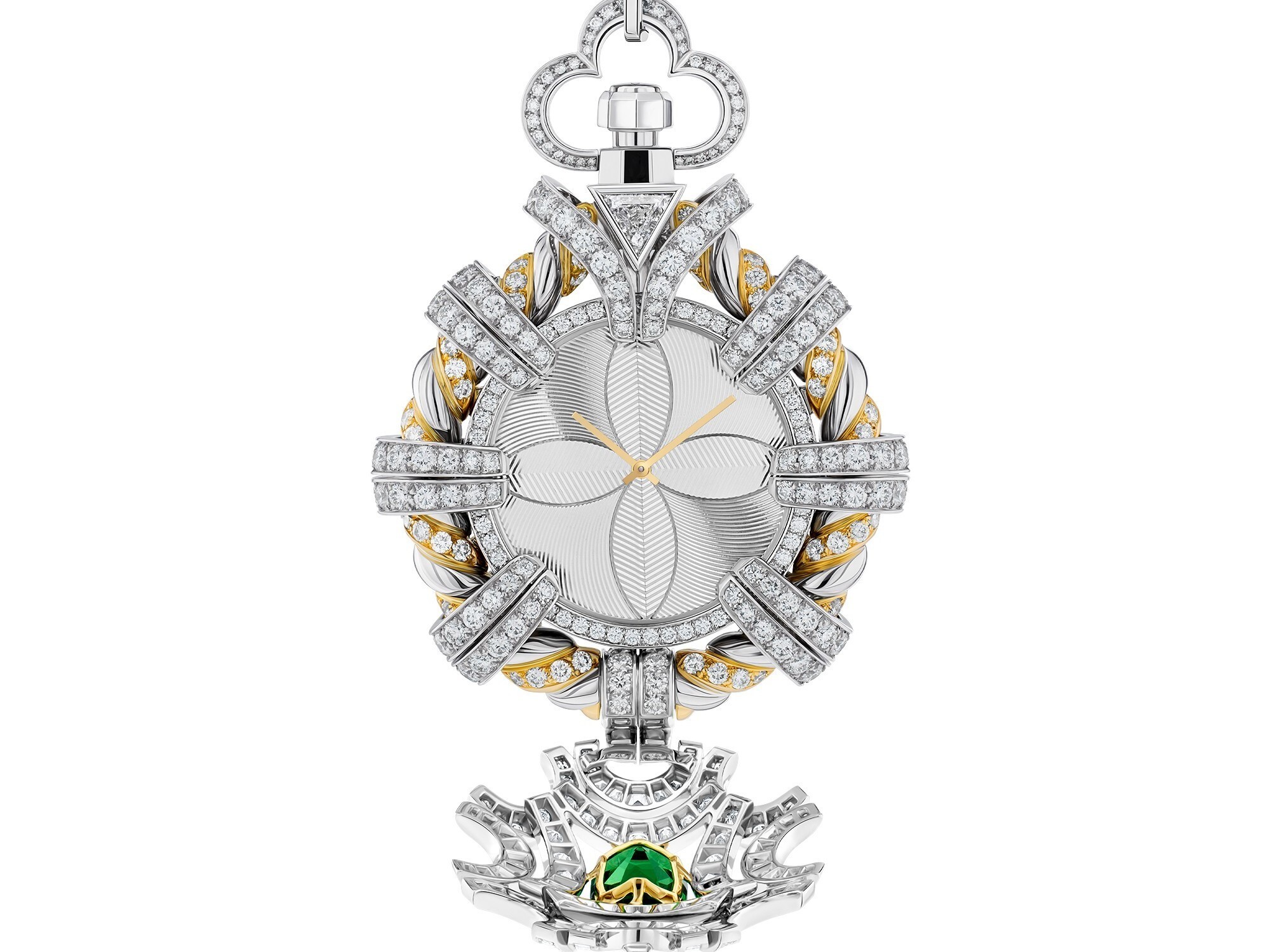 The Louis Vuitton Phenomenal Tsavorite Pocket Watch is a statement of opulence from the brand’s 2025 Awakened Hands, Awakened Minds high jewelry collection. Designed with daring creativity, the piece transforms a diamond rope motif into an ornamental tribute to both the Maison’s heritage and 19th-century French weaving artistry. At the heart of the cover lies a 2.71-carat cushion-cut tsavorite, perfectly proportioned and radiantly clear, capturing the eye with its vivid green brilliance.