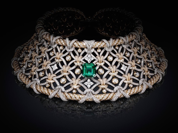 This emerald and diamond necklace is part of Louis Vuitton’s 2024 high jewelry collection, “Awakened Hands, Awakened Minds”. Through the use of precious metals and intricate gemstone setting, it pays tribute to the brand’s heritage and 19th-century French weaving techniques. The entire piece took 4,276 hours to complete, making it one of the most complex creations in the collection.