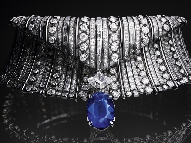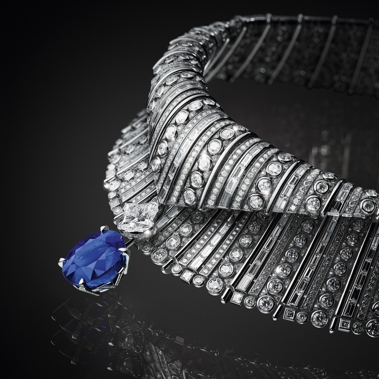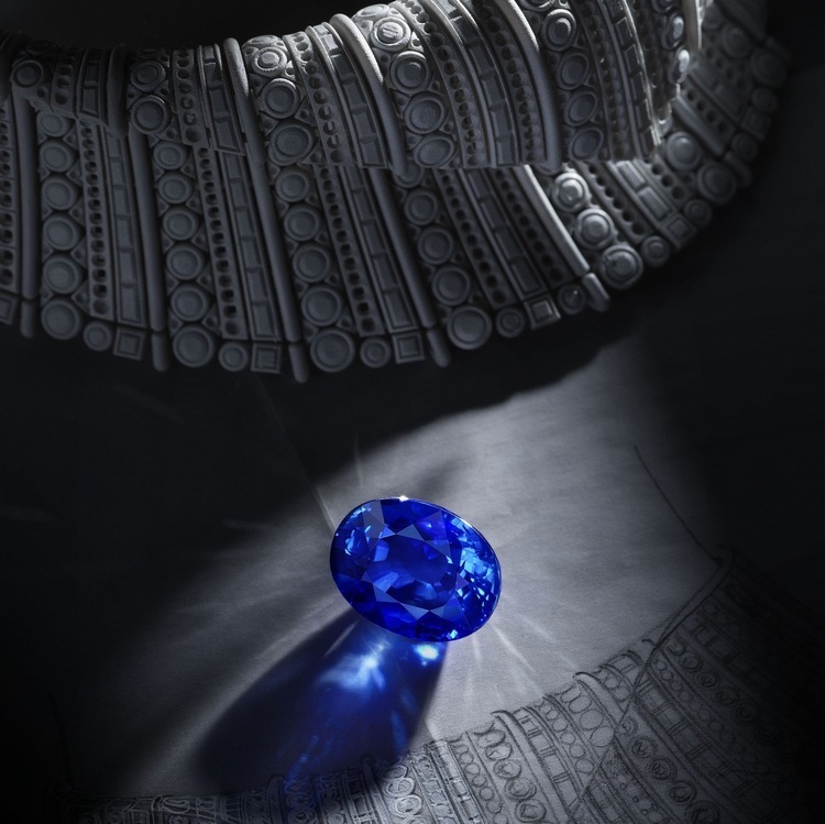This Wave necklace is from the Louis Vuitton 2023 ‘Deep Time’ high jewelry collection. Its design is inspired by the immense power of a colossal ocean wave. The designer boldly captures the crest of a giant wave with a scalloped, three-dimensional structure, from which suspends a remarkable 40.8-carat oval-cut sapphire from Sri Lanka, paying tribute to the raw power of Earth.