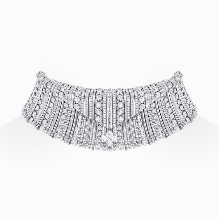 This breathtaking necklace was personally designed by the brand’s Jewelry Artistic Director, Francesca Amfitheatrof. The undulating structure mimics the dynamic form of a rolling wave, skillfully alternating diamonds of different cuts and sizes to resemble shimmering spray. The wave culminates in a 6.19-carat LV Monogram flower-cut diamond, freezing a moment of the wave’s vibrant energy in time.
