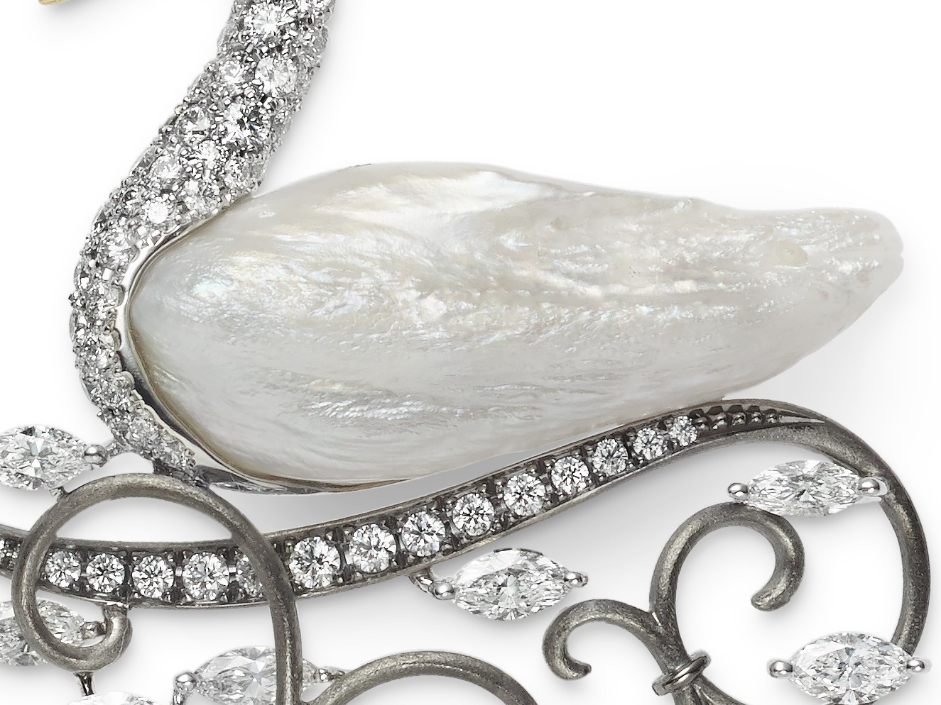 The brooch captures the swan’s side profile in motion—its body is crafted from a baroque pearl, cleverly using the pearl’s naturally irregular shape. The back arches naturally, the tail curves slightly upward, and the textured surface evokes the fullness of white feathers.