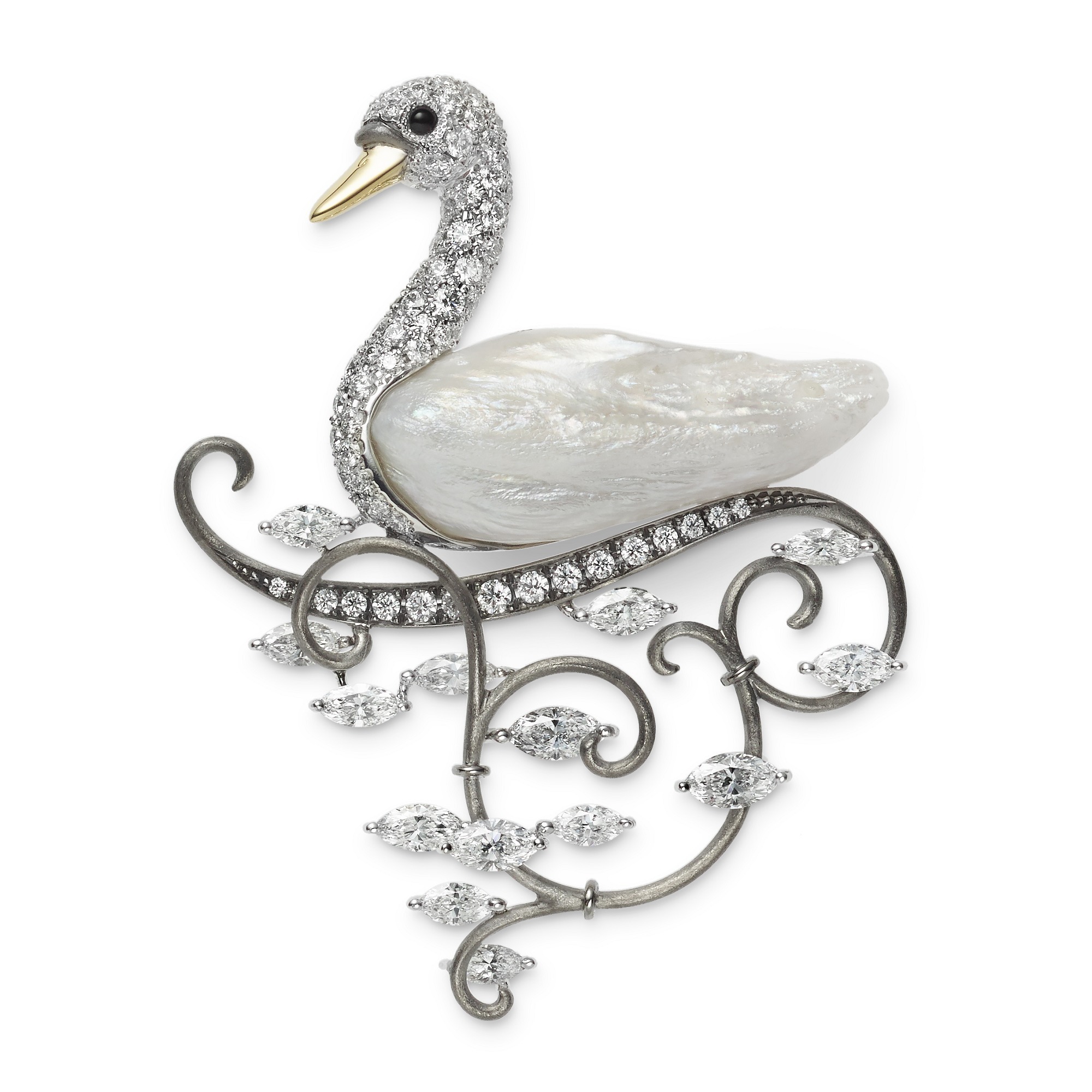The swan’s elongated neck is paved with round diamonds, contrasting beautifully with the soft luster of the pearl, while the head extends naturally into a gold beak. The eye is set with a cabochon onyx, giving the piece a lively and expressive character.