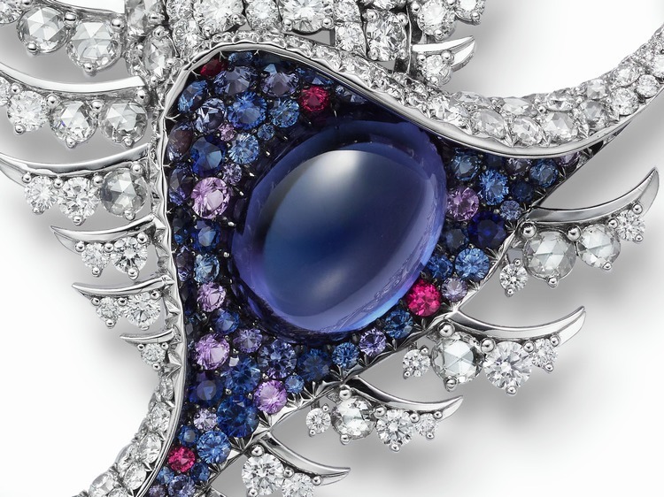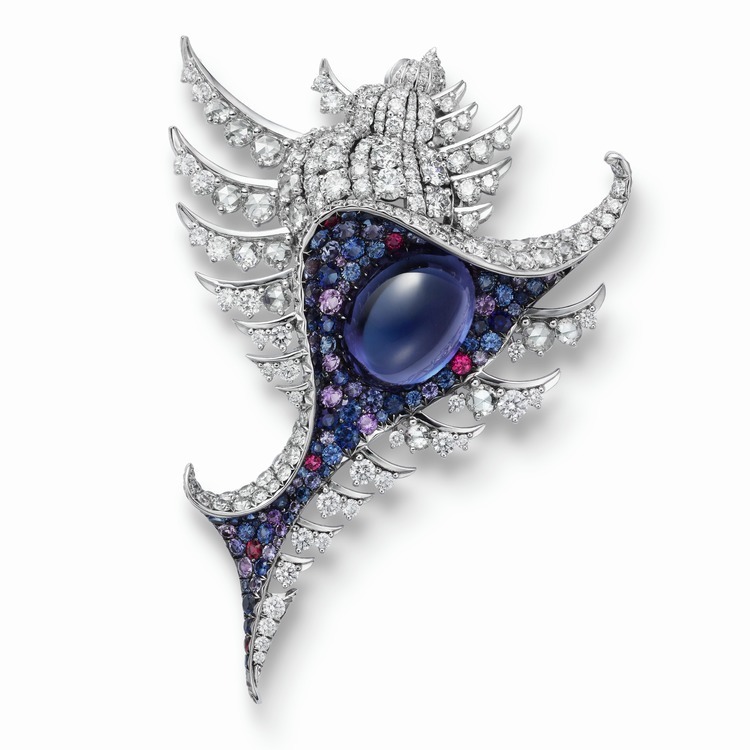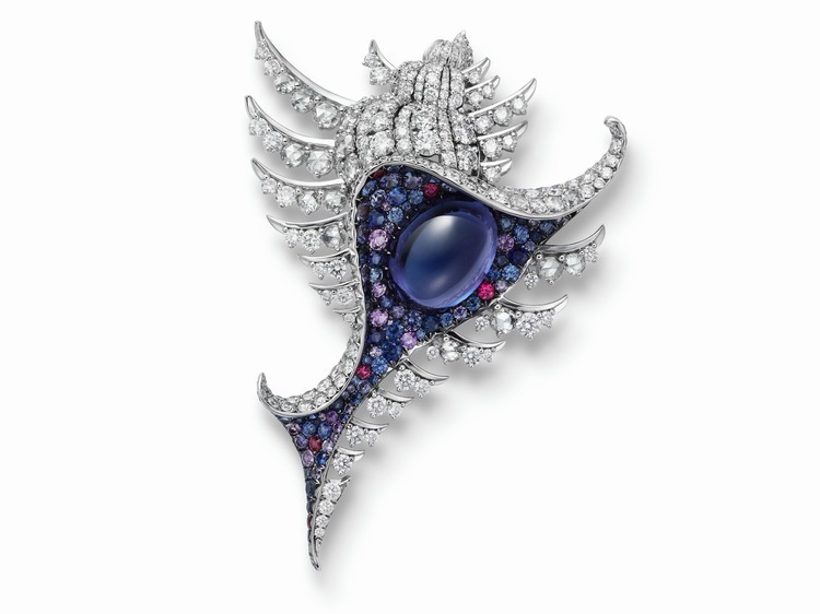 This tanzanite brooch is from Mikimoto’s 2023 “Praise to the Sea” High Jewelry collection. The design draws inspiration from the Angaria delphinus sea snail, known for its beautiful spines. The outer shell is pavé-set with brilliant-cut diamonds, while the inner shell is adorned with mysterious blue-violet gemstones. A large cabochon-cut tanzanite serves as the centerpiece, evoking the enigmatic mollusks hidden deep within the ocean.