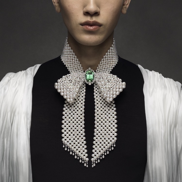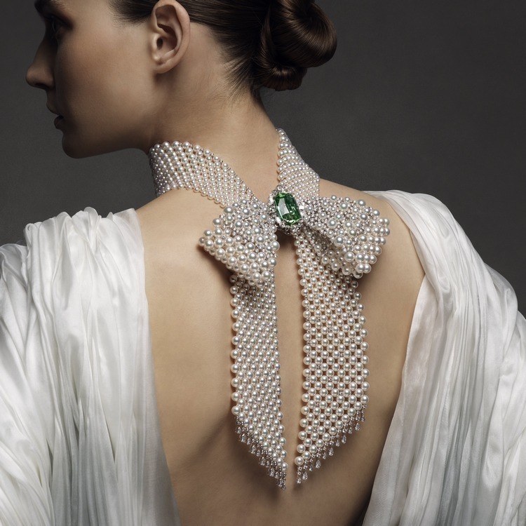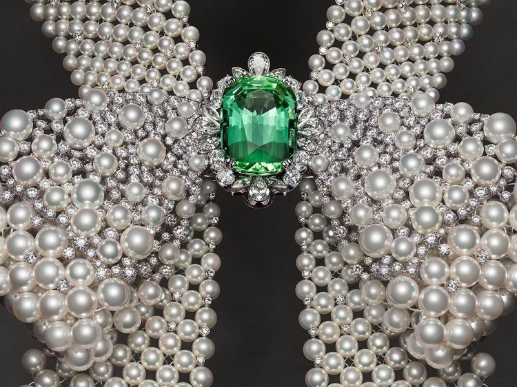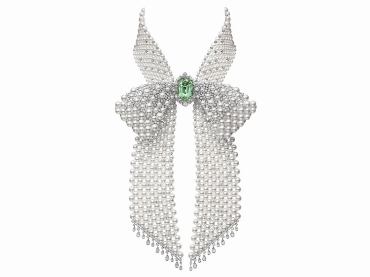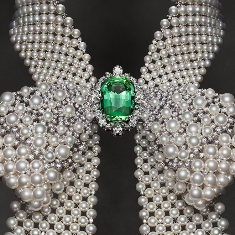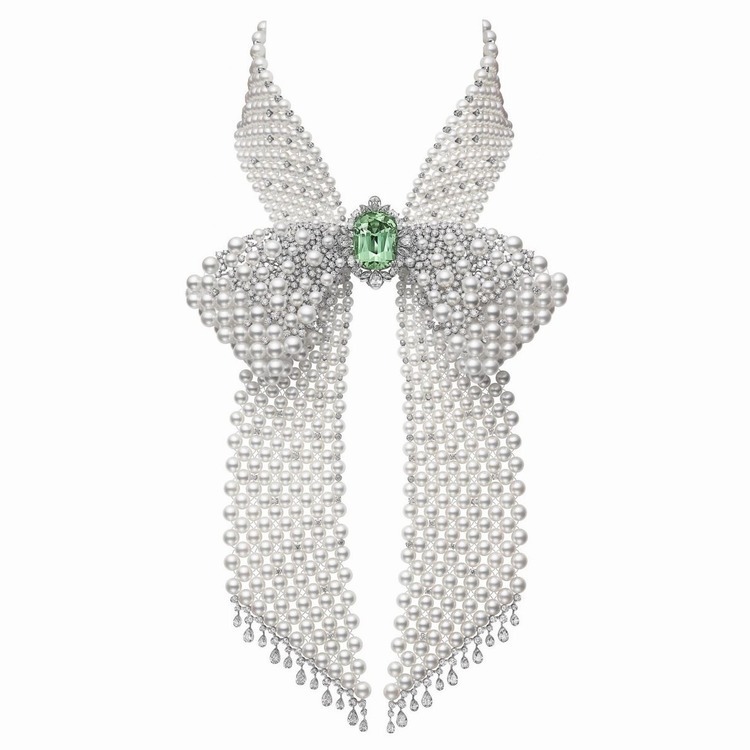 This bow-inspired satin ribbon pearl necklace comes from Mikimoto’s 2024 “The Bows” high jewelry collection. Continuing the brand’s classic ribbon motif, it combines Akoya pearls and diamonds to create a luxurious visual effect. At the center is a 53.17ct green tourmaline, whose fresh mint-green hue provides a striking focal point.
