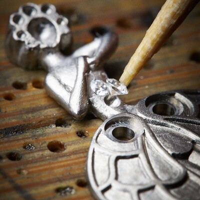 Jewelry version: bezel set with 144 brilliant-cut diamonds (approx. 0.93 ct), outer edge set with 38 brilliant-cut diamonds (approx. 0.11 ct).