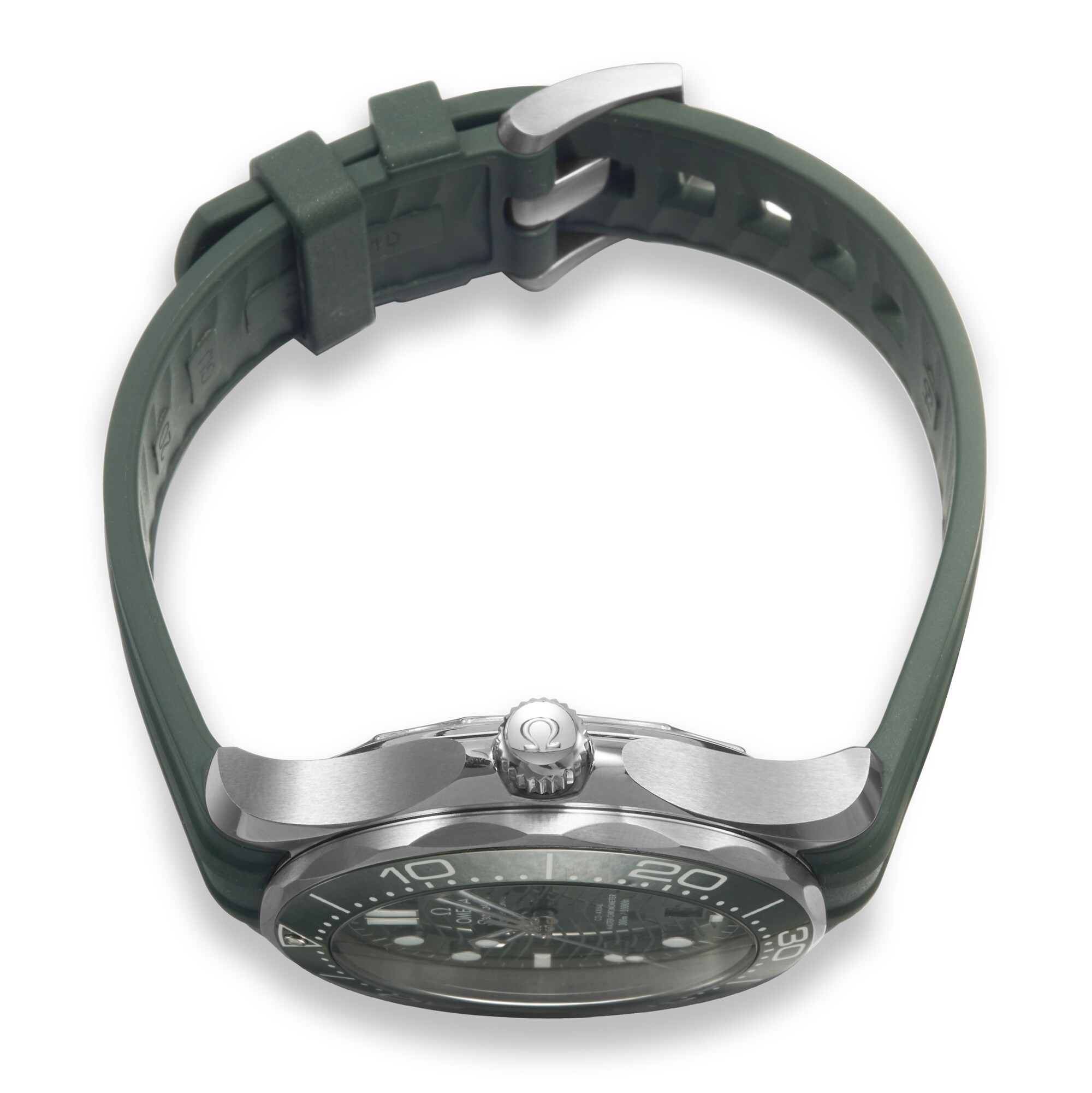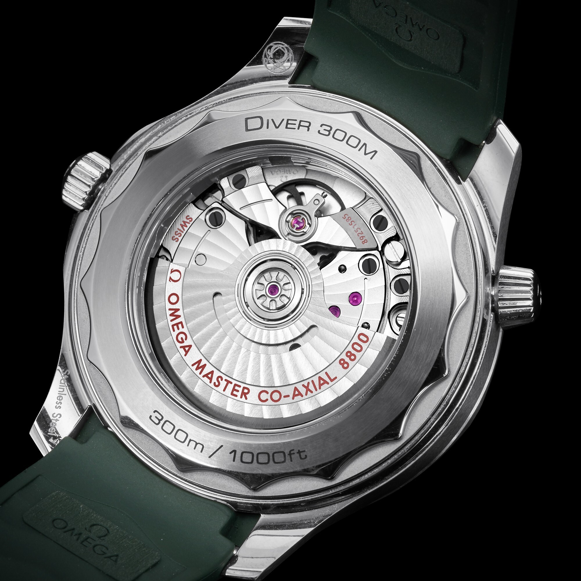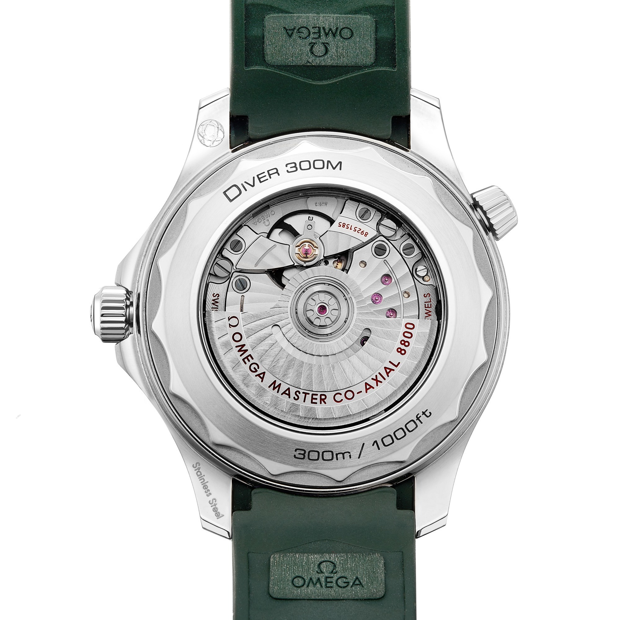 Stainless steel case, diameter 42mm. Ceramic bezel. Screw-down crown. Sapphire crystal. Green dial. Skeleton hands. OMEGA Co-Axial Master Chronometer Calibre 8800 automatic movement, 35 jewels, 25,200 vph, 55-hour power reserve. Rubber strap. Water-resistant to 300 meters.