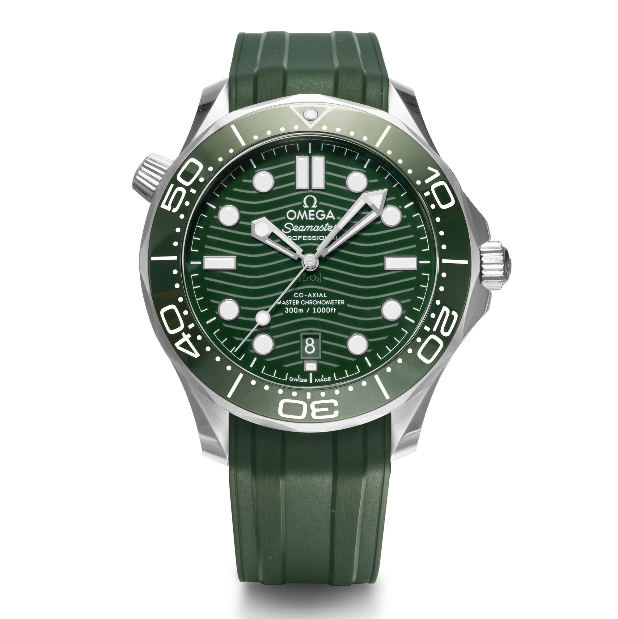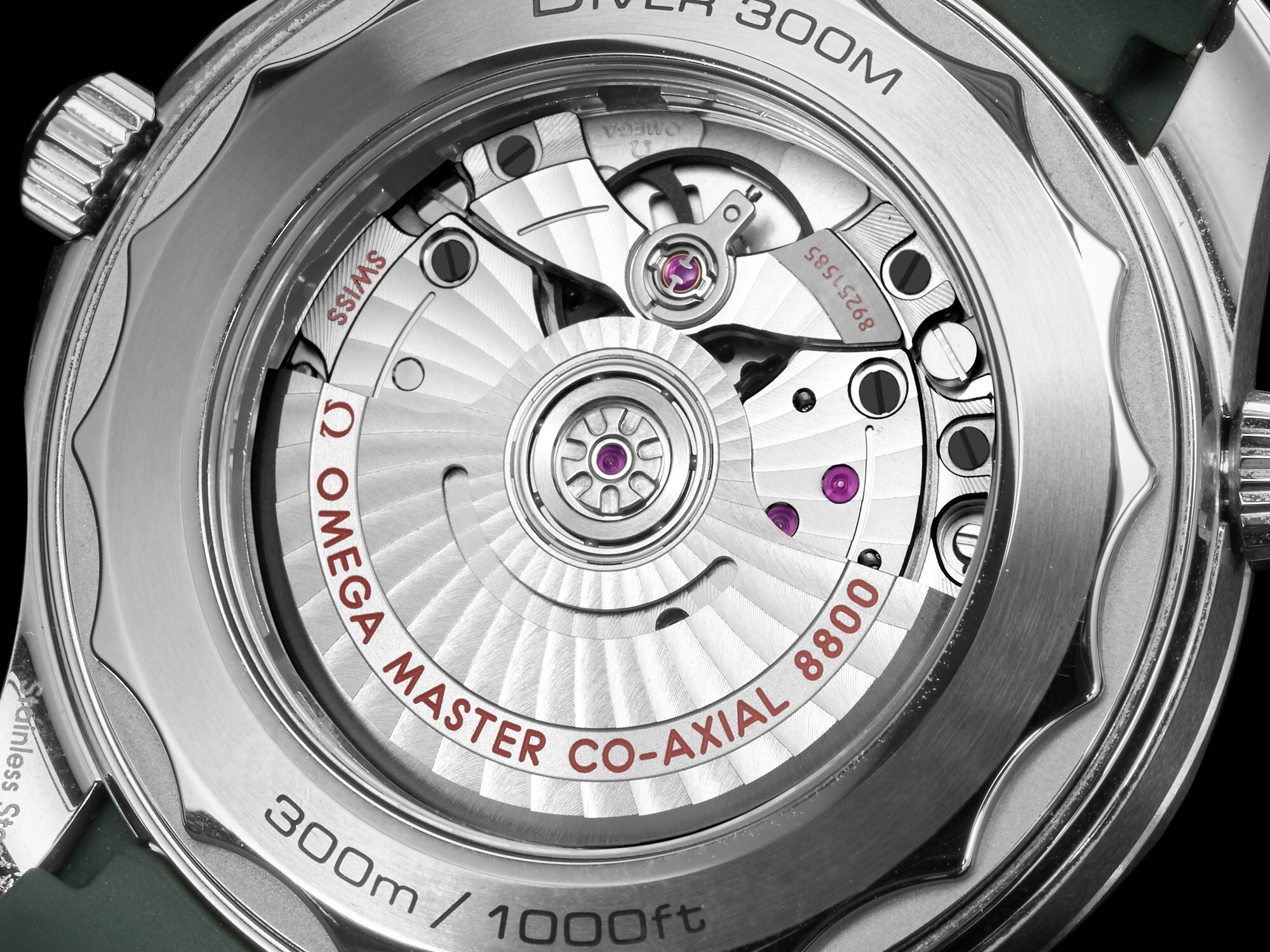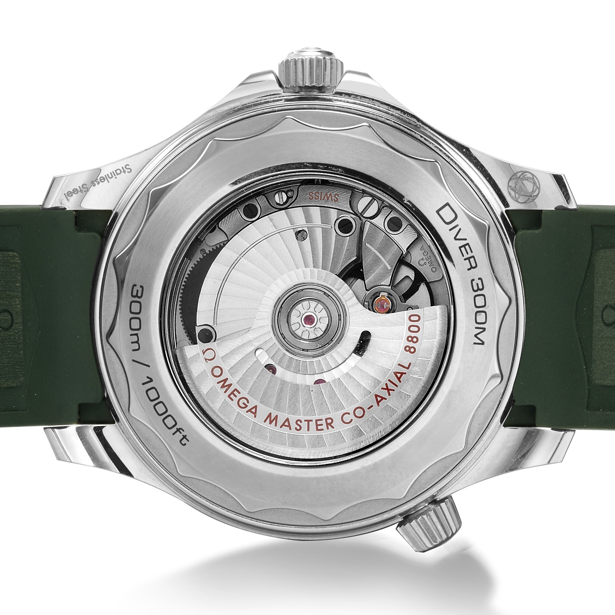 Stainless steel case, diameter 42mm. Ceramic bezel. Screw-down crown. Sapphire crystal. Green dial. Skeleton hands. OMEGA Co-Axial Master Chronometer Calibre 8800 automatic movement, 35 jewels, 25,200 vph, 55-hour power reserve. Rubber strap. Water-resistant to 300 meters.