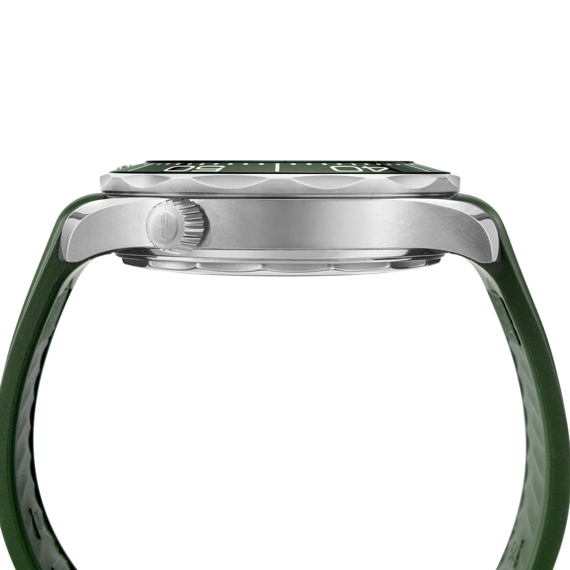 The 42mm stainless steel case combines brushed and polished finishes, offering a robust 300-meter water resistance. A helium escape valve, exclusive to professional dive watches, is positioned on the left side of the case at 10 o’clock. The dive bezel is crafted from green ceramic, known for its lightweight and scratch-resistant properties, with white enamel numerals ensuring excellent contrast.