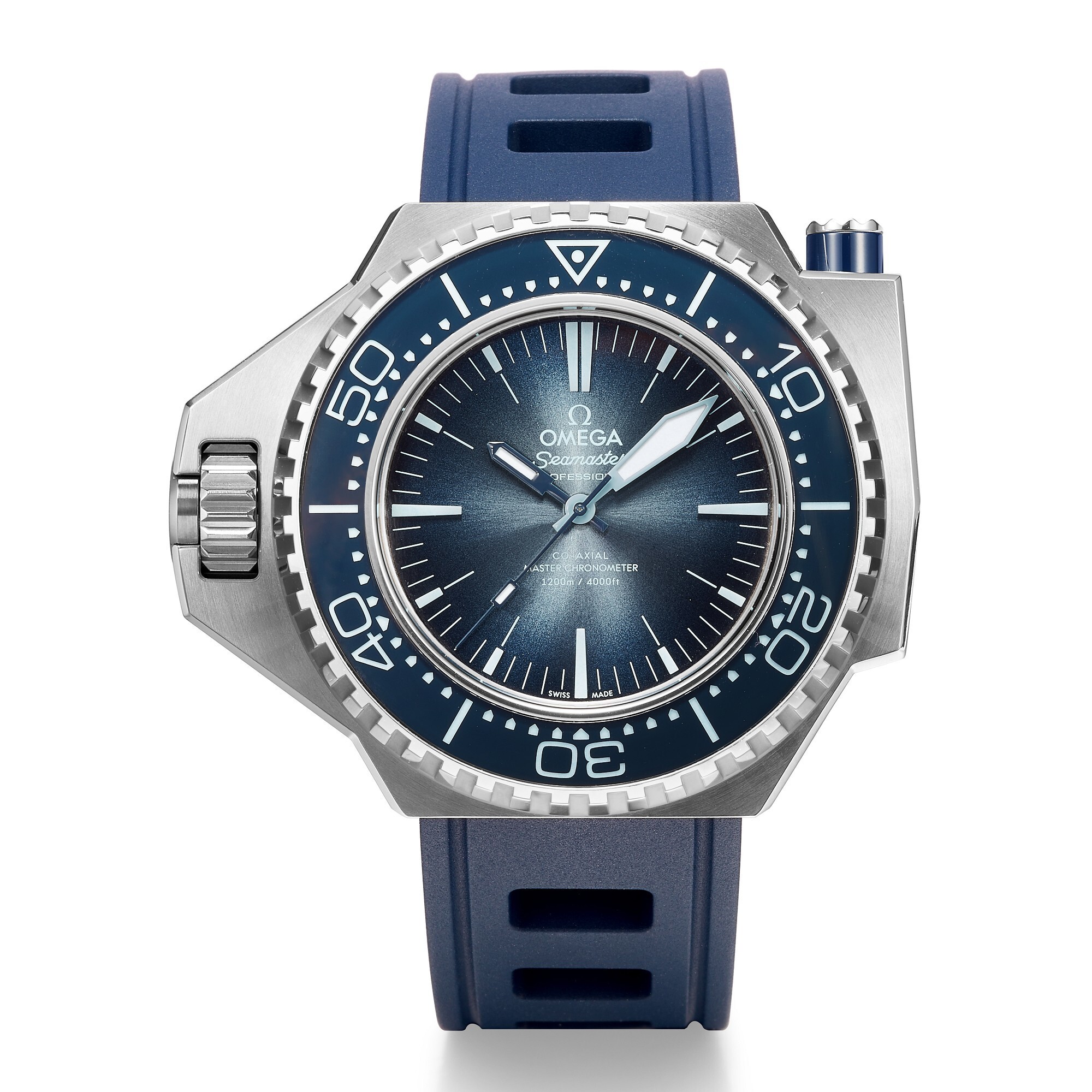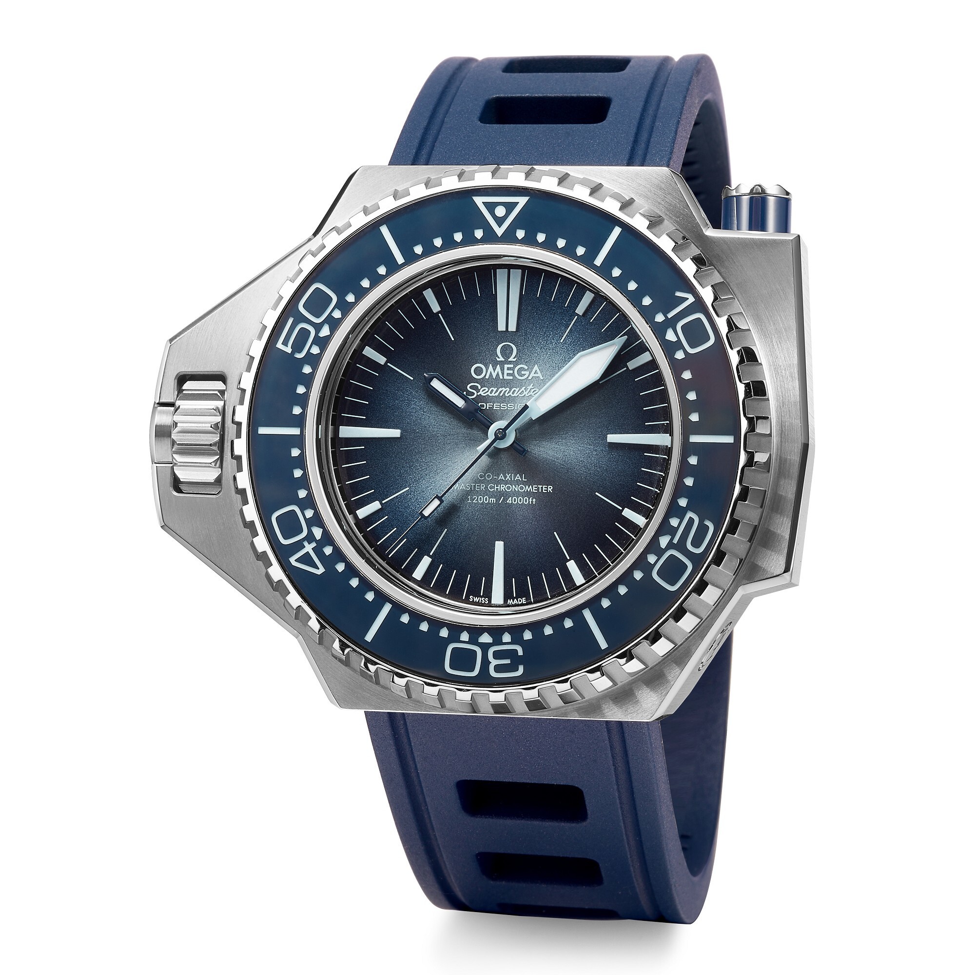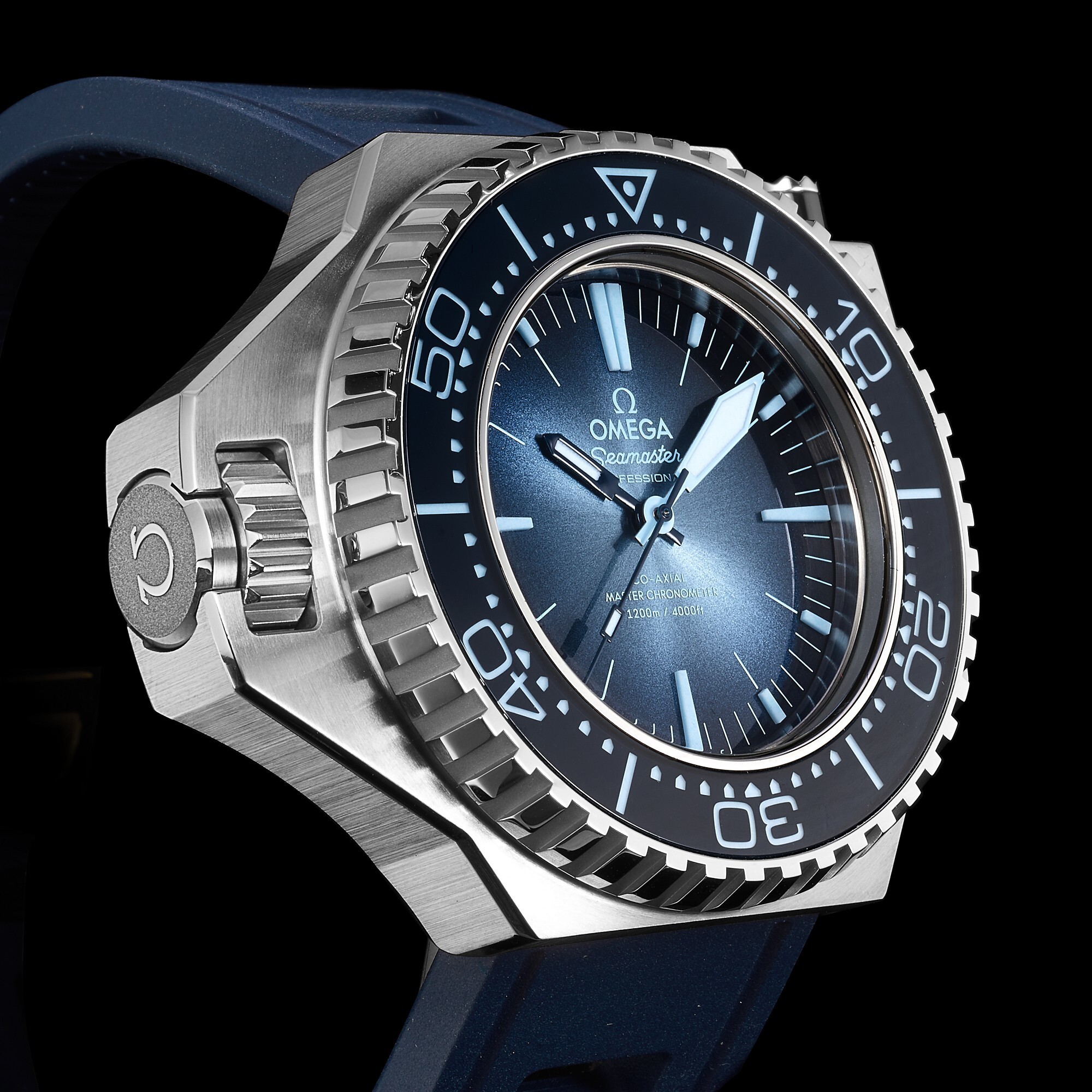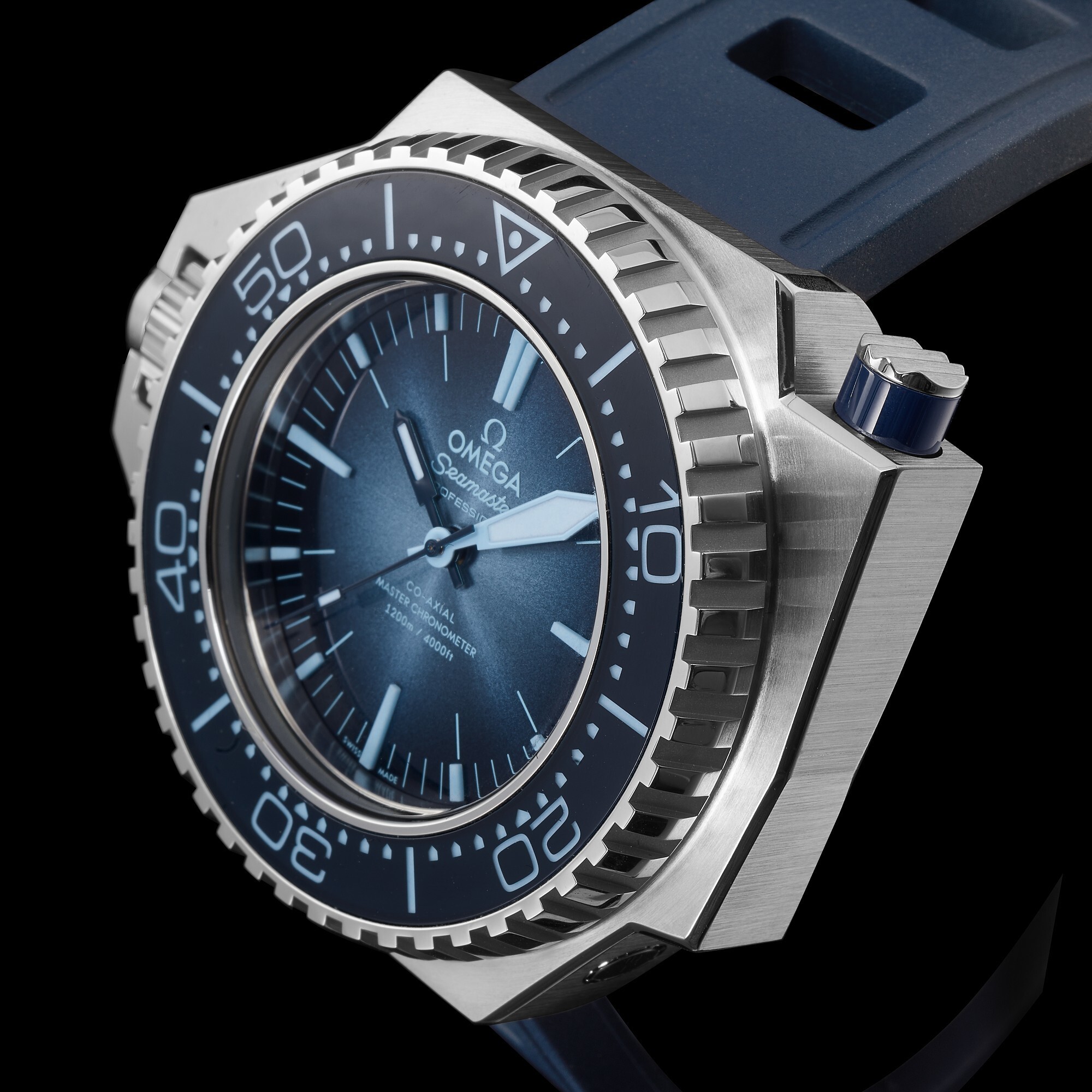 O-MEGASTEEL case, dimensions 55mm x 45mm, thickness 15.5mm, ceramic bezel, sapphire crystal, blue dial, lacquered hands, OMEGA 8912 automatic movement, frequency 25,200 vph, power reserve 60 hours, blue rubber strap, water resistance 1200 meters.