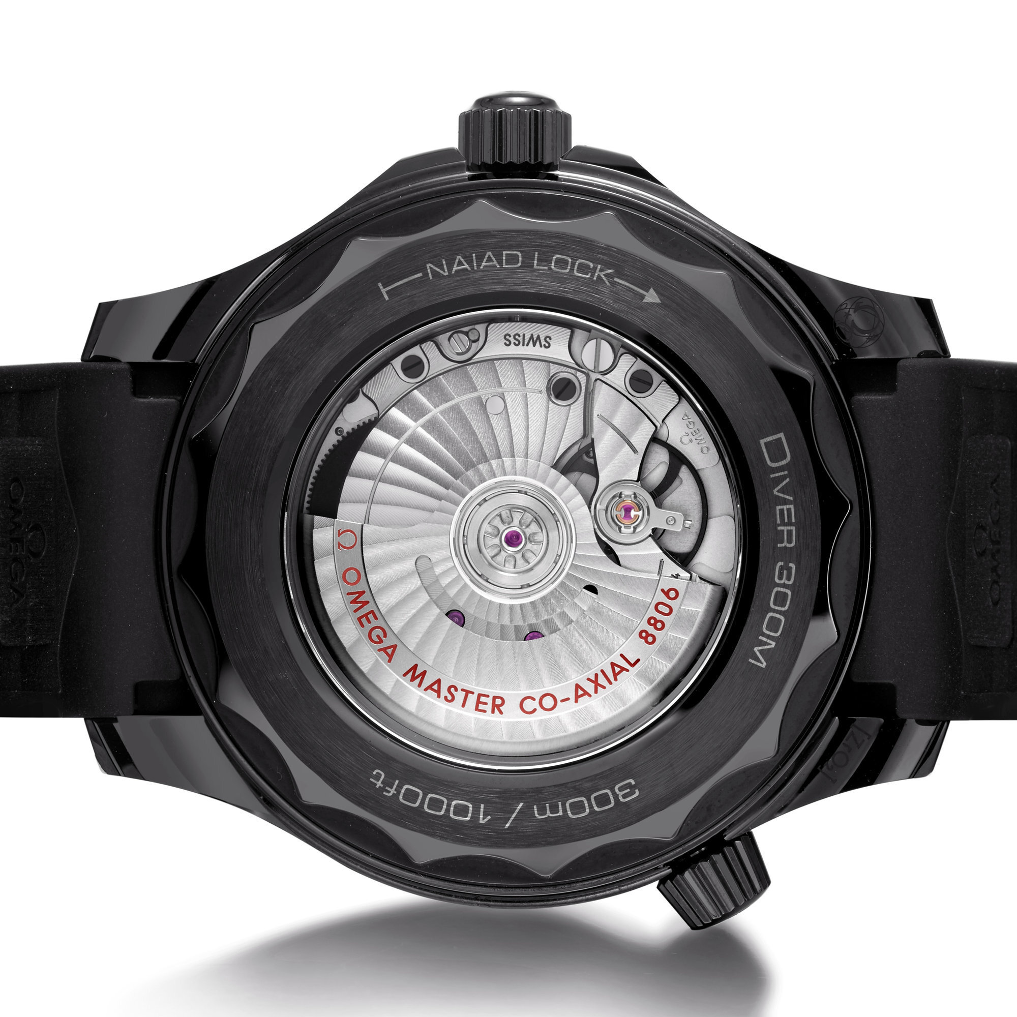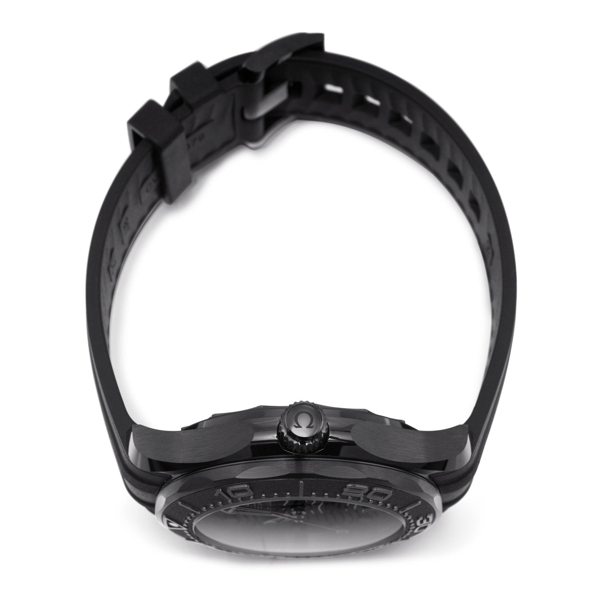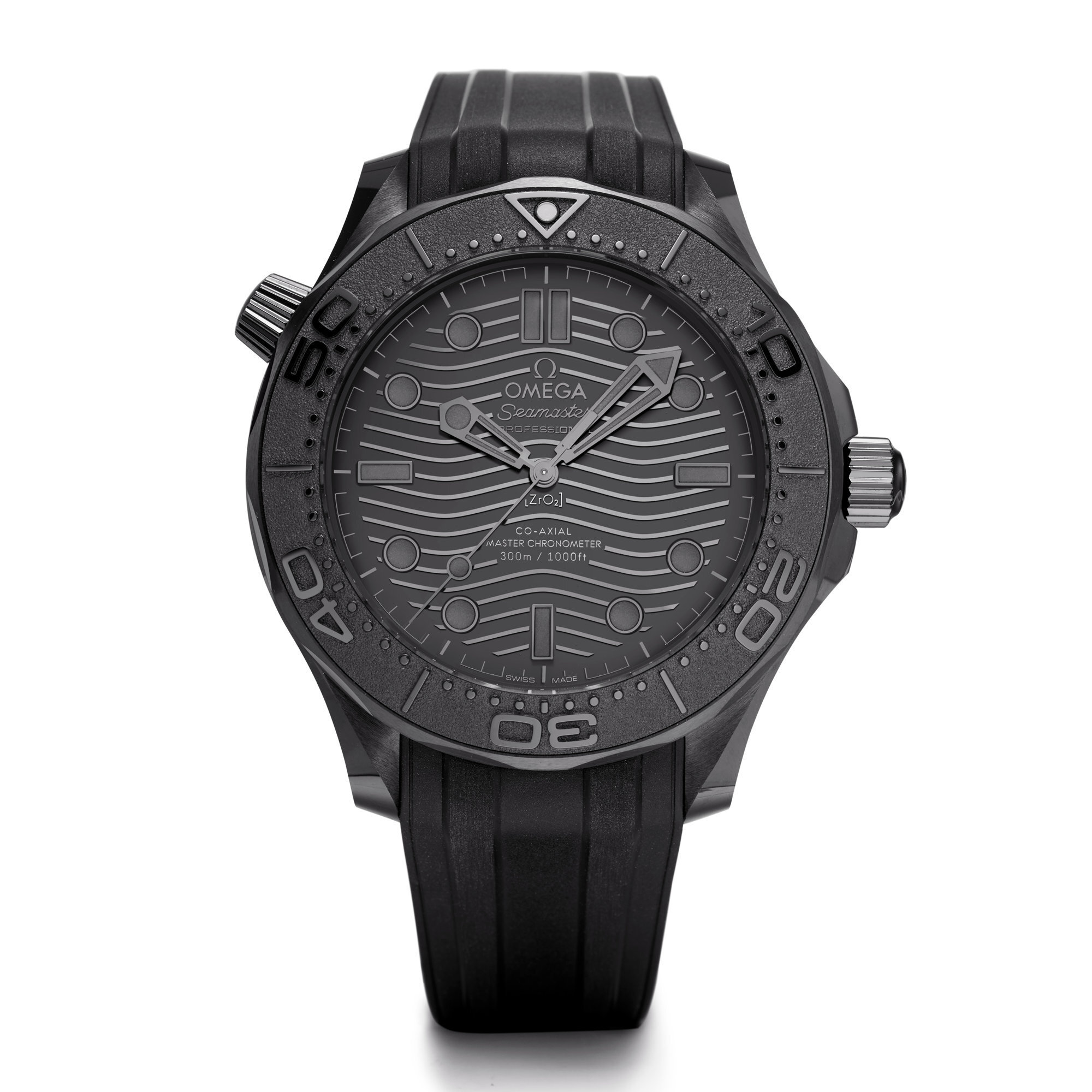 Case: Black ceramic (ZrO₂),Diameter: 43.5 mm,Thickness: 14.47 mm,Bezel: Black ceramic, unidirectional rotating,Crystal: Sapphire, anti-reflective treatment,Crown: Screw-in,Dial: Black ceramic with laser-engraved wave pattern,Hands: Skeletonized, filled with black Super-LumiNova (blue and green emission),Movement: OMEGA Co-Axial Master Chronometer Caliber 8806, automatic,Jewels: 35,Frequency: 25,200 vph (3.5 Hz),Power Reserve: 55 hours,Strap: Black rubber strap with ceramic buckle,Water Resistance: 300 meters.