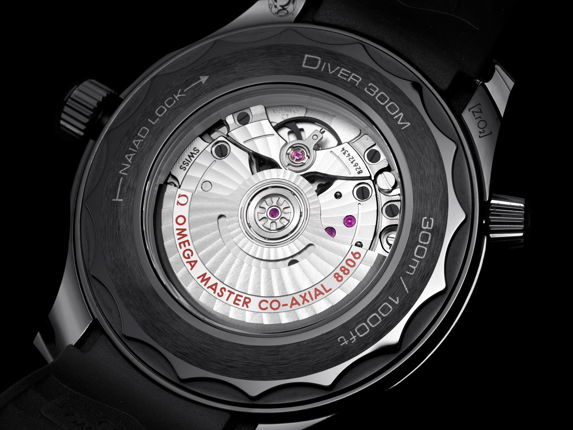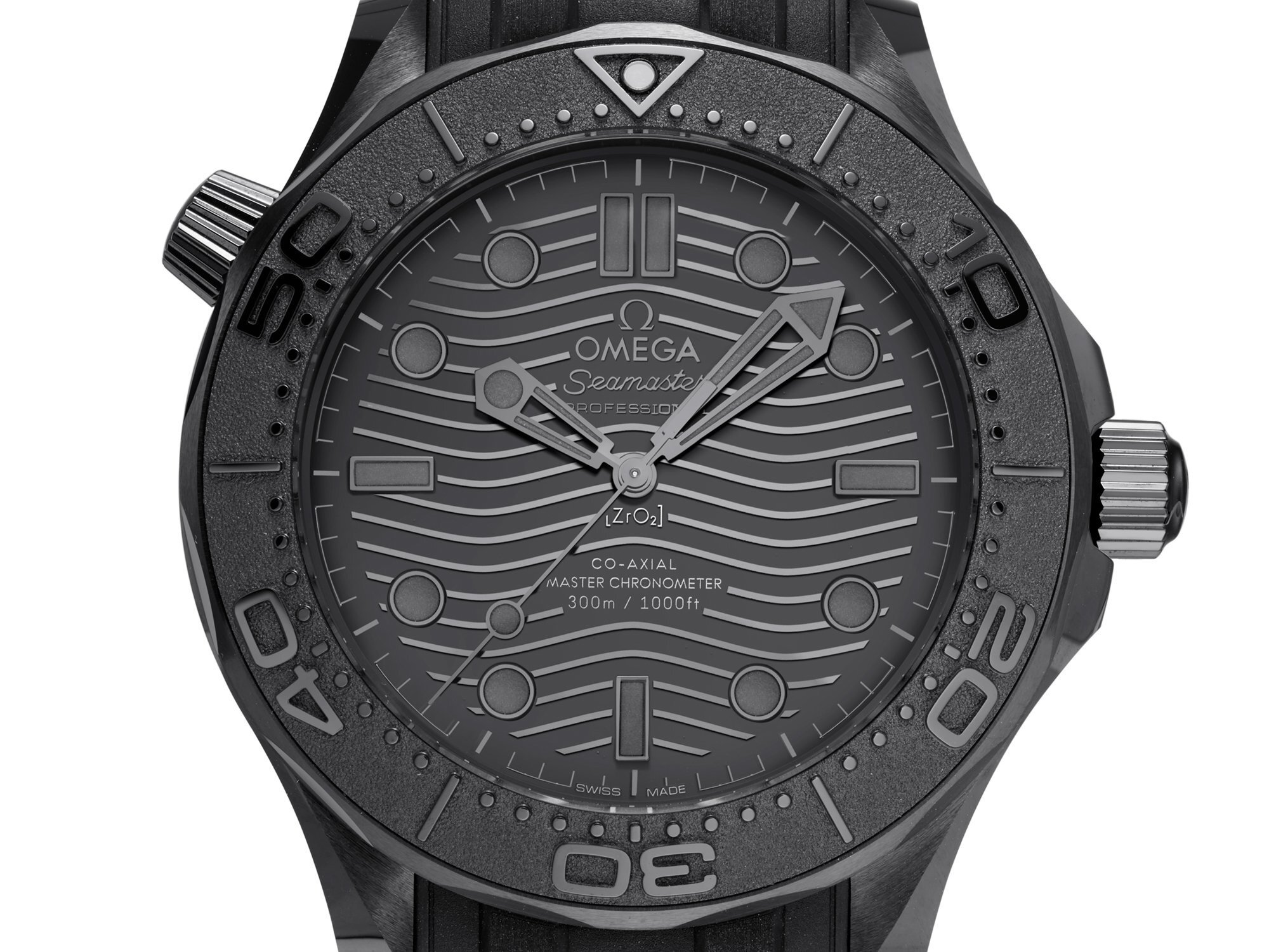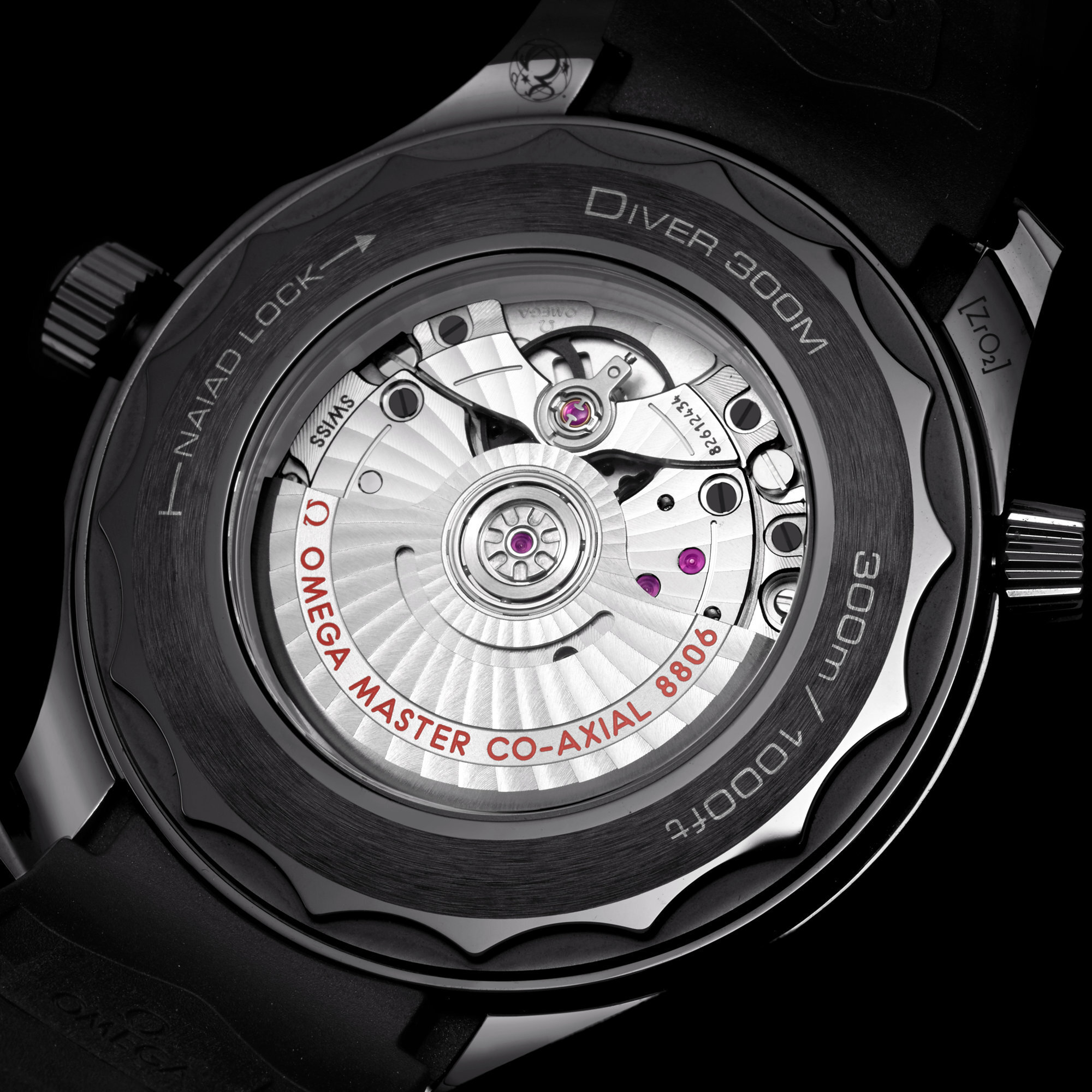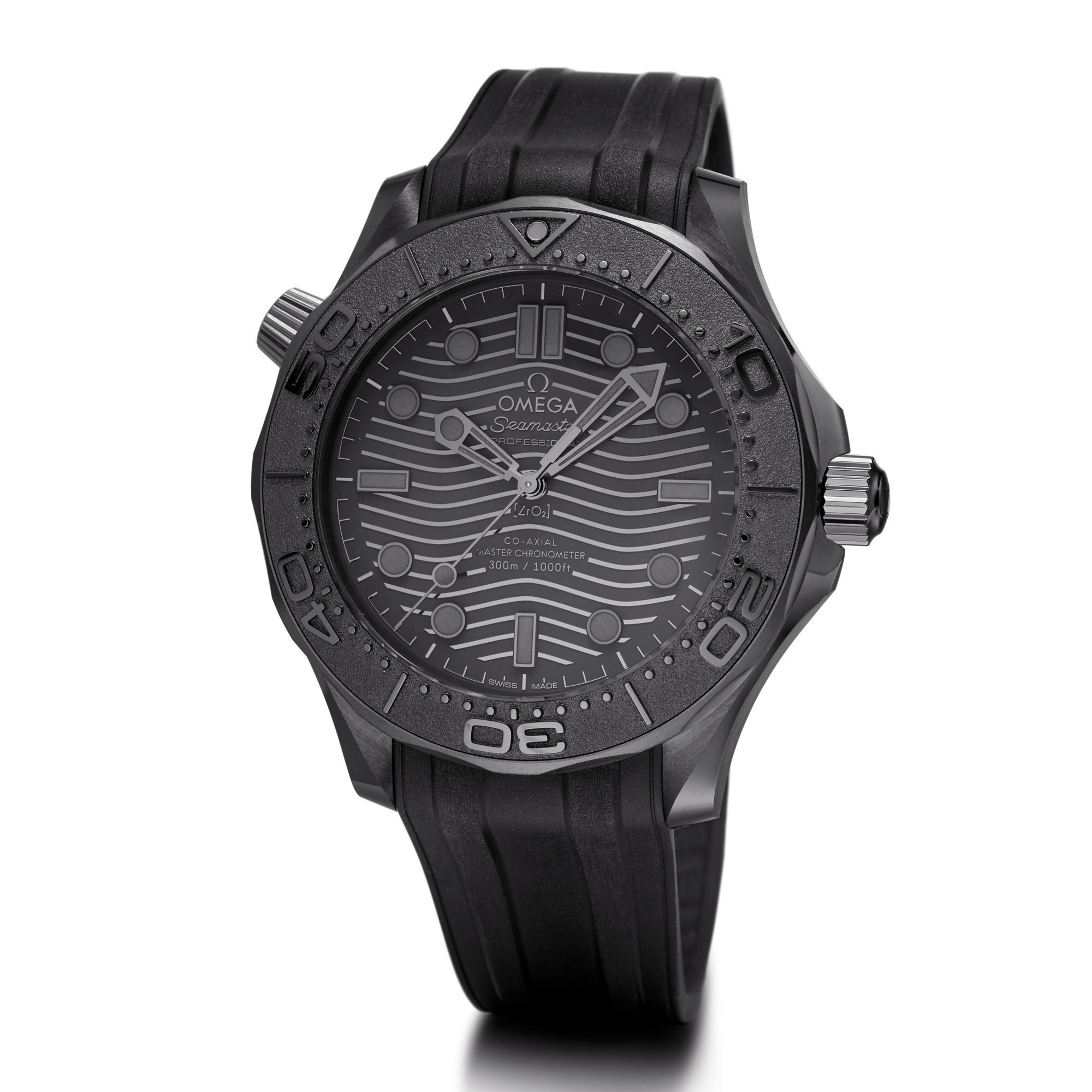 Case: Black ceramic (ZrO₂),Diameter: 43.5 mm,Thickness: 14.47 mm,Bezel: Black ceramic, unidirectional rotating,Crystal: Sapphire, anti-reflective treatment,Crown: Screw-in,Dial: Black ceramic with laser-engraved wave pattern,Hands: Skeletonized, filled with black Super-LumiNova (blue and green emission),Movement: OMEGA Co-Axial Master Chronometer Caliber 8806, automatic,Jewels: 35,Frequency: 25,200 vph (3.5 Hz),Power Reserve: 55 hours,Strap: Black rubber strap with ceramic buckle,Water Resistance: 300 meters.