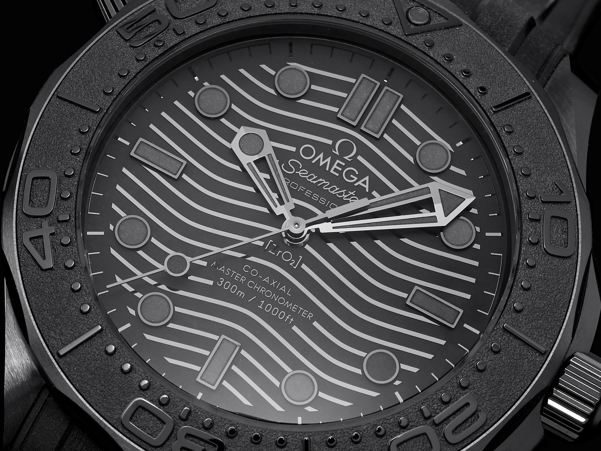 The black ceramic dial carries OMEGA’s signature laser-engraved wave motif, while the hour markers and skeletonized hands are filled with black Super-LumiNova. Under daylight, they appear grey-black, but in darkness they emit a vivid glow — blue for the hour hand and indices, and green for the minute hand and dive-scale dot, ensuring clear legibility underwater.
