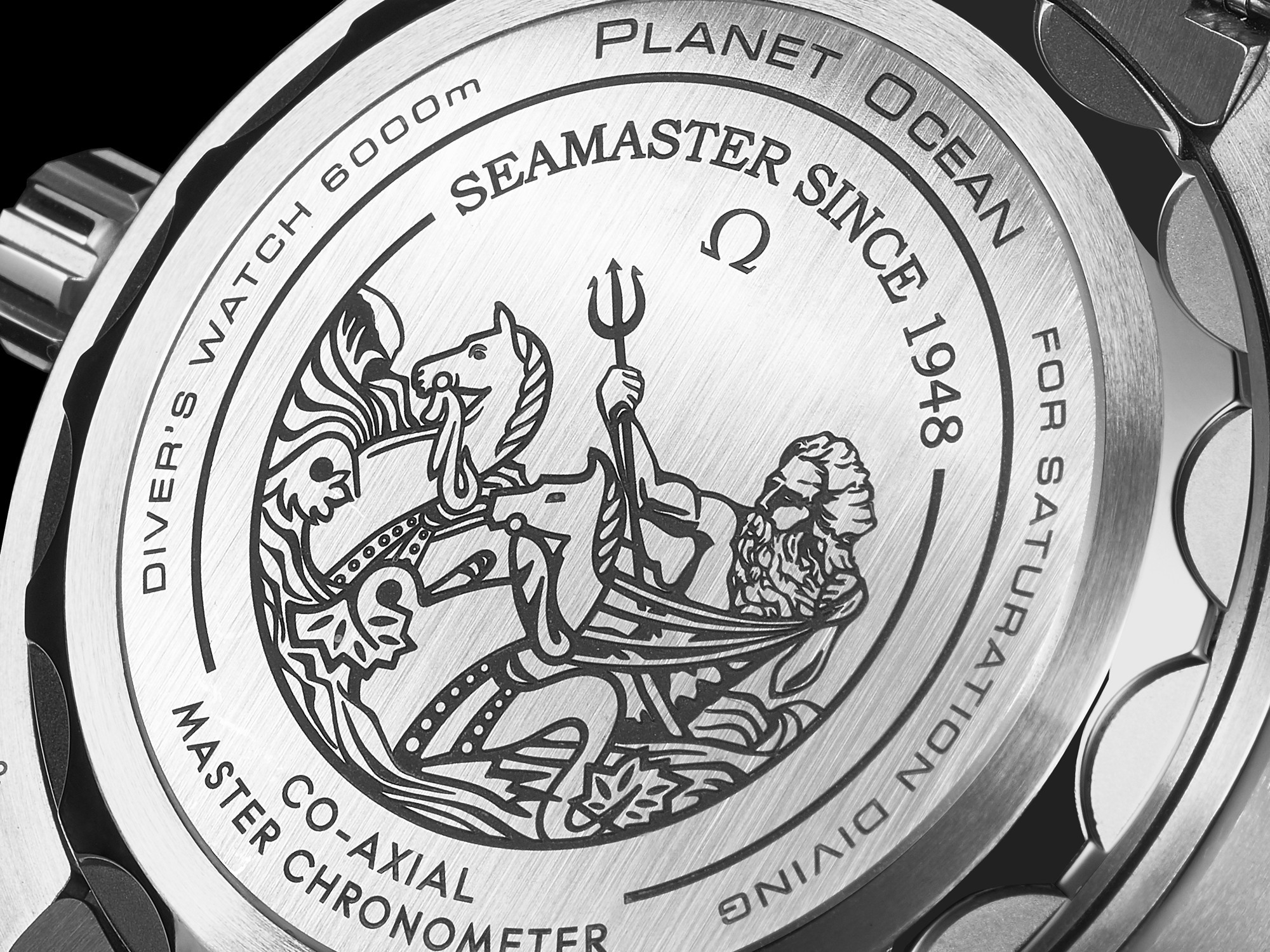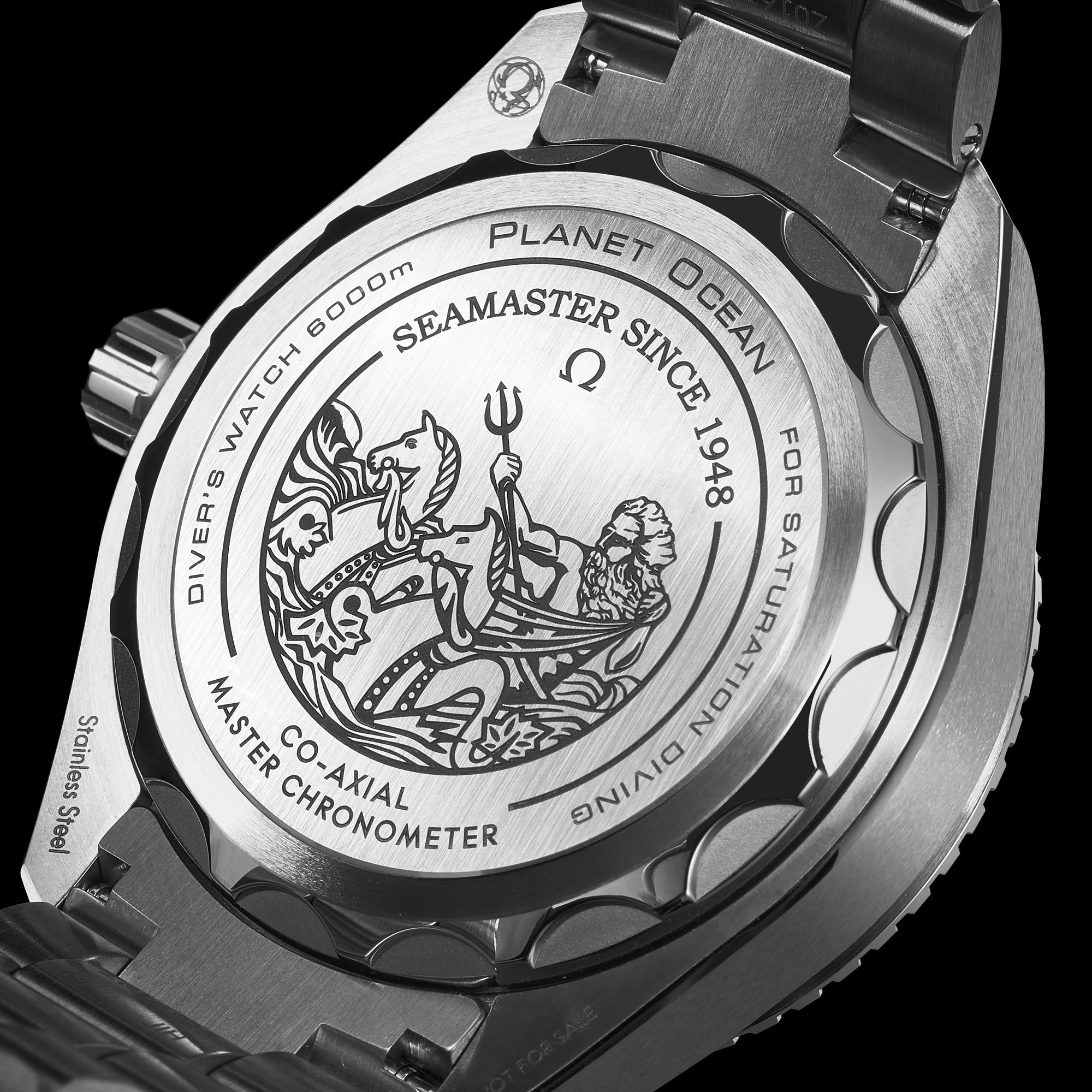 Powering the watch is the OMEGA Co-Axial Master Chronometer Calibre 8912, an automatic movement beating at 25,200 vph with a 60-hour power reserve provided by twin barrels. Turning the watch over reveals an engraved Poseidon and seahorse medallion—one seahorse representing OMEGA’s original 1956 design and the other its modern emblem, symbolizing the Seamaster’s enduring legacy.
