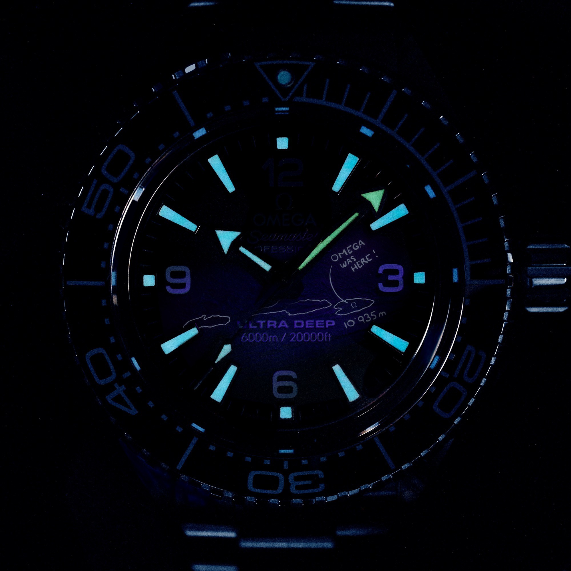 The deep blue gradient dial perfectly complements the watch’s deep-sea theme, exuding a subtle sense of fluid depth. Under ultraviolet light, the dial reveals the Challenger Deep topographic map, along with the inscriptions “OMEGA WAS HERE” and “10,935 m”, commemorating the Ultra Deep’s 2019 world-record dive. The hour markers are coated in a new light-blue Super-LumiNova, which emits a striking blue glow in the dark
