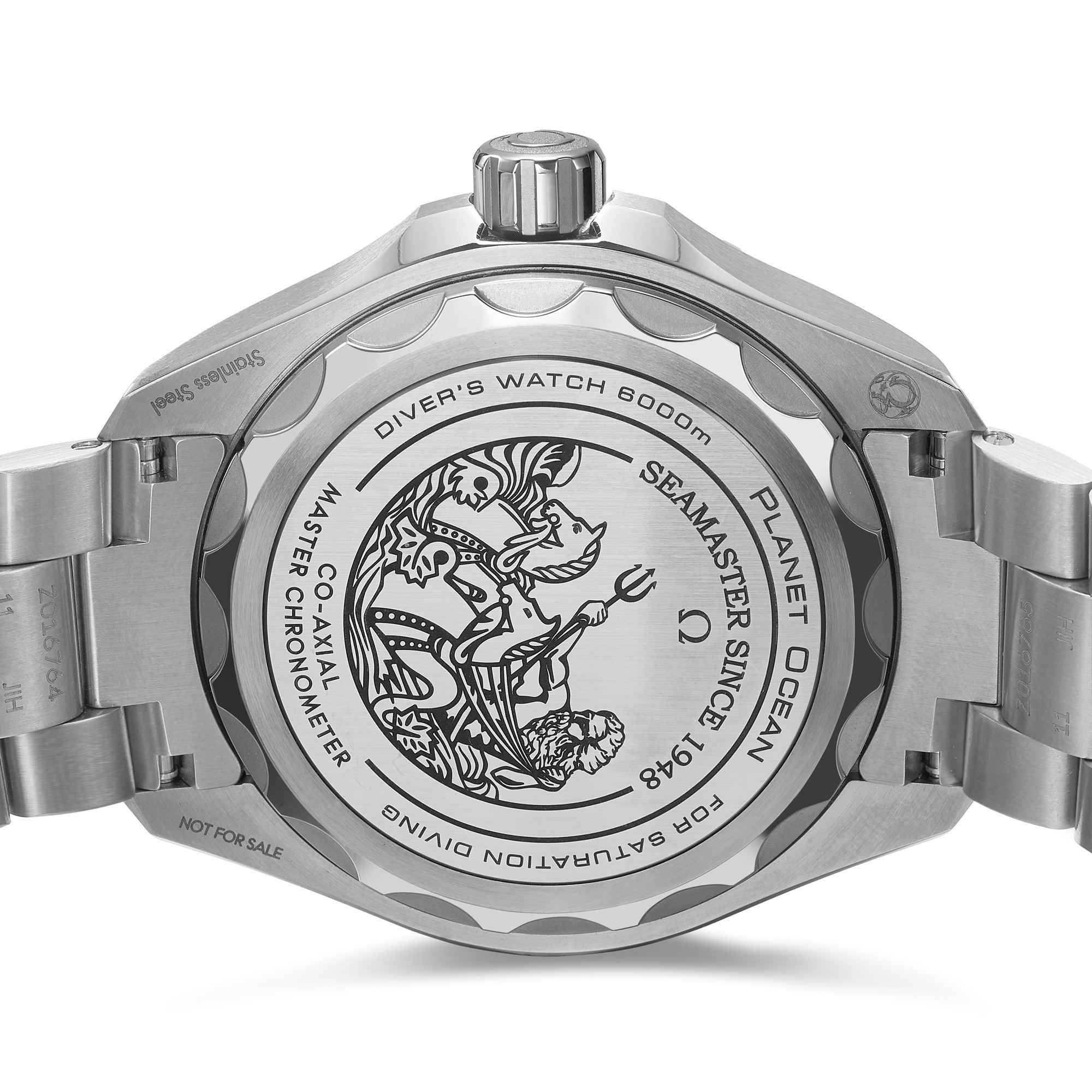Powering the watch is the OMEGA Co-Axial Master Chronometer Calibre 8912, an automatic movement beating at 25,200 vph with a 60-hour power reserve provided by twin barrels. Turning the watch over reveals an engraved Poseidon and seahorse medallion—one seahorse representing OMEGA’s original 1956 design and the other its modern emblem, symbolizing the Seamaster’s enduring legacy.