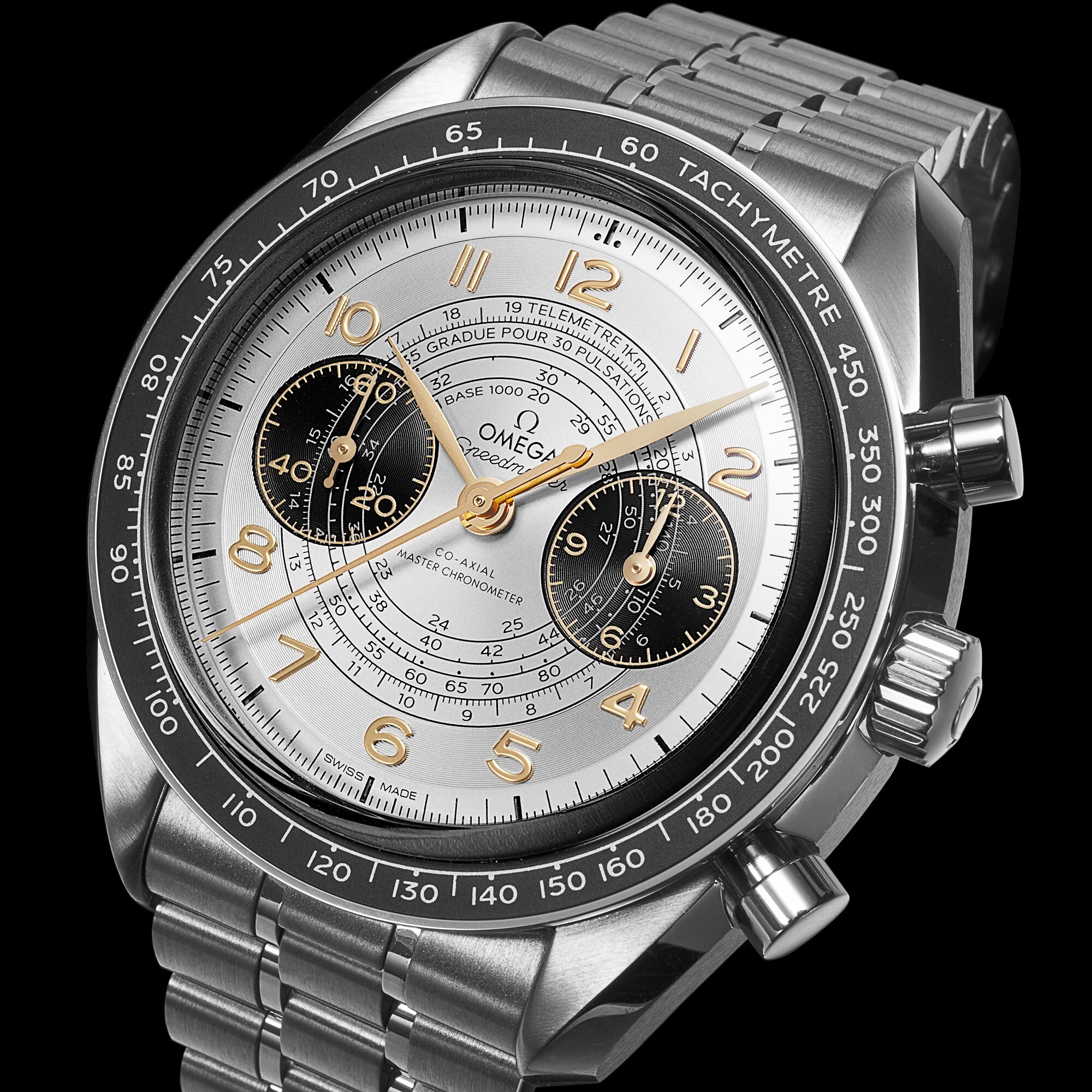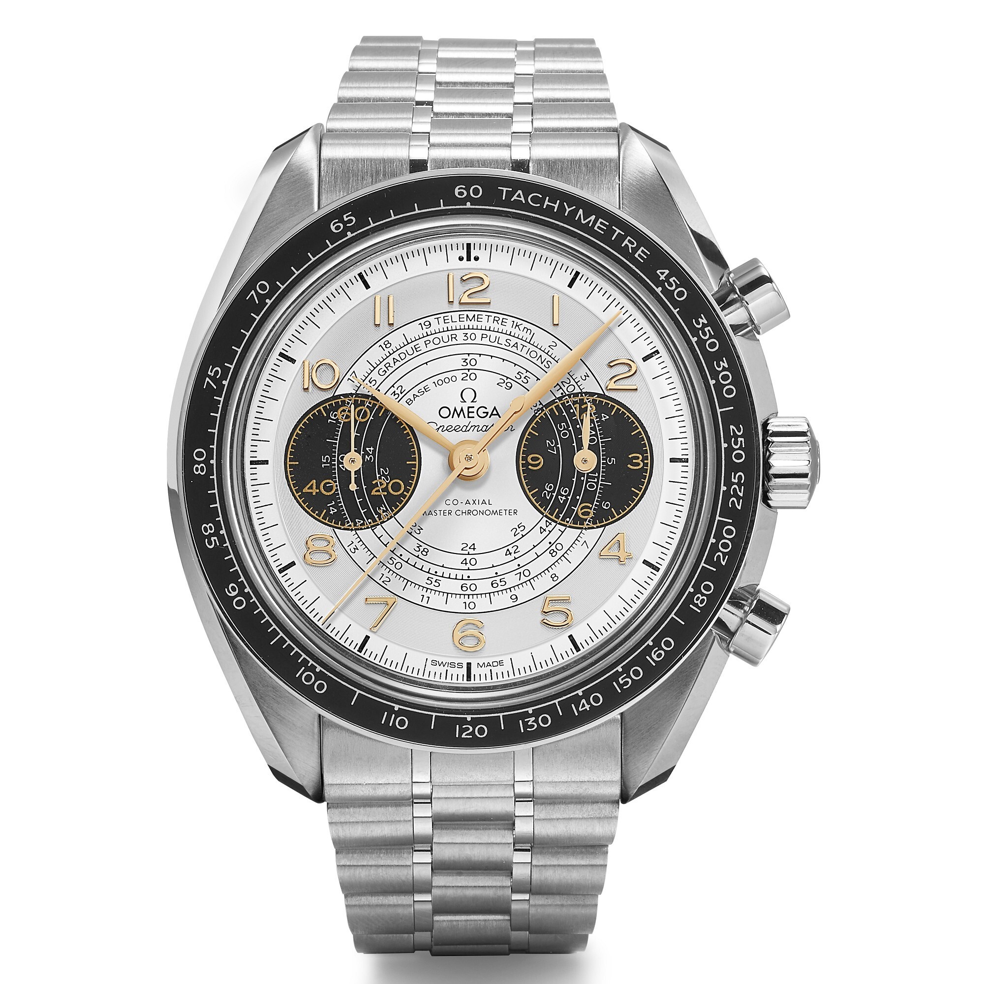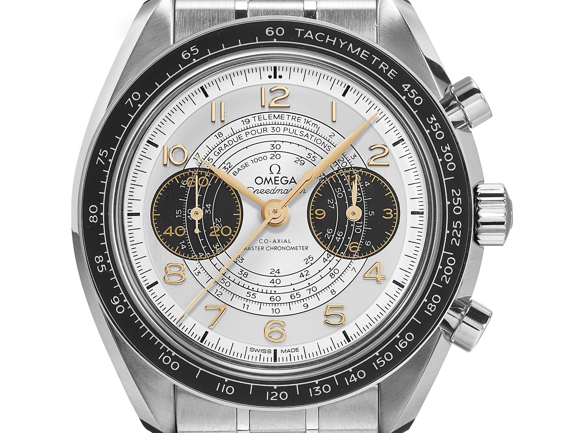 The silver dial retains the classic Chronoscope layout with two sub-dials and three concentric graduated scales. The sub-dial at 3 o’clock is a 12-hour counter, while the one at 9 o’clock is a small seconds dial. The three concentric scales are respectively for: telemeter, pulsations (typically 15/30 pulses), and tachymeter (20-60 units/hour), offering the three most essential functions of a professional chronograph.