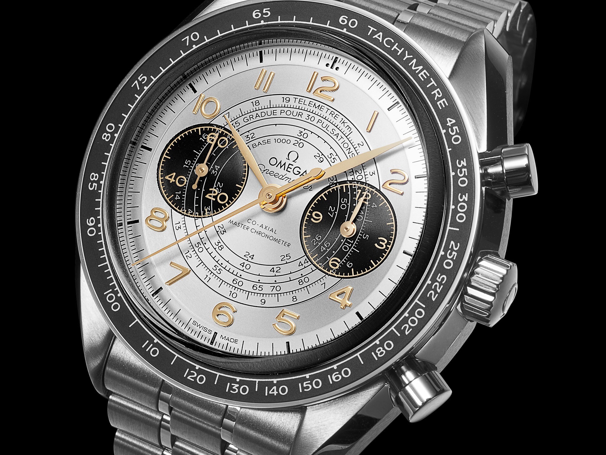 The new model features a 43mm case with a slim thickness of just 13mm, ensuring a comfortable wearing experience. The stainless steel case, crown, and pushers are mirror-polished, creating a subtle contrast with the satin-brushed lugs. The black anodized aluminum bezel is engraved with a tachymeter scale (60-450 units/hour).