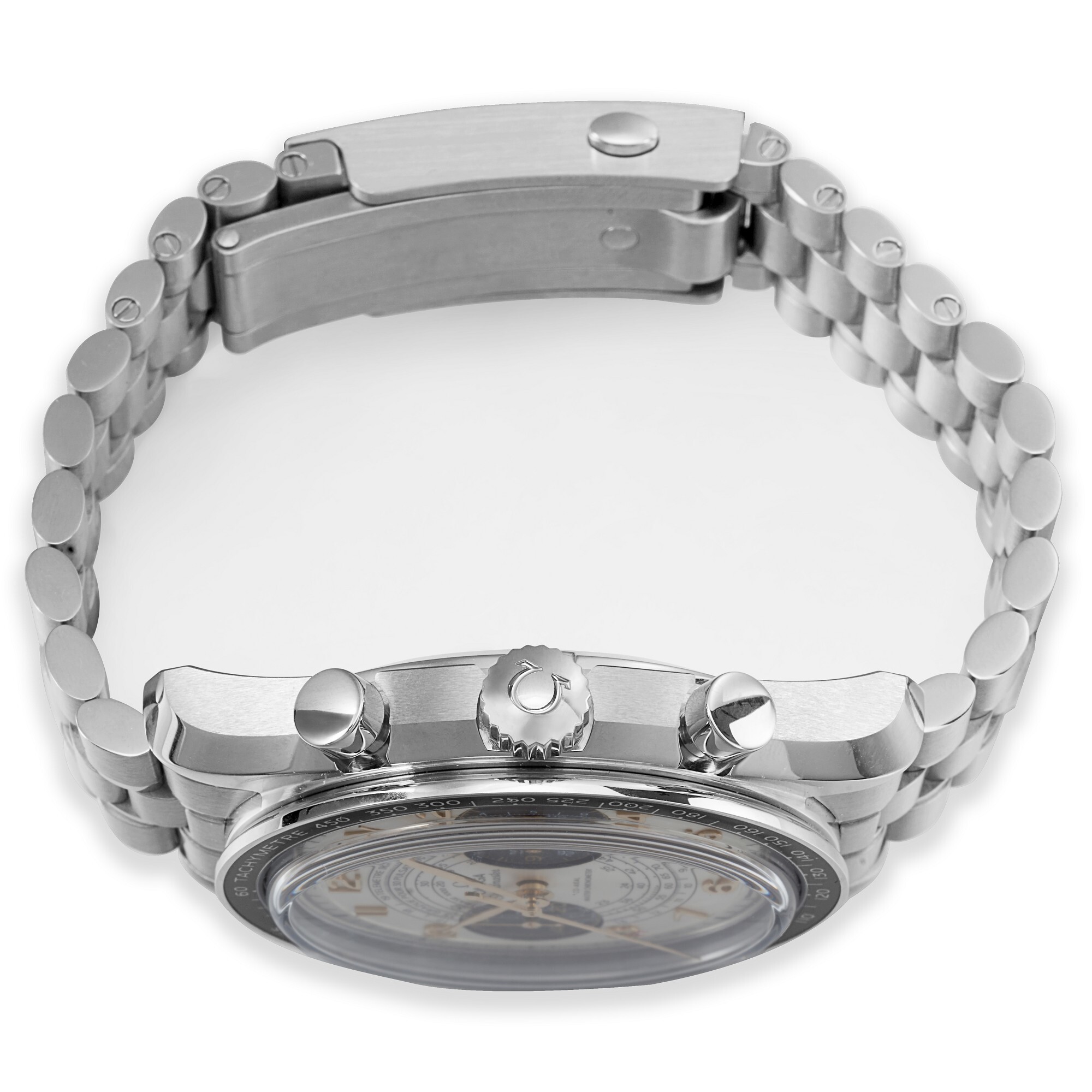 Stainless steel case, diameter 43mm, thickness 13mm, black anodized aluminum bezel, transparent sapphire crystal, silver dial, leaf-shaped hands, OMEGA 9908 manual-winding movement, 44 jewels, frequency 28,800 vph, power reserve 60 hours, stainless steel bracelet, water resistance 50 meters.