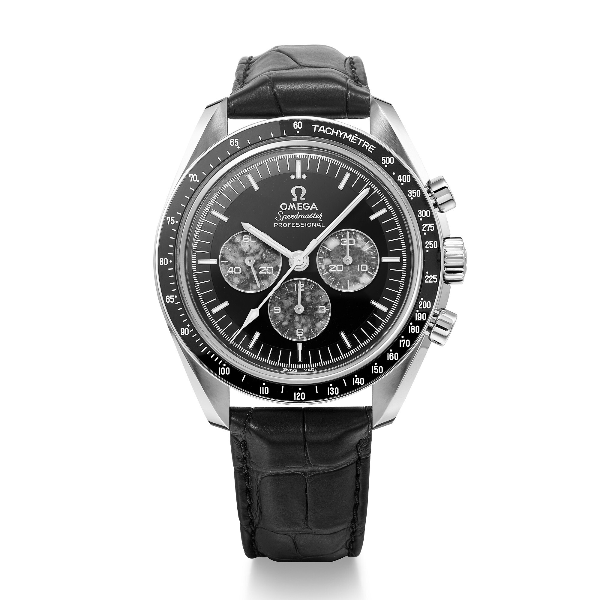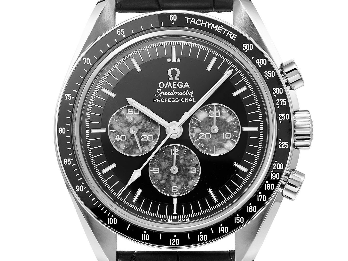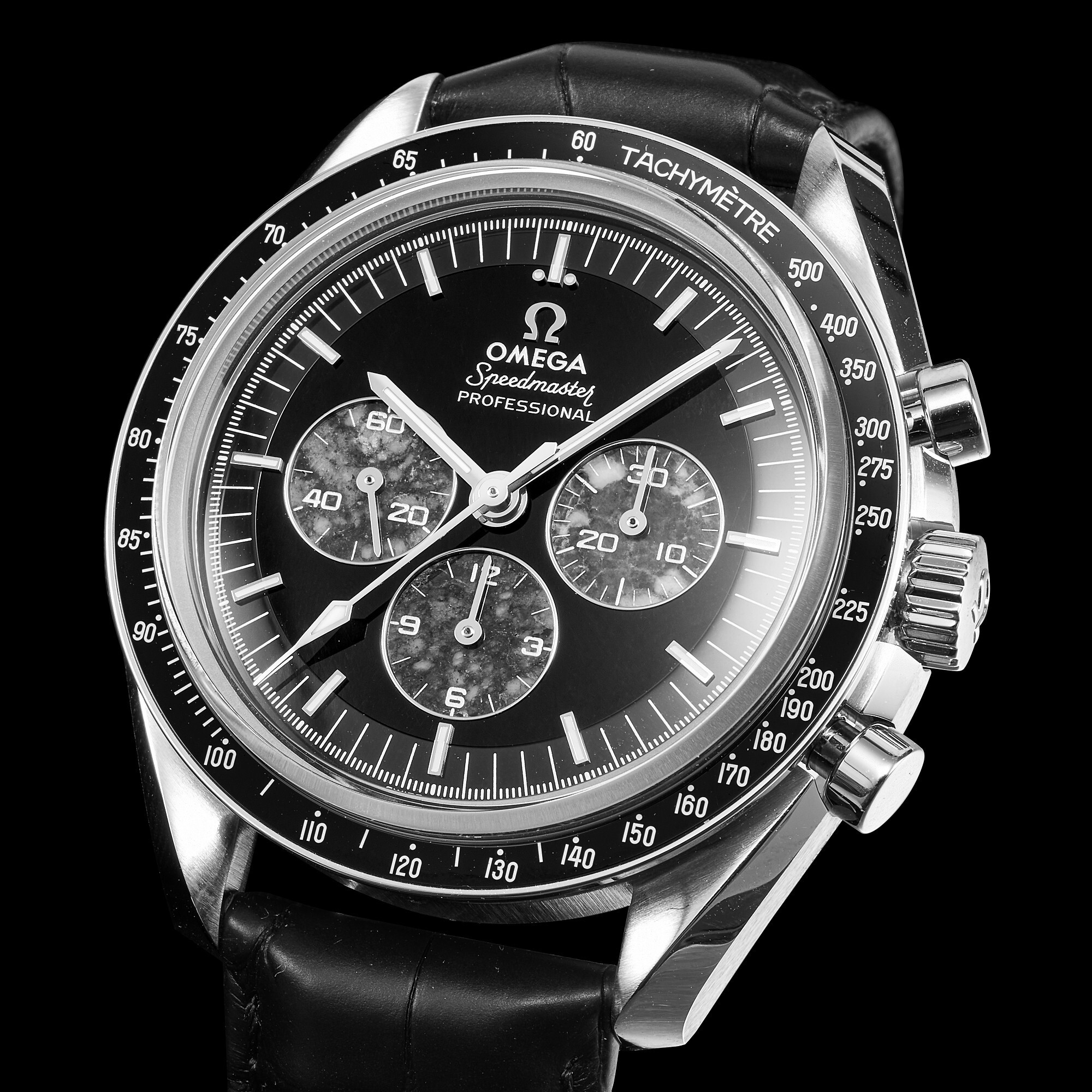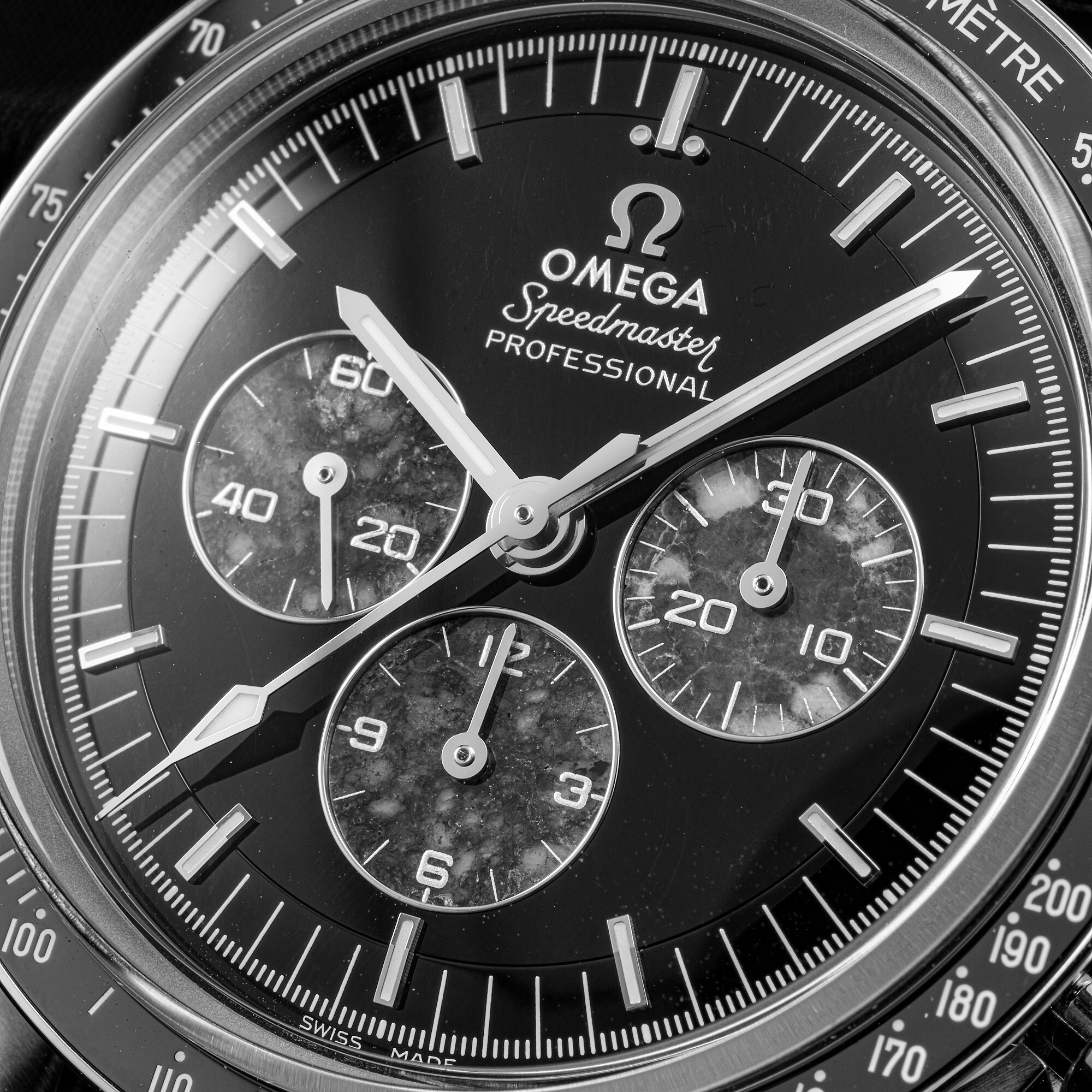 The black onyx dial is accented with platinum markers and hands, and retains the standard 3-6-9 layout of subdials: 3 o’clock: 30-minute chronograph counter, 6 o’clock: 12-hour chronograph counter, 9 o’clock: Small seconds counter. At 12 o’clock, the series logo uses a special early font with a long “r” shape, paying homage to the pre-1970s Speedmaster history. The subdials are each set with slices of lunar meteorite, each piece unique in its pattern, perfectly in line with the Moonwatch’s lunar theme.
