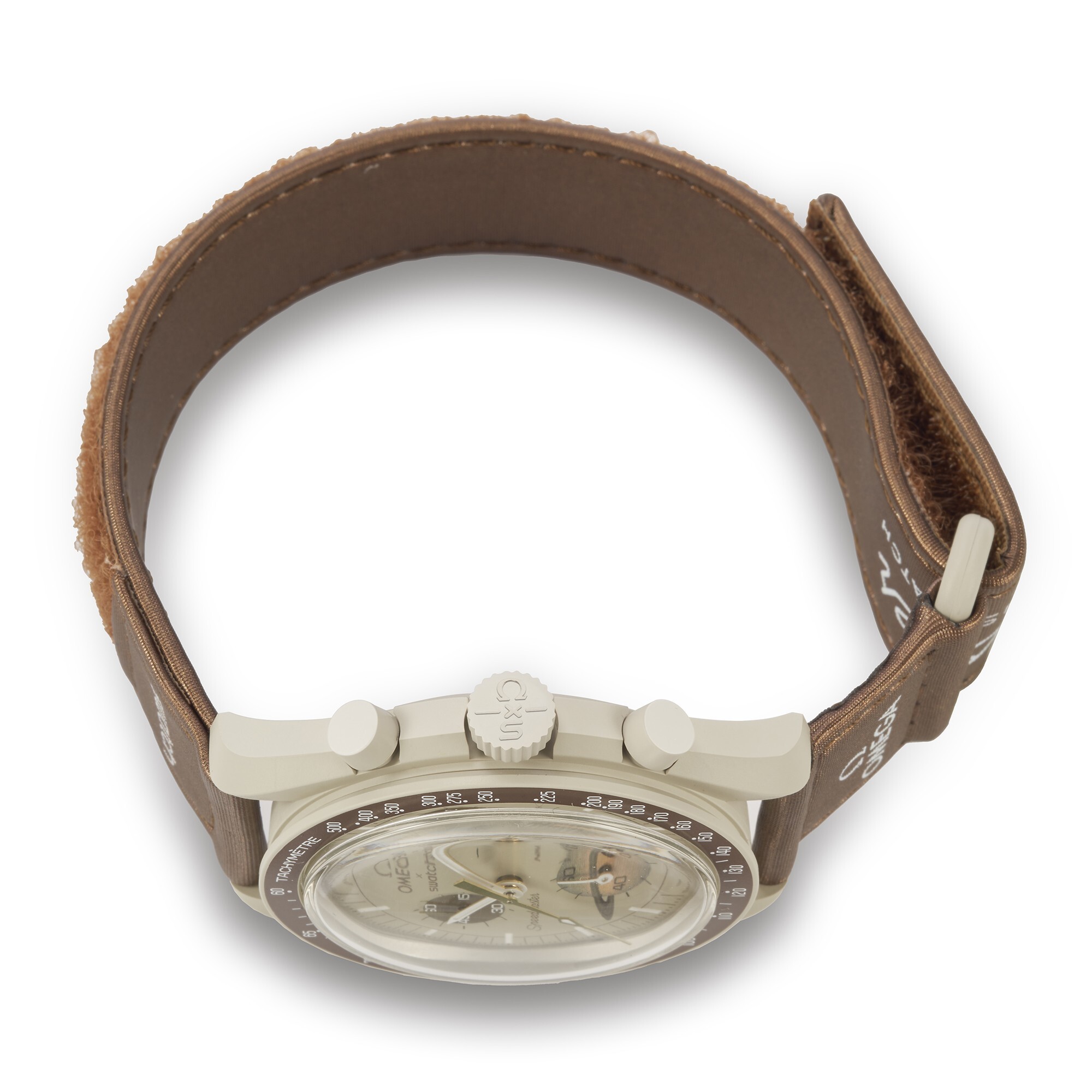 The case is crafted from innovative BIOCERAMIC material, a blend composed of two-thirds ceramic and one-third castor oil derivative. This makes the watch lightweight, wear-resistant, and eco-conscious. The 42mm case size is identical to the classic Moonwatch, with the lug profile and crown design also paying homage to the original. The tachymeter scale on the bezel notably continues the iconic “dot over 90” detail.
