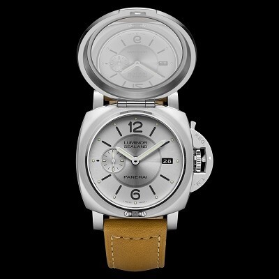 Housed in a 44mm brushed stainless steel case, the watch features a grey dial with a date display at 3 o’clock and a small seconds subdial at 9 o’clock. Inside beats the in-house P.9000 automatic movement, offering a 3-day power reserve (72 hours) and operating at 28,800 vibrations per hour. This was the first Sealand edition to feature Panerai’s fully in-house calibre, marking a step forward in the brand’s technical independence.