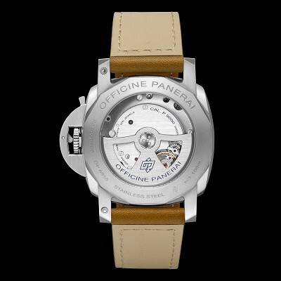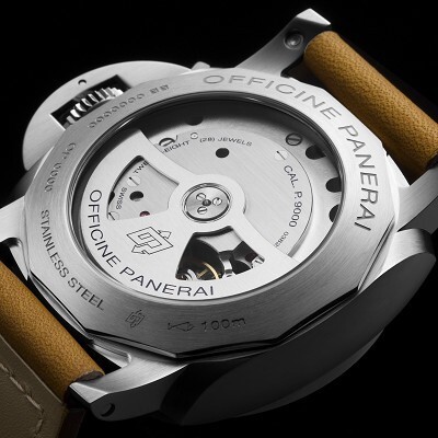 Brushed stainless steel case, 44mm diameter, polished steel cover, sapphire crystal front and back, brushed crown guard, grey dial, Panerai P.9000 automatic movement, 28 jewels, 28,800 vph, 3-day power reserve, leather strap, brushed steel buckle, water-resistant to 100m.