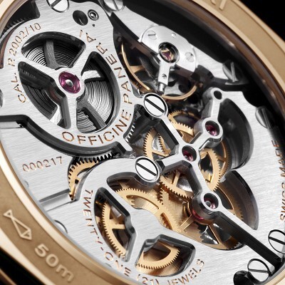 The movement inside is Panerai’s P.2002, with skeletonized bridges and a barrel that allow you to admire the balance spring’s rotation through the sapphire crystal caseback—a striking detail. Thanks to its three barrels, the power reserve lasts a remarkable 8 days, a tradition Panerai has maintained since 1940.