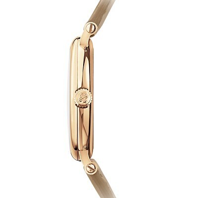 18K rose gold officer-style case, 34.6mm in diameter, 7.37mm in thickness, Curved sapphire crystal glass, Sapphire crystal case back, Powered by Caliber 240 ultra-thin automatic movement, 27 jewels, 21,600 vibrations per hour,Spiromax silicon hairspring, Gyromax silicon balance wheel, 22K gold rotor, 48-hour power reserve, Matte pearl beige alligator leather strap with square scales, 18K rose gold pin buckle, 18 K Rose gold pin buckle, Water resistance: 30 meters.