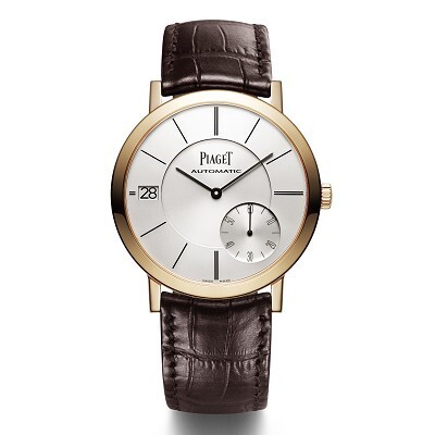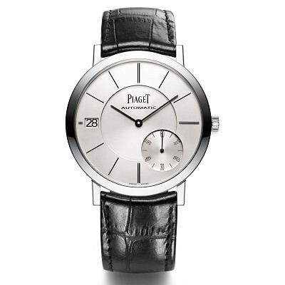 18K white gold case (also available in rose gold or rose gold with diamond bezel), 40mm diameter, 6.36mm thickness, sapphire crystal glass front and back, Piaget 1205P ultra-thin automatic movement, 3mm movement thickness, 21,600 vibrations per hour, 27 jewels, 44-hour power reserve, rose gold rotor, brown alligator leather strap, pin buckle.