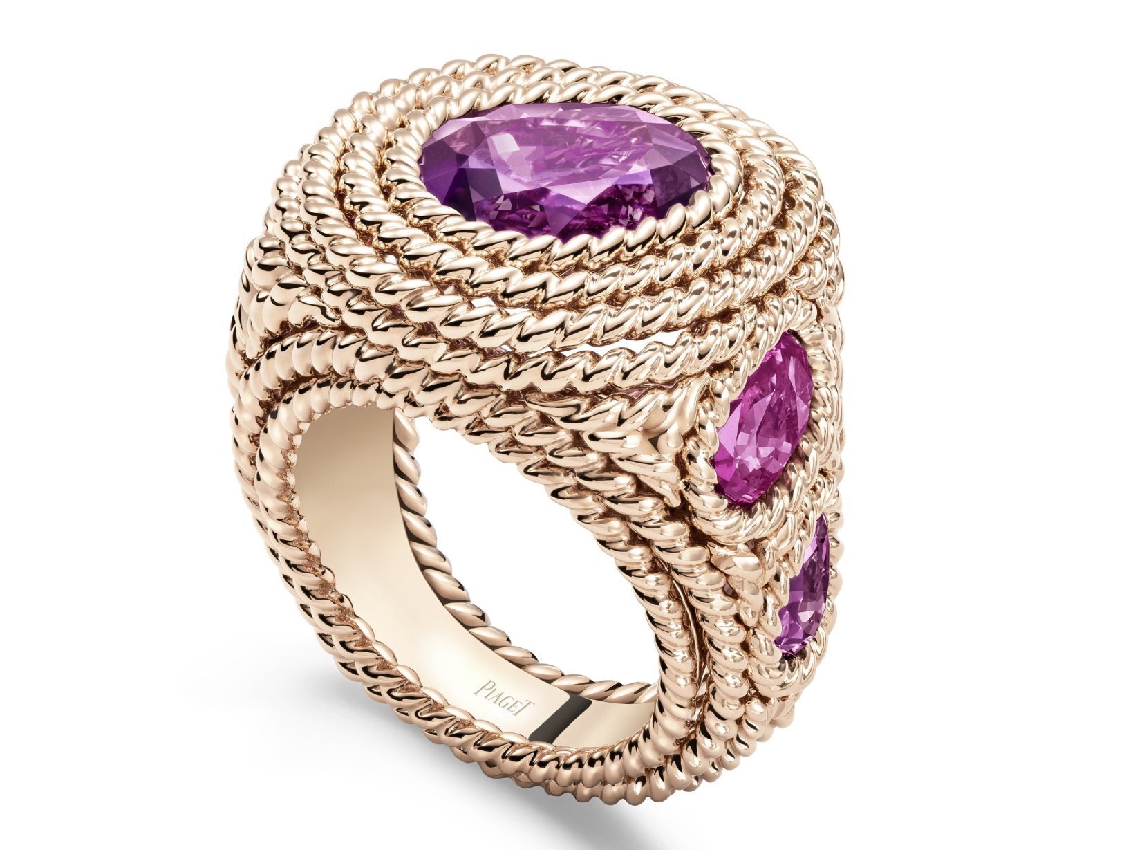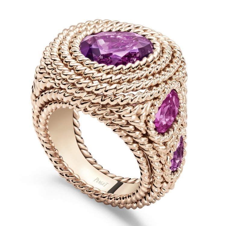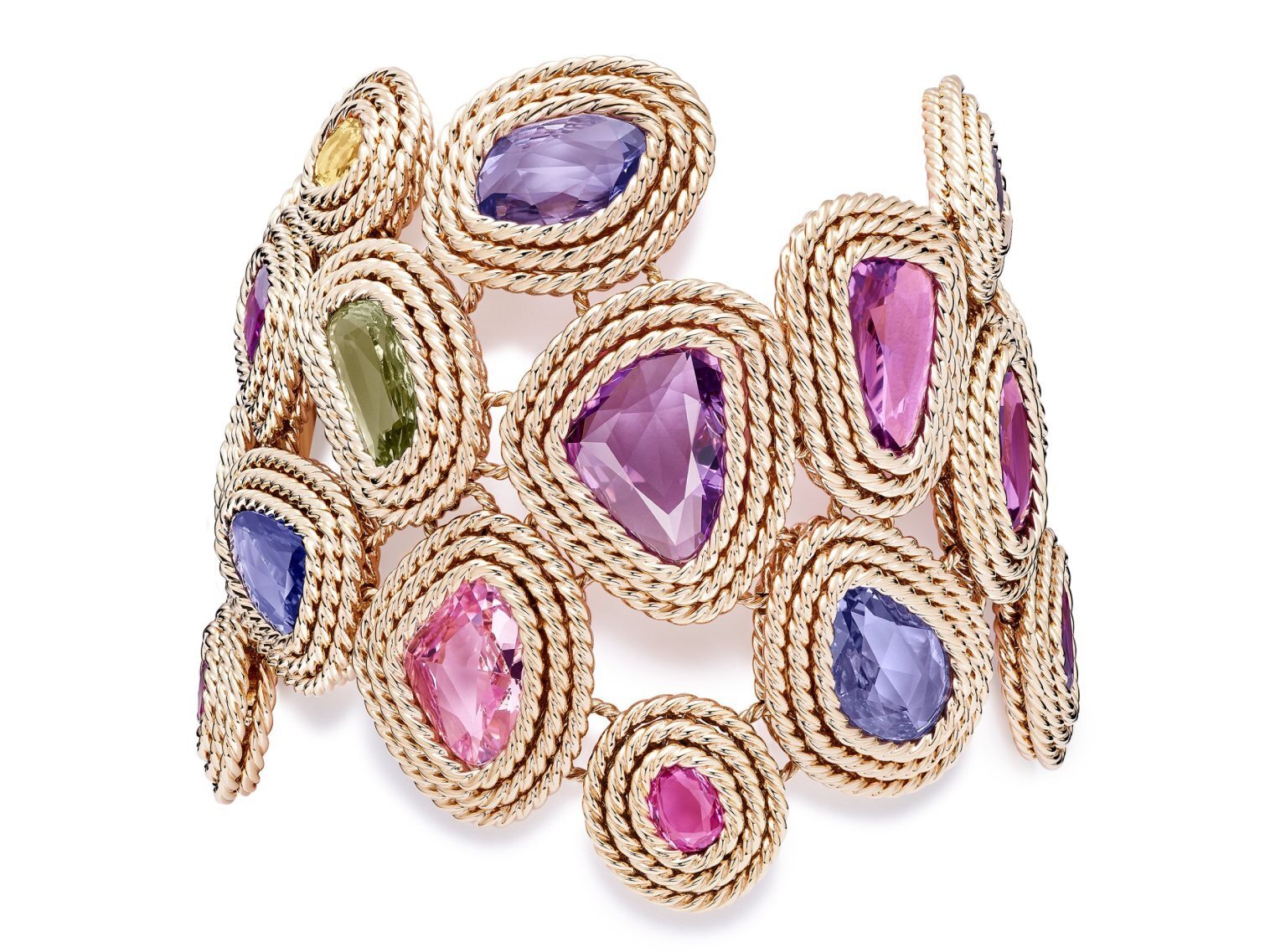 The bracelet features 26 rose-cut sapphires totaling 54.87 carats, encircled by three rows of twisted rose-gold cords that enhance the gemstones’ brilliance with radiant golden highlights.