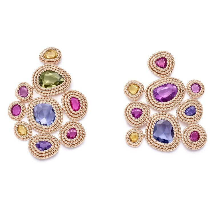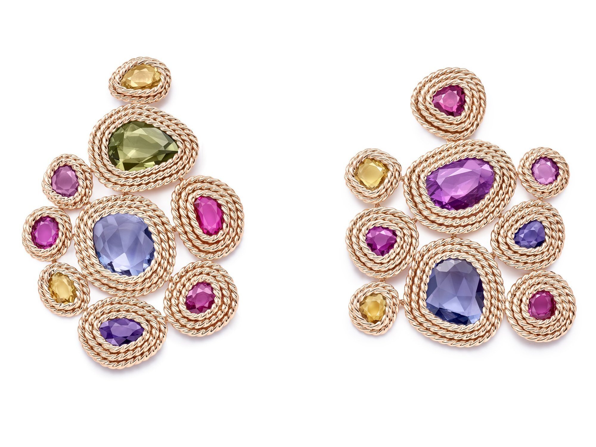 The earrings, set with 18 colored sapphires weighing approximately 21.18 carats, display an asymmetrical openwork design that conveys freedom, movement, and a touch of poetic elegance.
