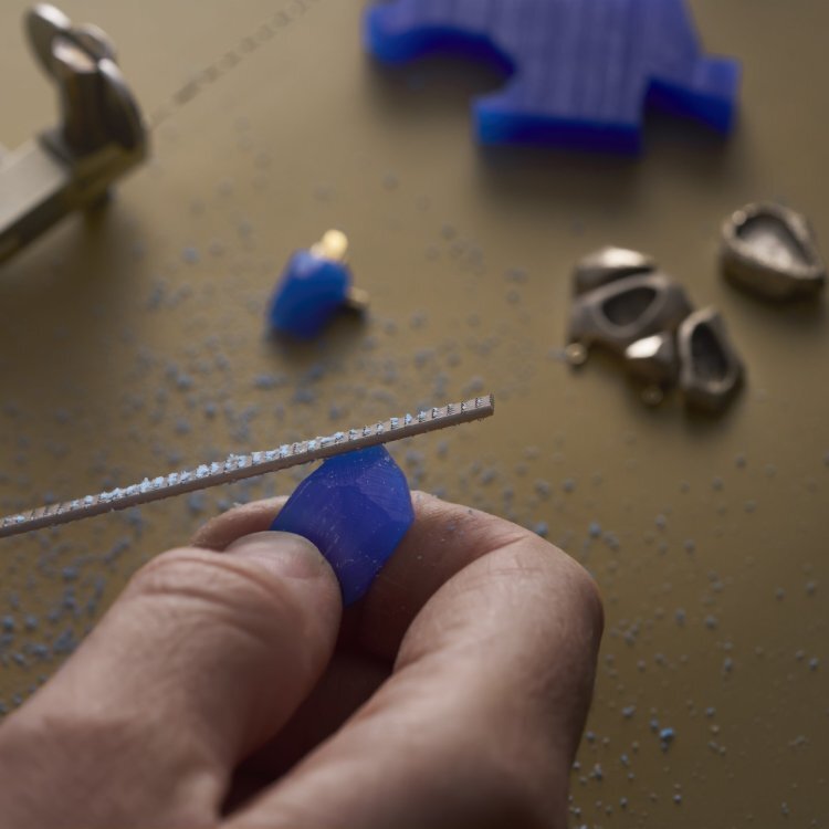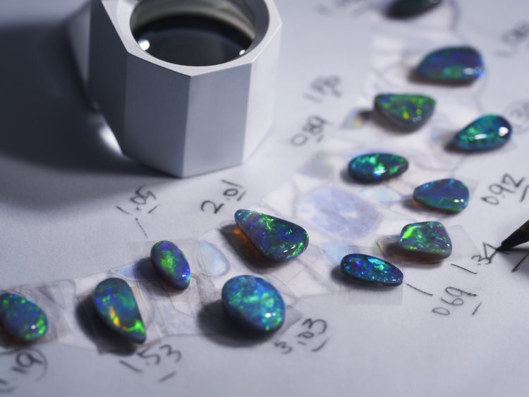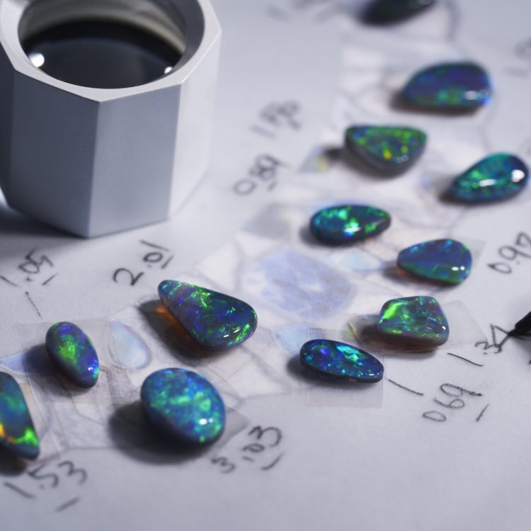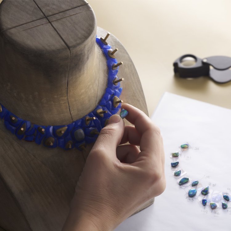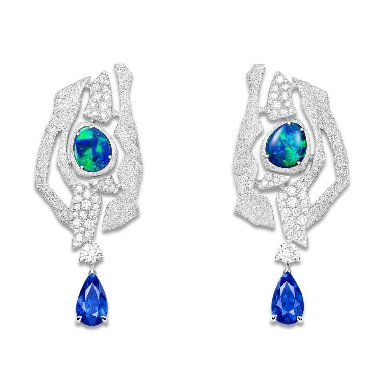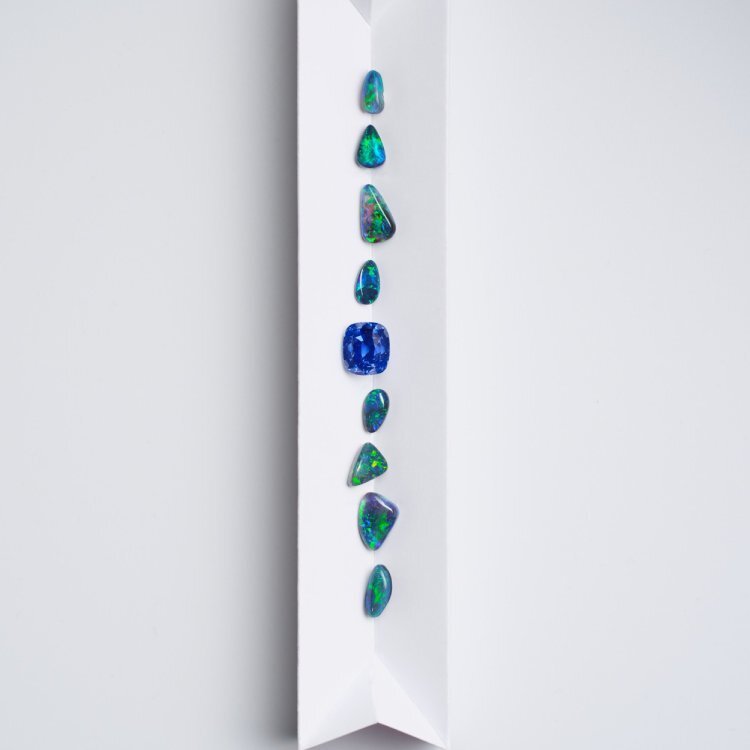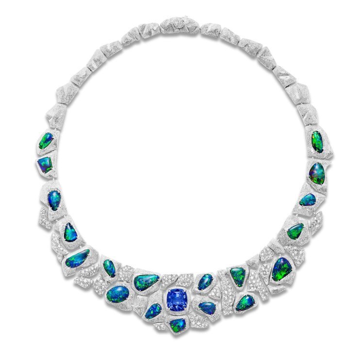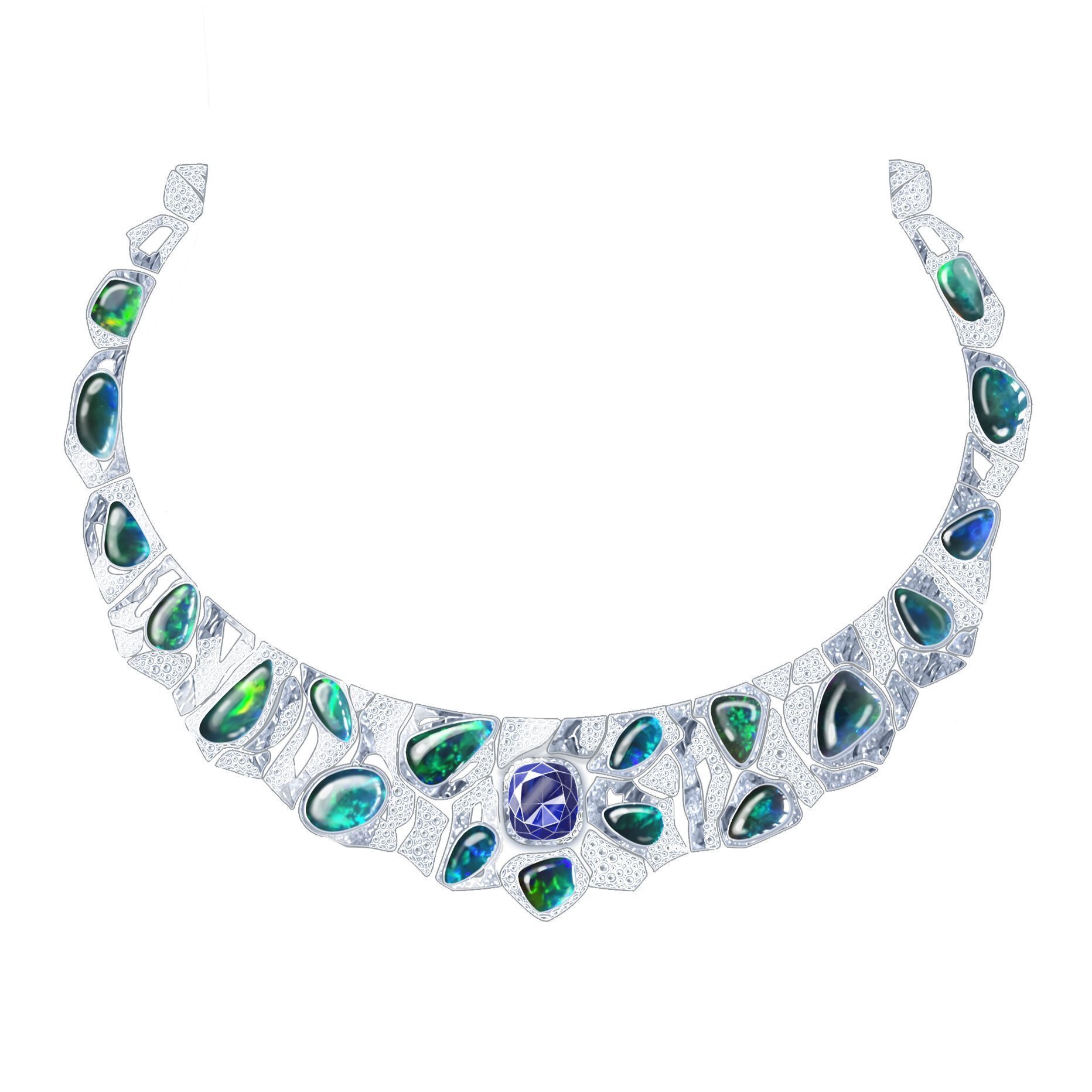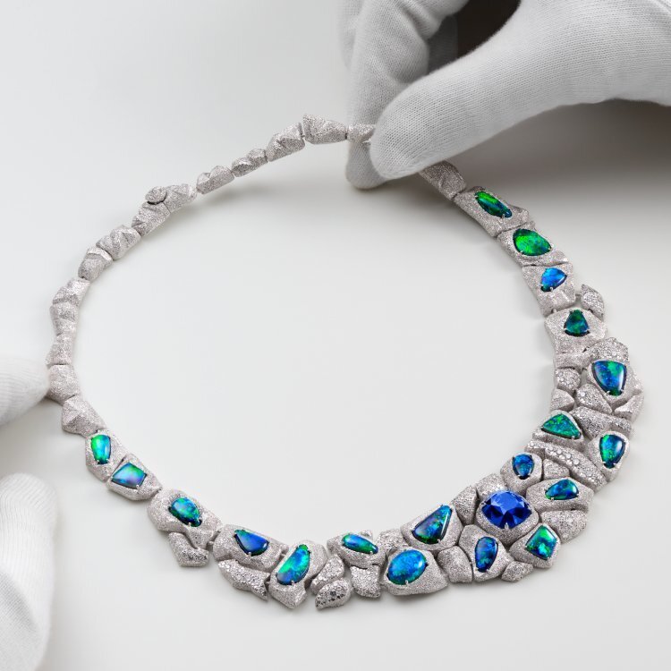 Necklace: Features 19 black opals totaling approximately 26.39ct, with a 9.26ct cushion-cut Madagascar blue sapphire at the center as a focal point, symbolizing the convergence of land and sea.