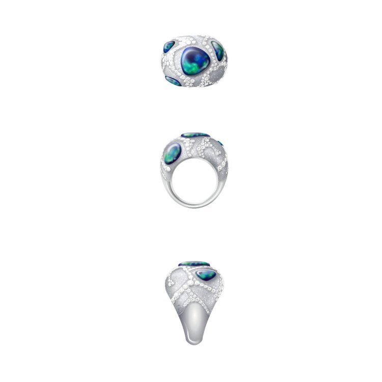 Ring: Set with 4 black opals totaling around 6.64ct, appearing as though the stones emerge naturally from the diamond-studded platinum band, creating striking visual tension.