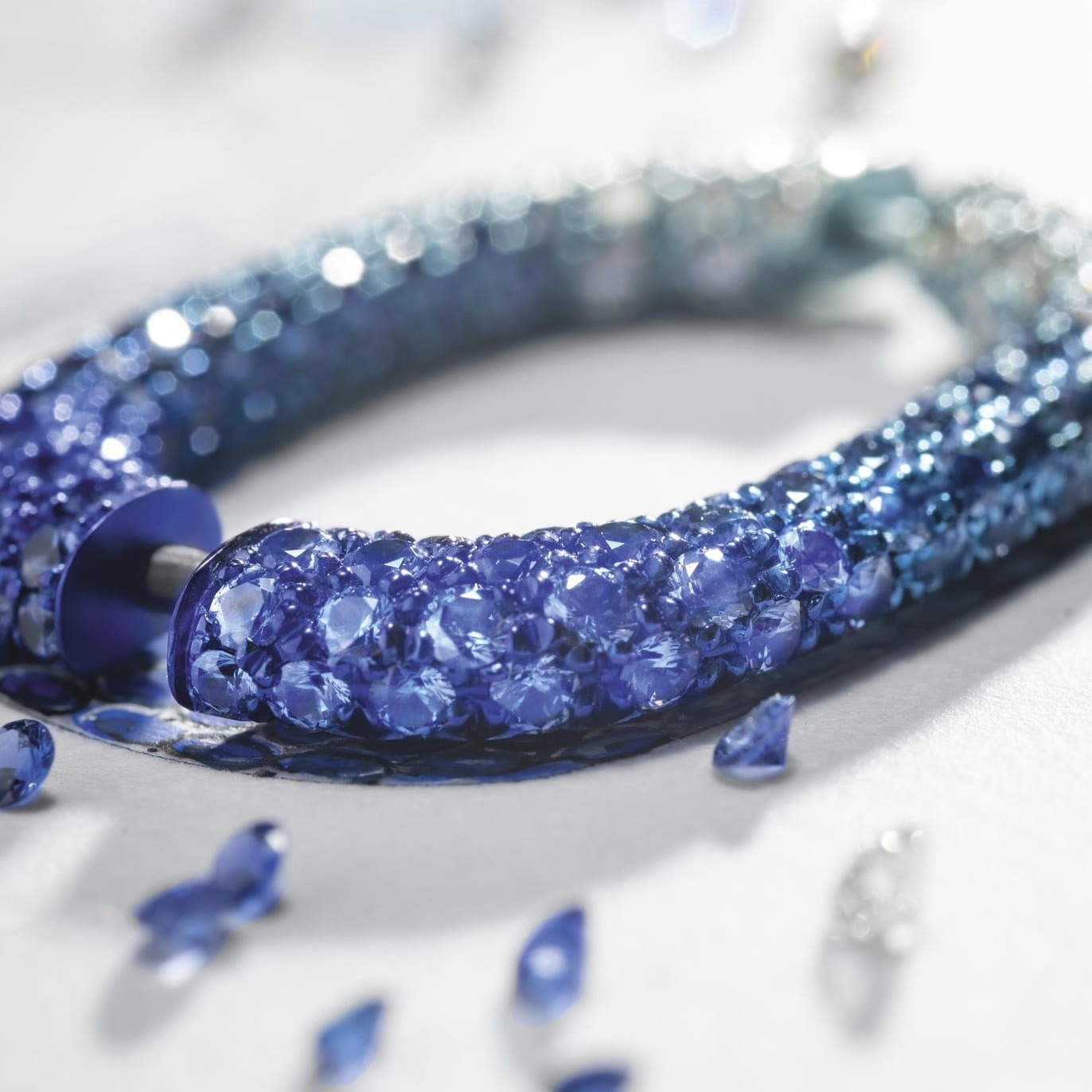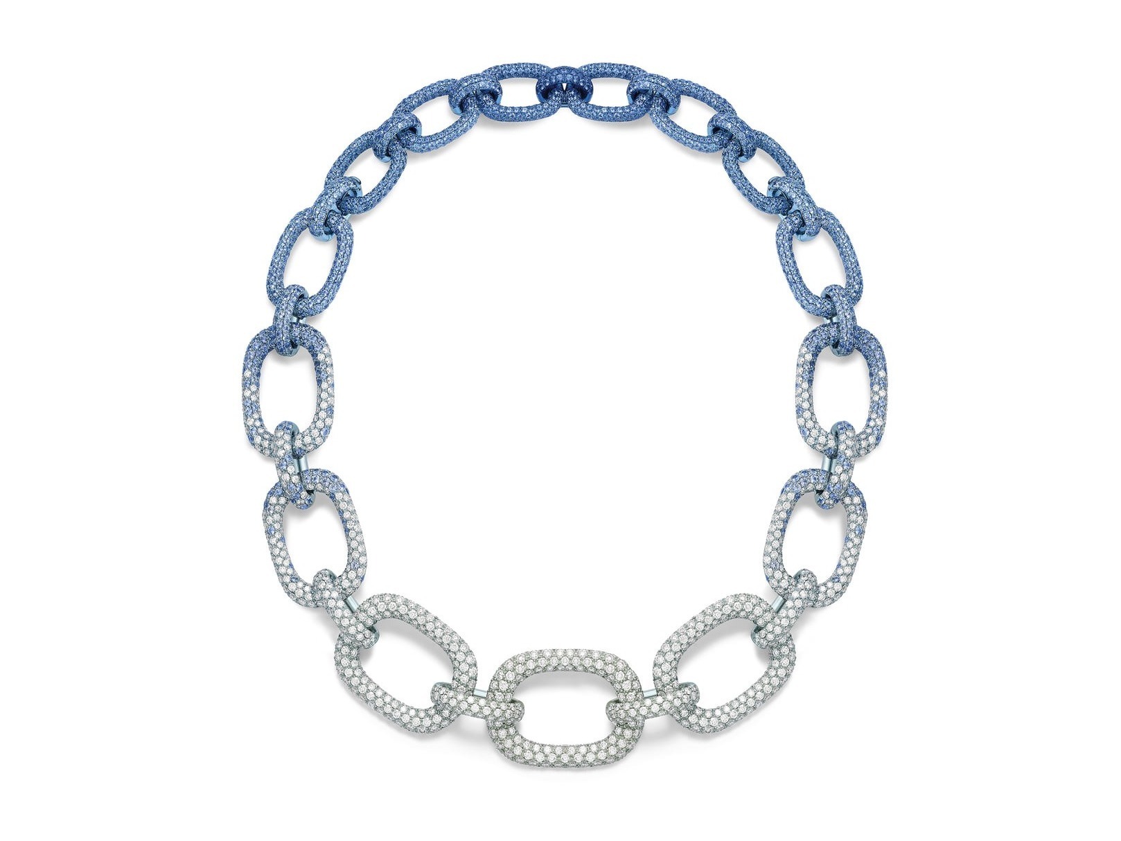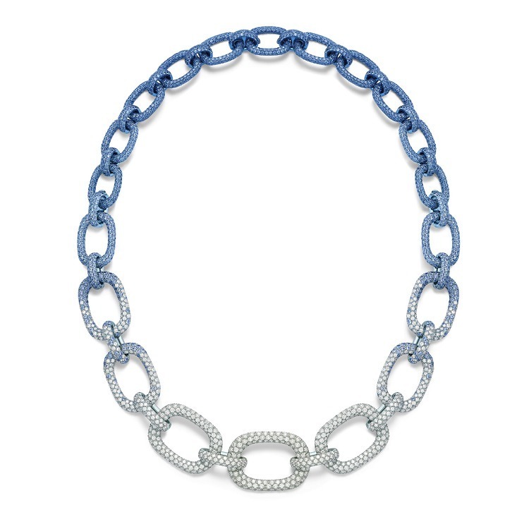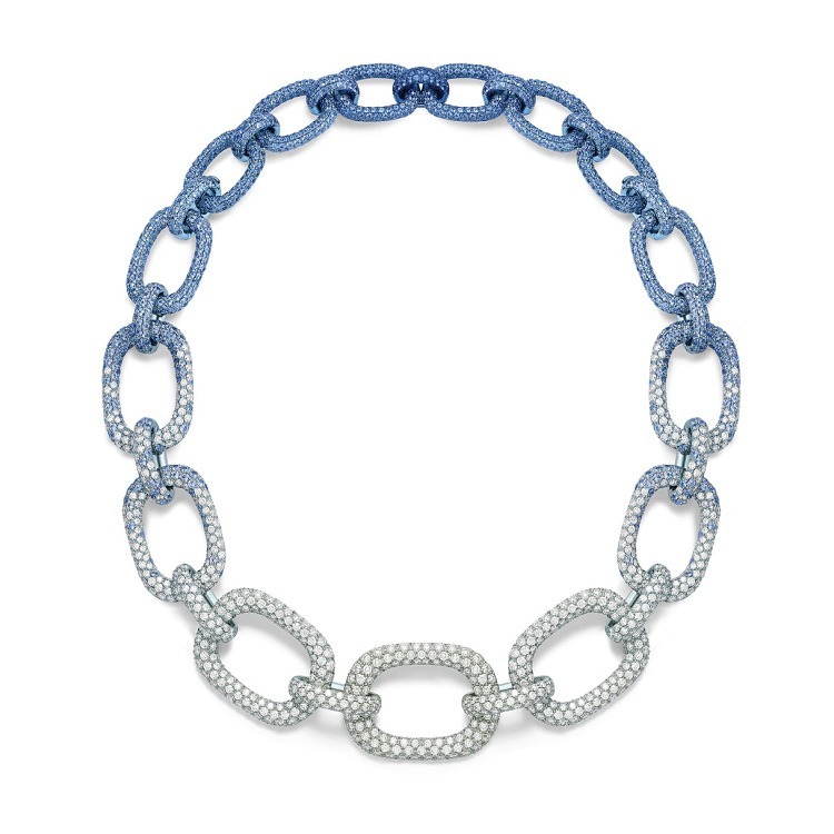 The Magic Hour Necklace continues the classic link chain design from Piaget’s 1960s heritage. It is set with over 3000 sapphires and diamonds, presenting a natural transition from deep blue, light blue to colorless. A special feature is a hidden clasp that allows it to be easily transformed into a shorter necklace or a bracelet. The entire piece required 350 hours to complete.