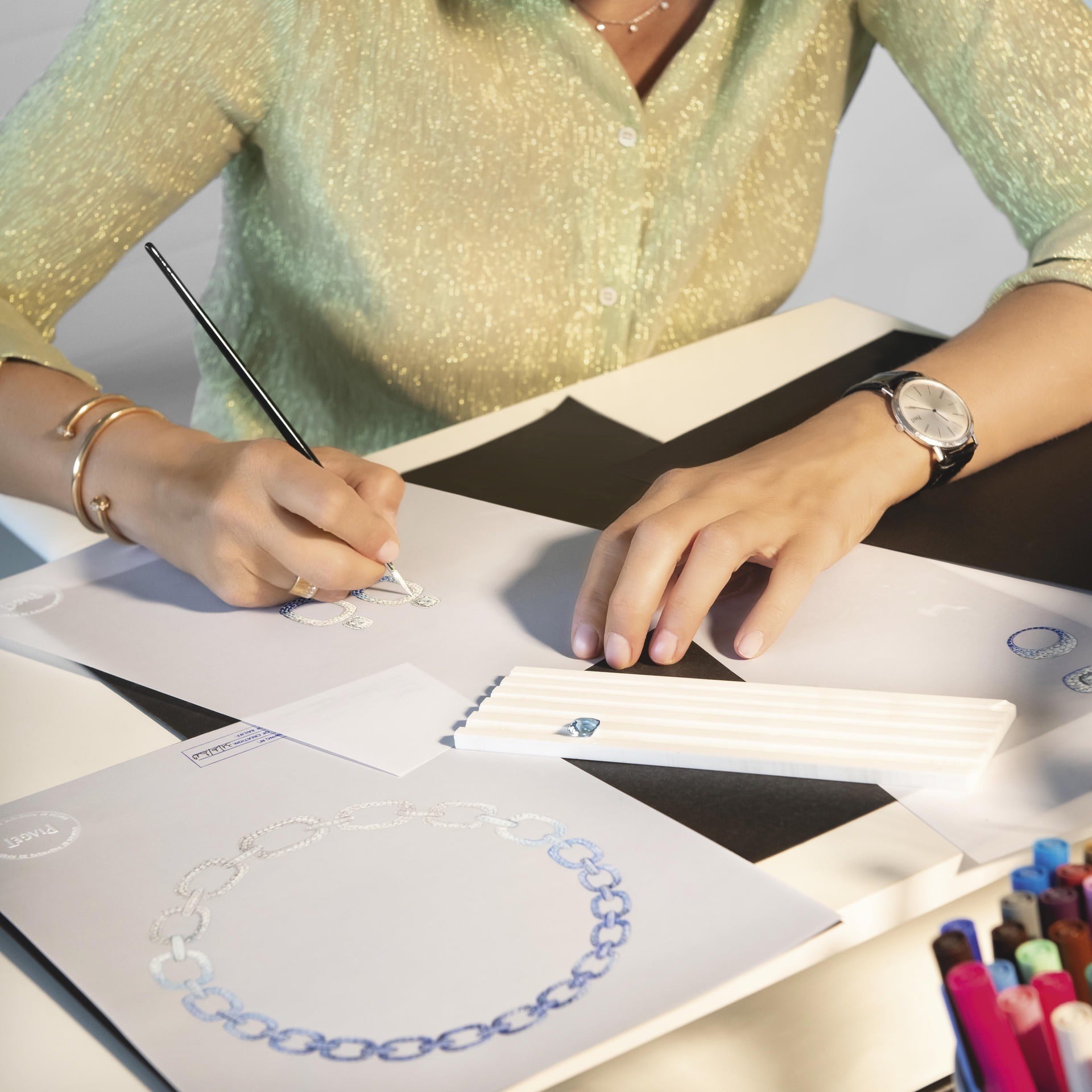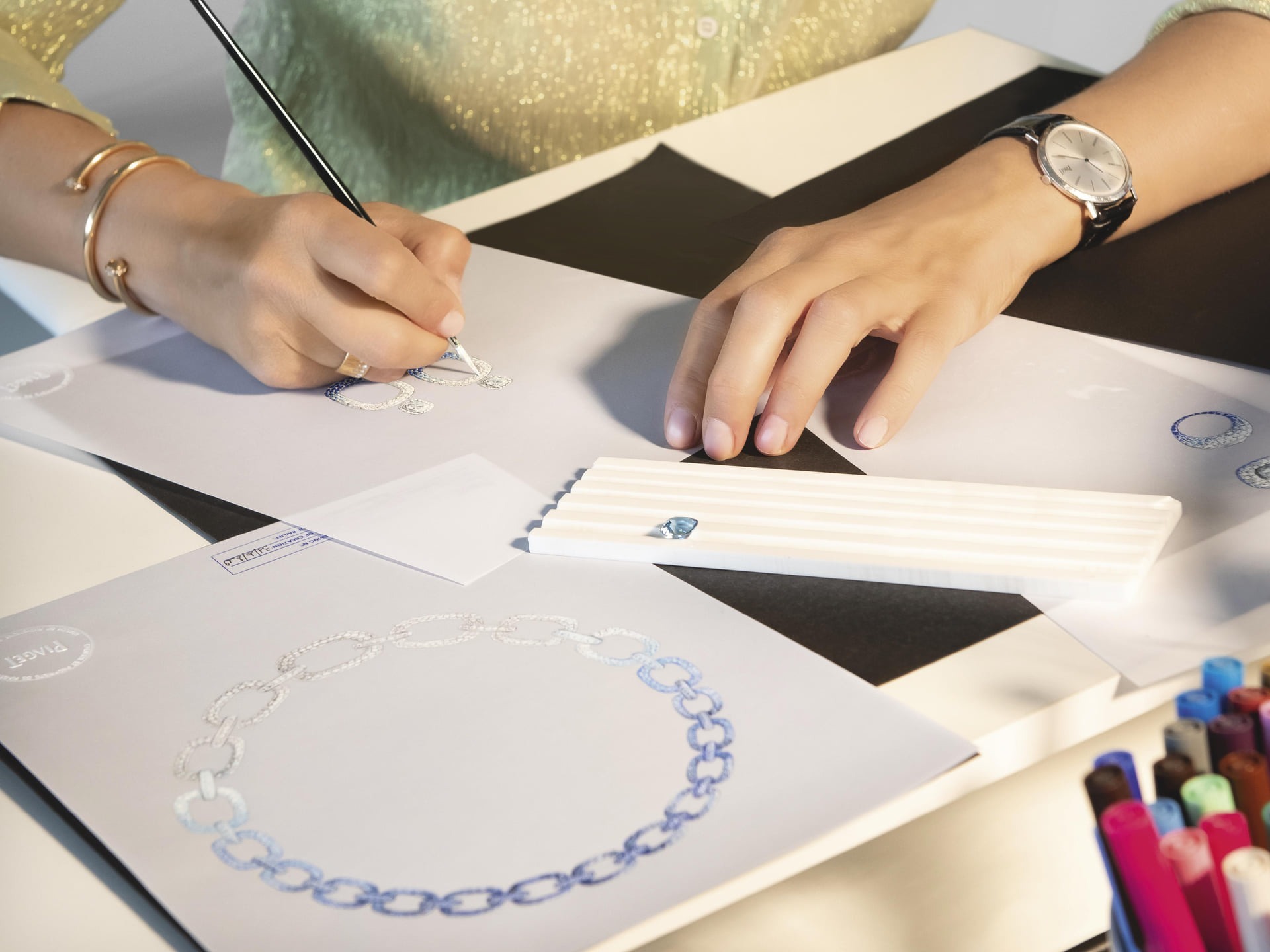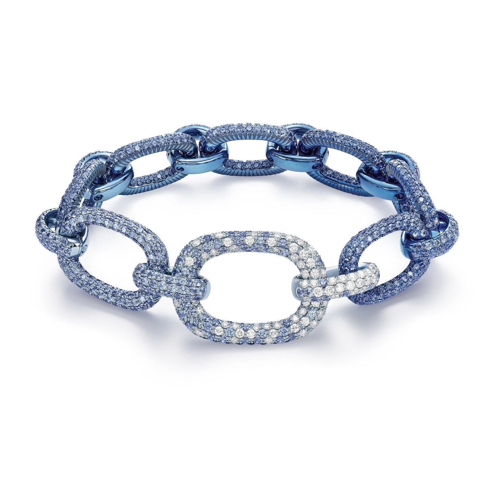 The Magic Hour Necklace continues the classic link chain design from Piaget’s 1960s heritage. It is set with over 3000 sapphires and diamonds, presenting a natural transition from deep blue, light blue to colorless. A special feature is a hidden clasp that allows it to be easily transformed into a shorter necklace or a bracelet. The entire piece required 350 hours to complete.