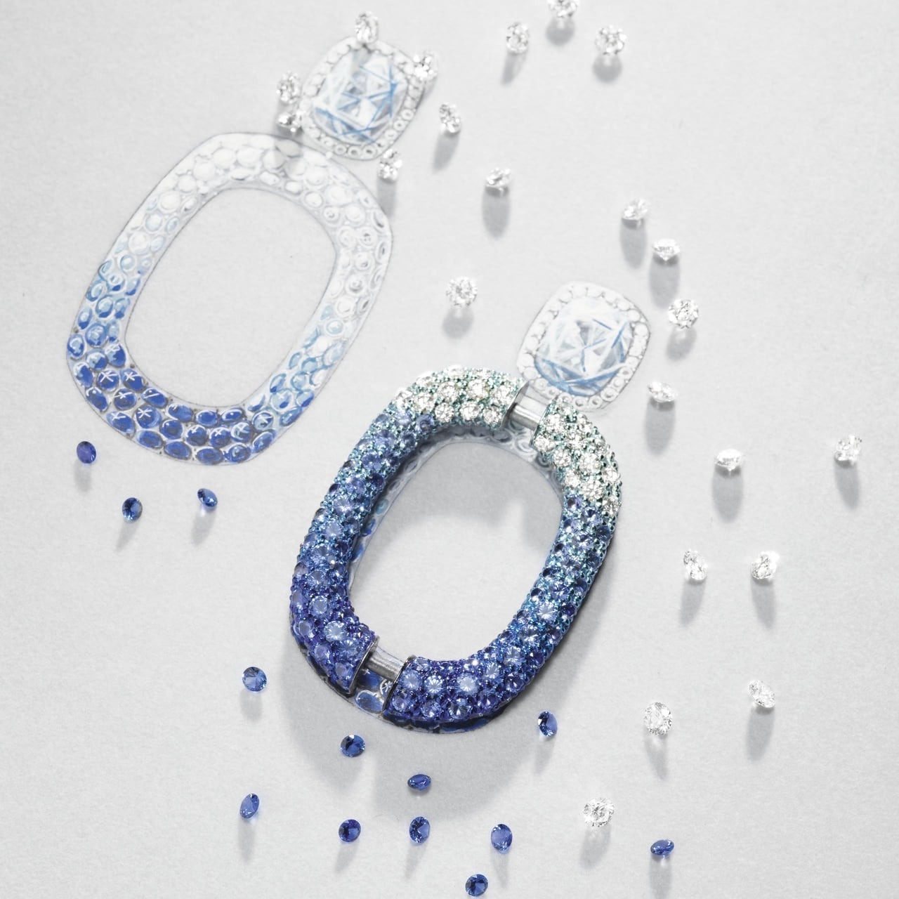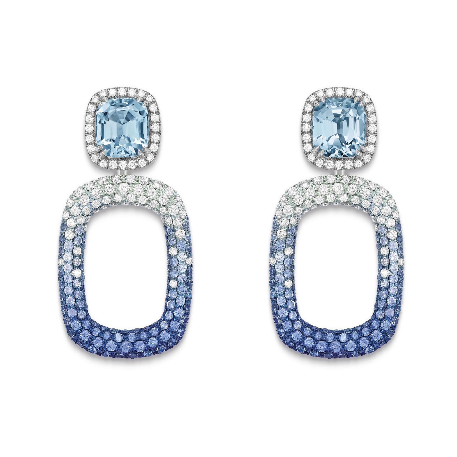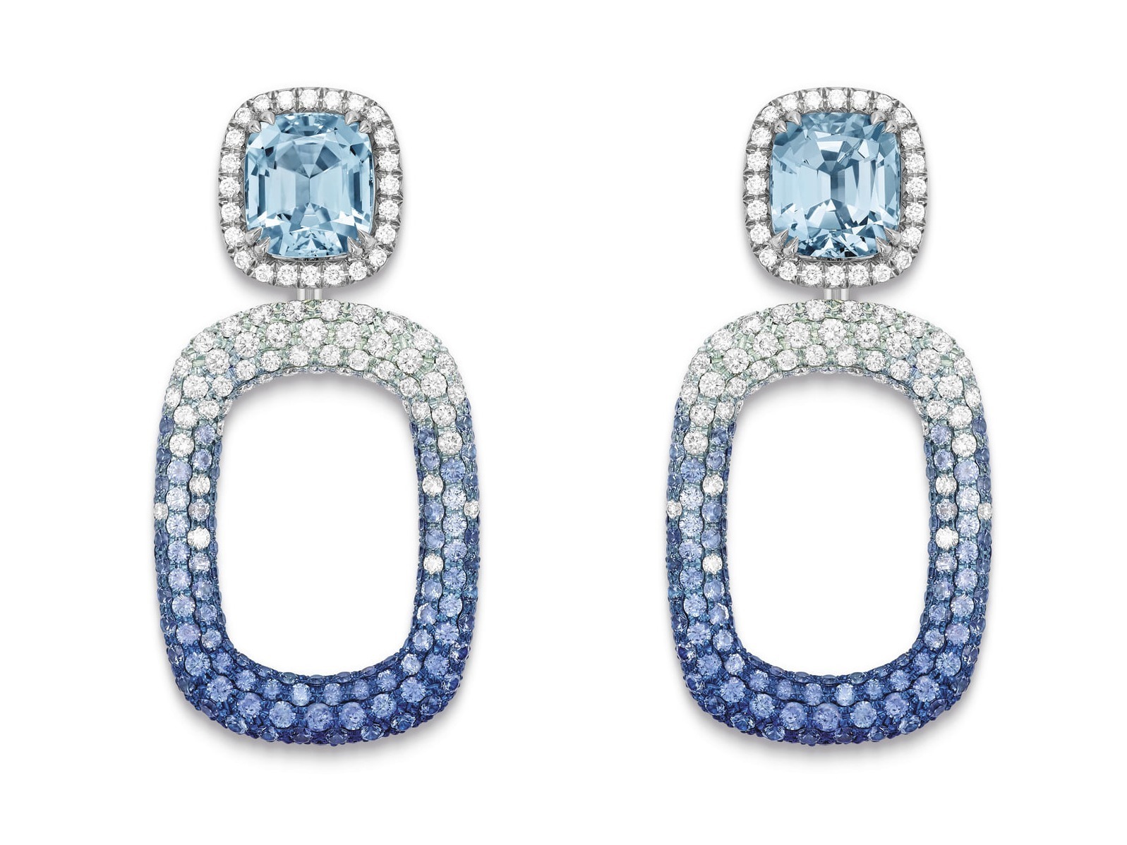 The Ear Pendents continue the link element from the Magic Hour necklace, displaying a natural blue-to-white gradient. The ear studs are set with two cushion-cut aquamarines totaling over 8 carats, framed by a brilliant border of diamonds, making them a captivating focal point.