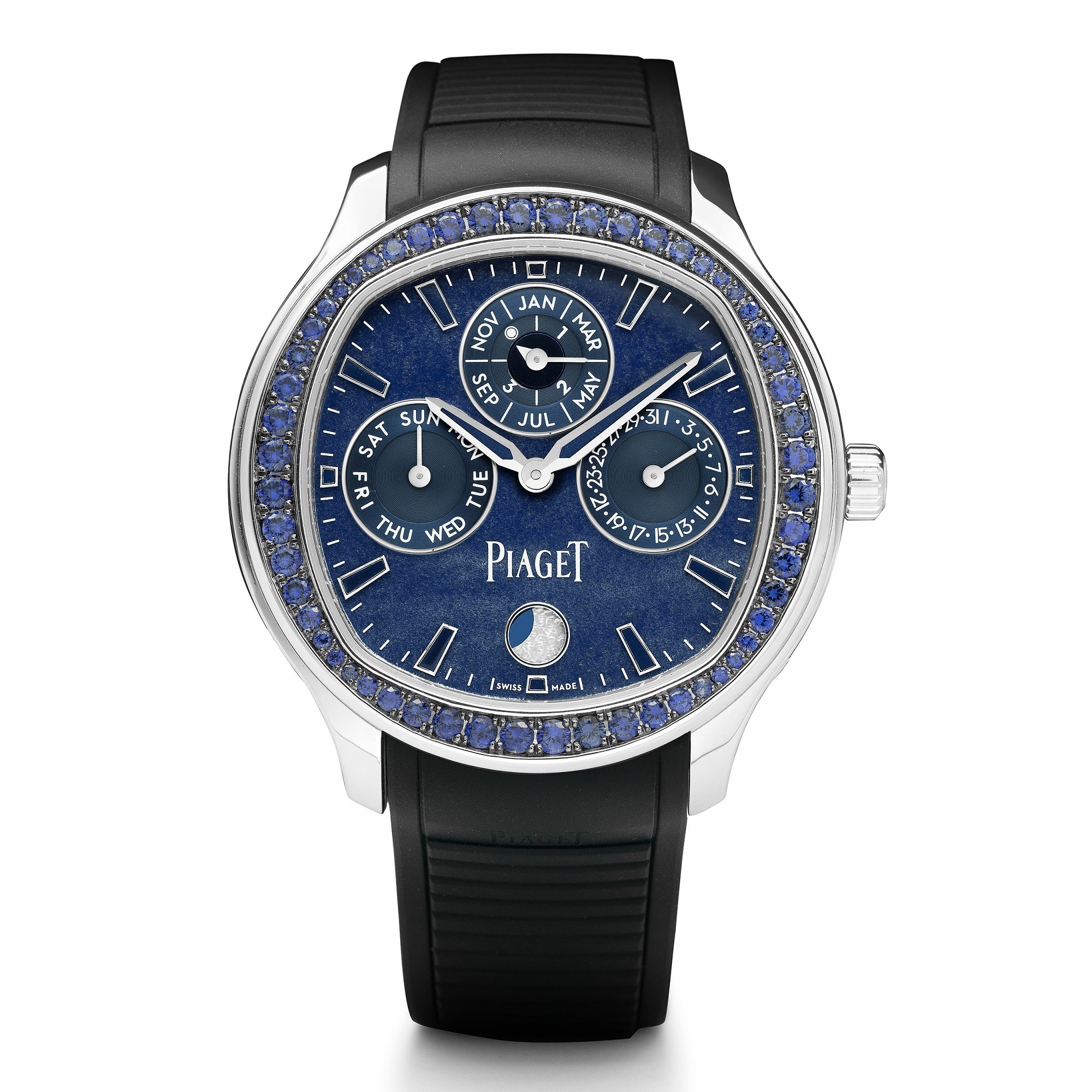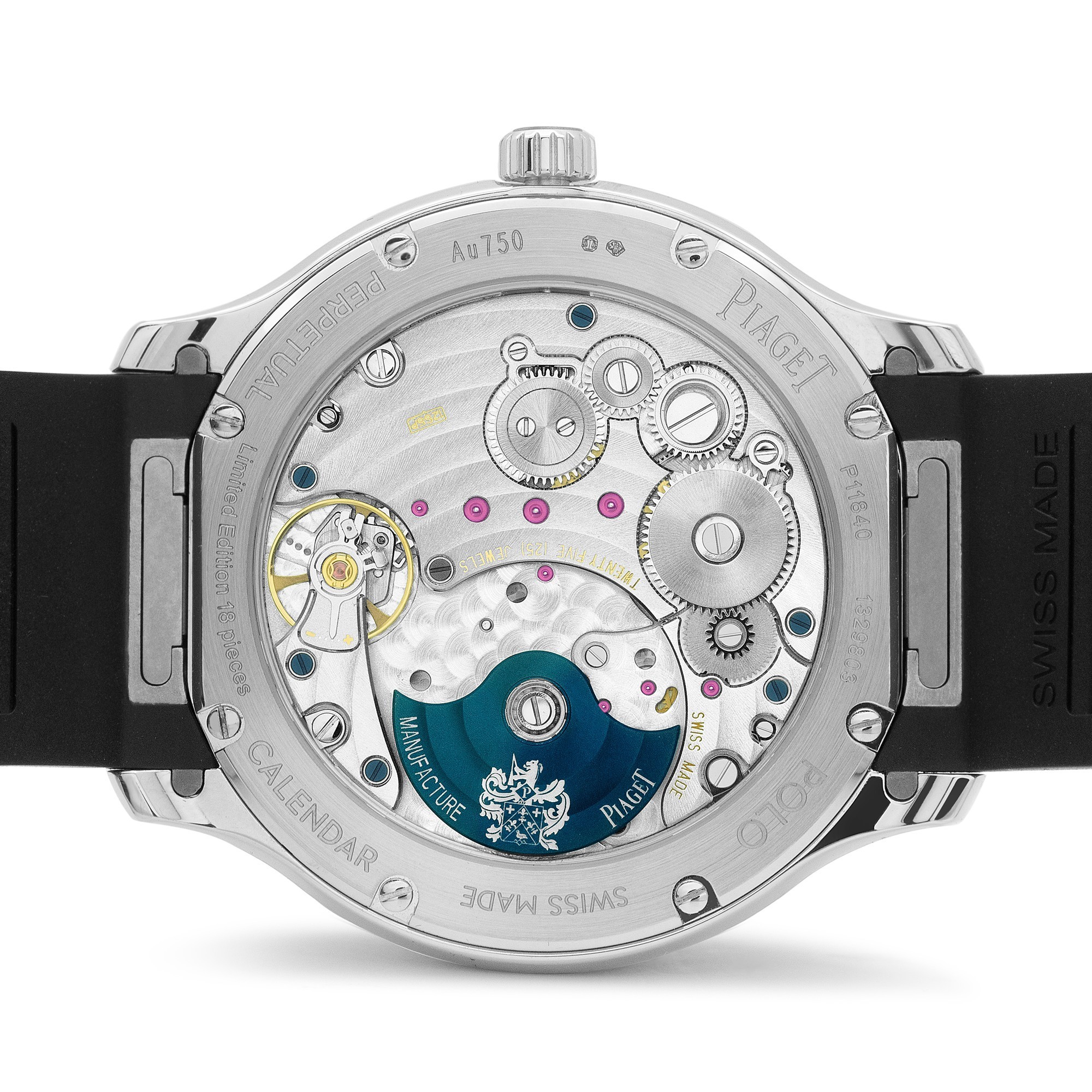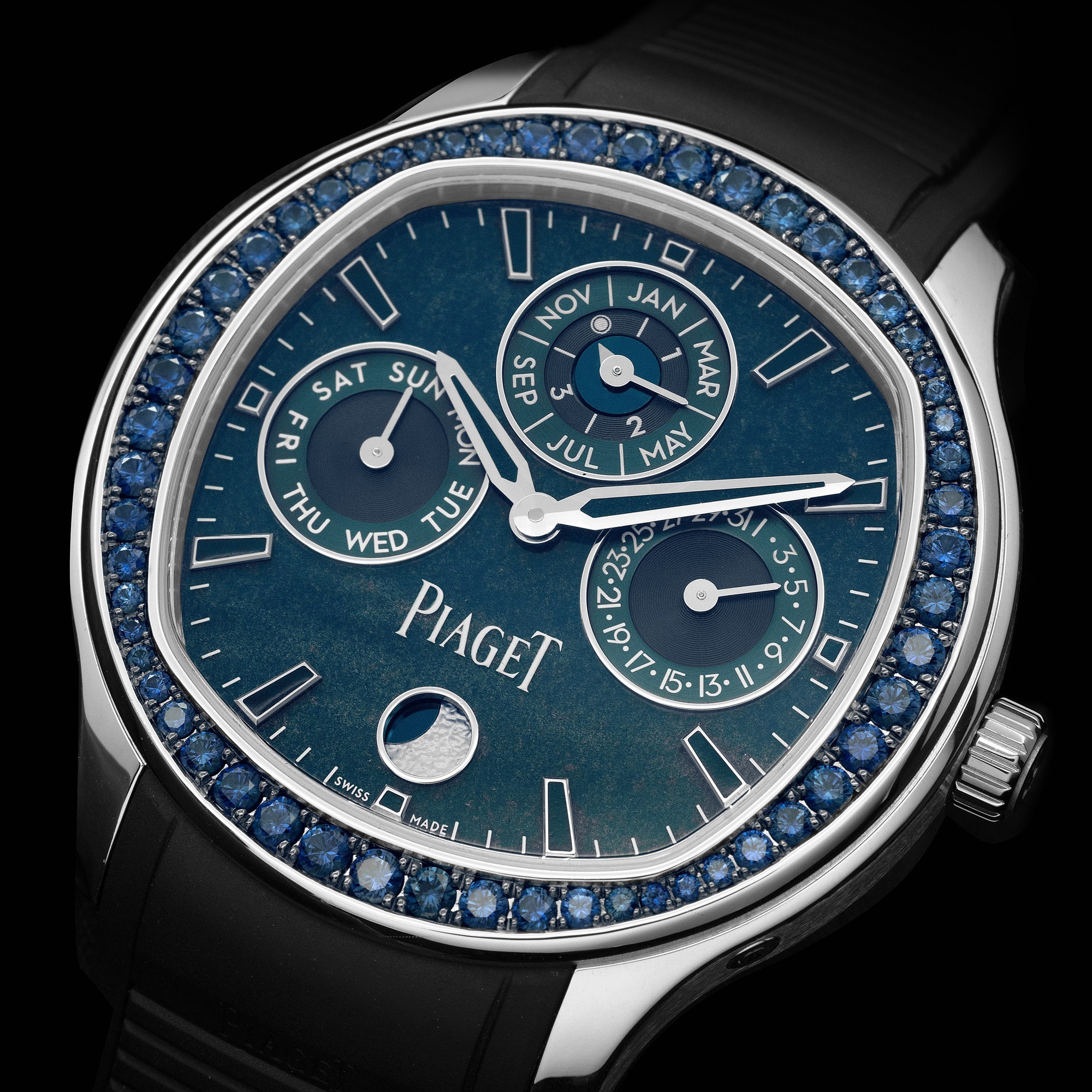 It is powered by the Caliber 1255P self-winding movement, operating at 21,600 vibrations per hour and offering a 42-hour power reserve. This ultra-thin movement, based on the Caliber 1200P from 2010, incorporates additional modules for the perpetual calendar and moon phase complications. The entire movement is just 4mm thick. The blue oscillating weight is adorned with the Piaget coat of arms.