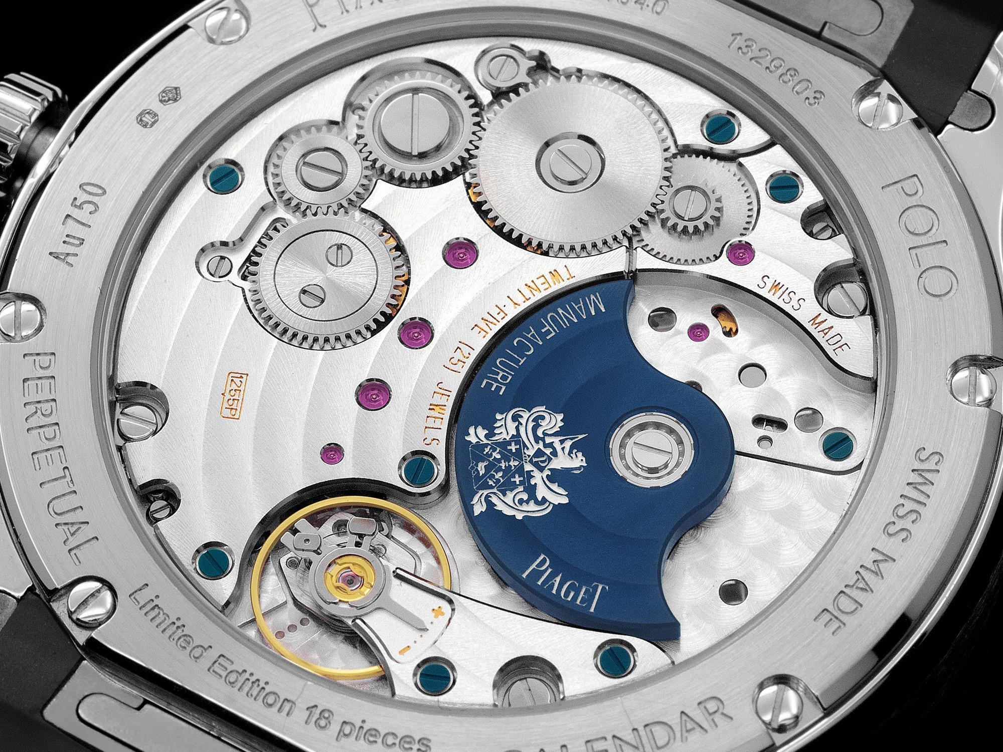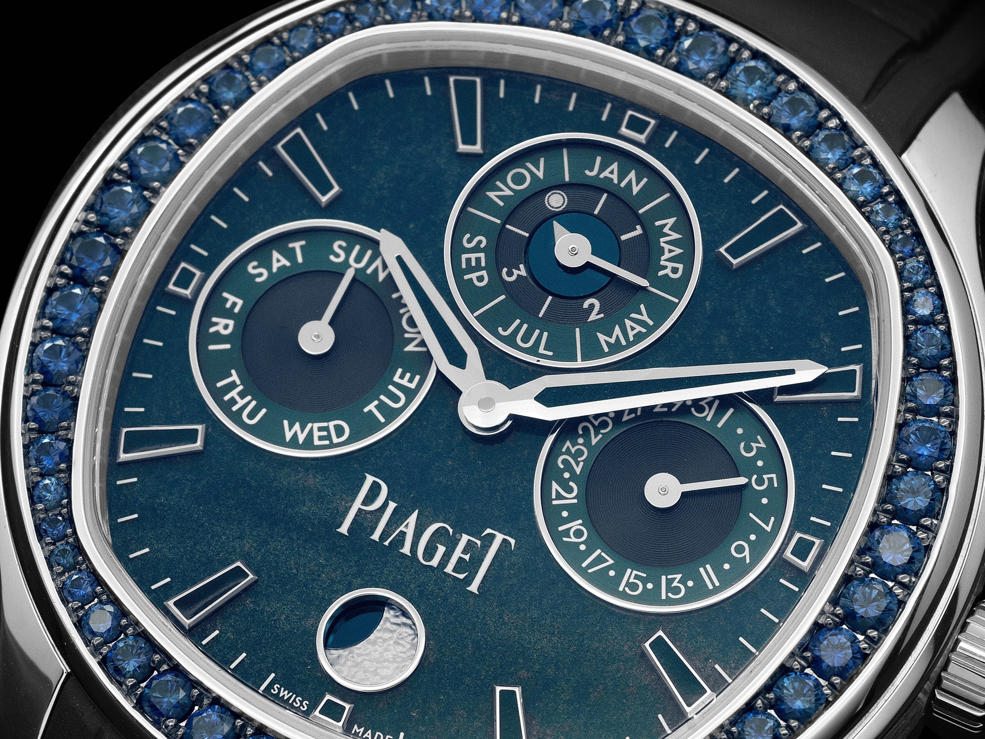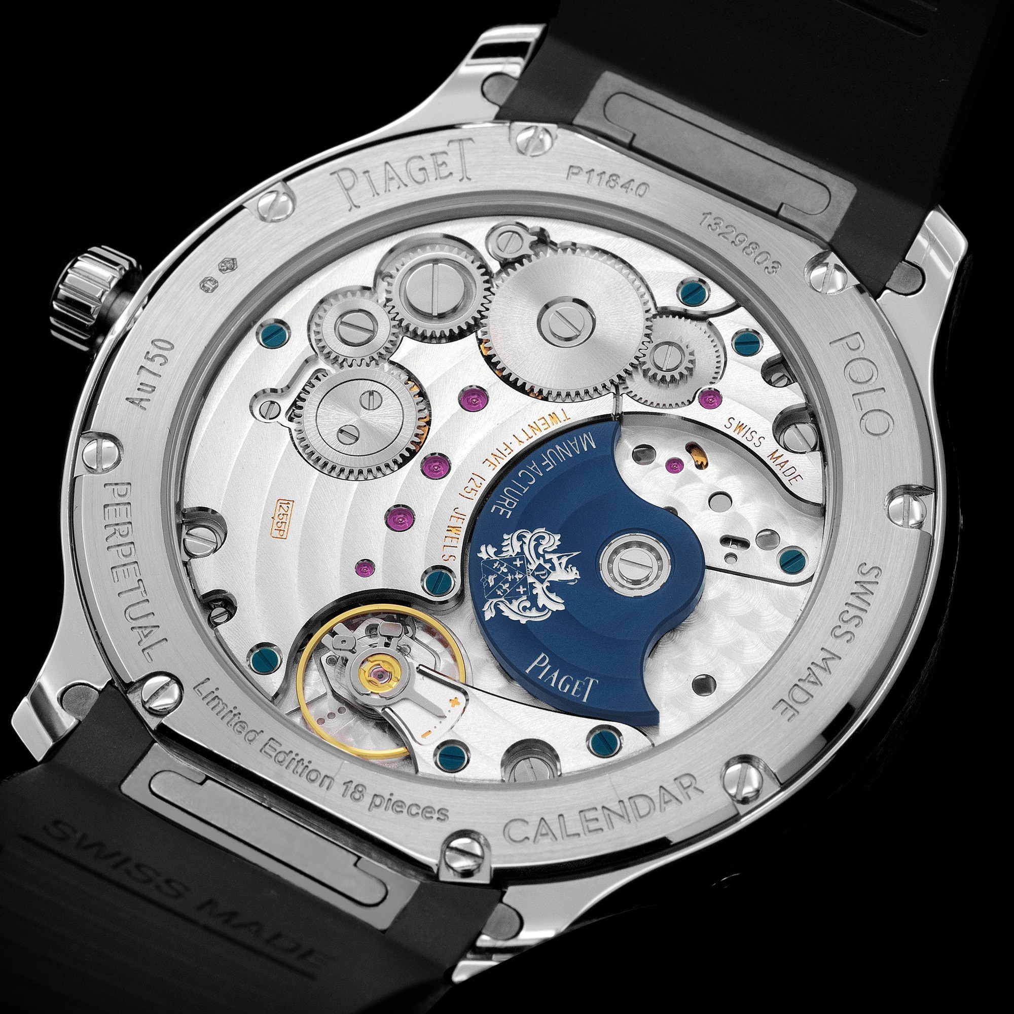 It is powered by the Caliber 1255P self-winding movement, operating at 21,600 vibrations per hour and offering a 42-hour power reserve. This ultra-thin movement, based on the Caliber 1200P from 2010, incorporates additional modules for the perpetual calendar and moon phase complications. The entire movement is just 4mm thick. The blue oscillating weight is adorned with the Piaget coat of arms.