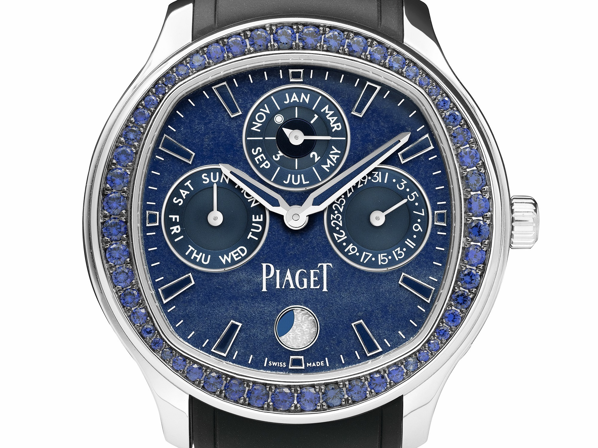 At the 2023 Watches & Wonders Geneva exhibition, Piaget introduced this high jewelry version of the “Polo Perpetual Calendar Obsidian”. The watch features a dial crafted for the first time from a slice of blue obsidian, while the bezel is set with graduated blue sapphires, creating a scene reminiscent of a starry night sky.