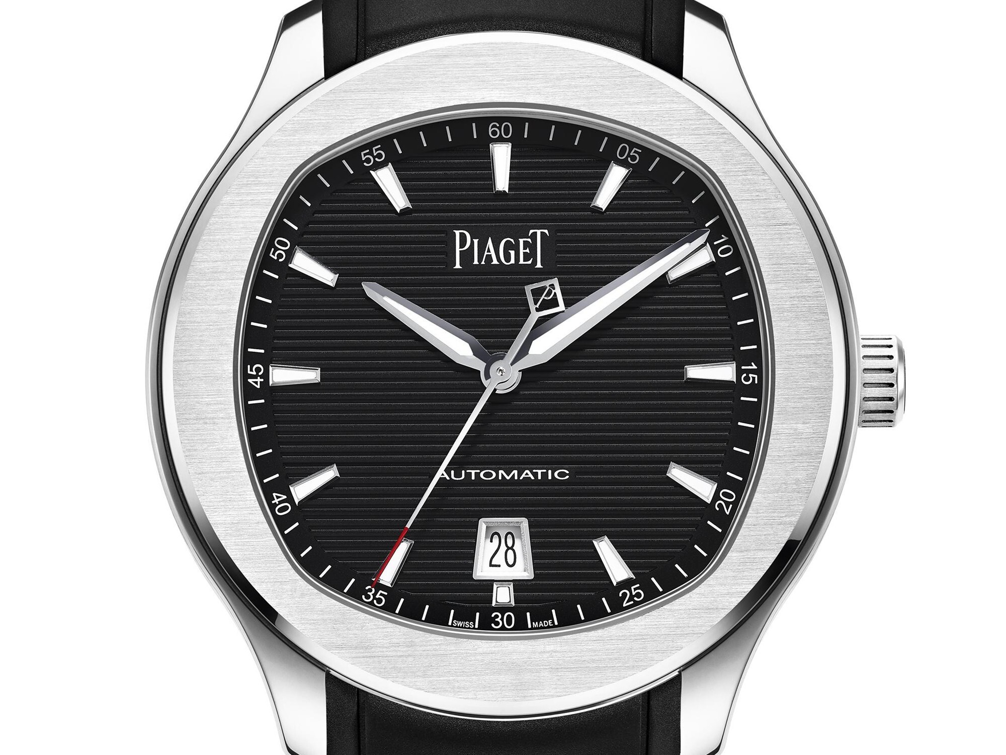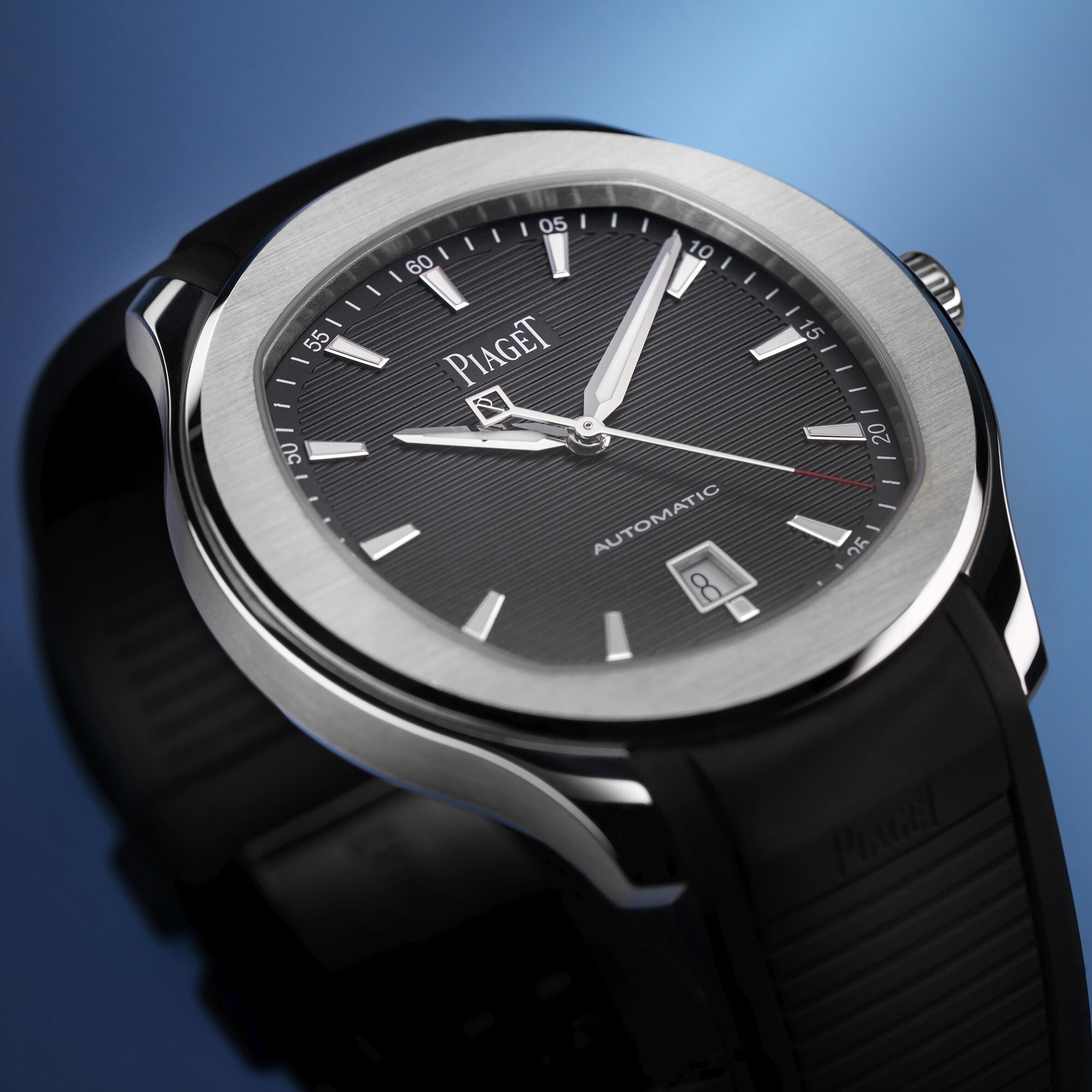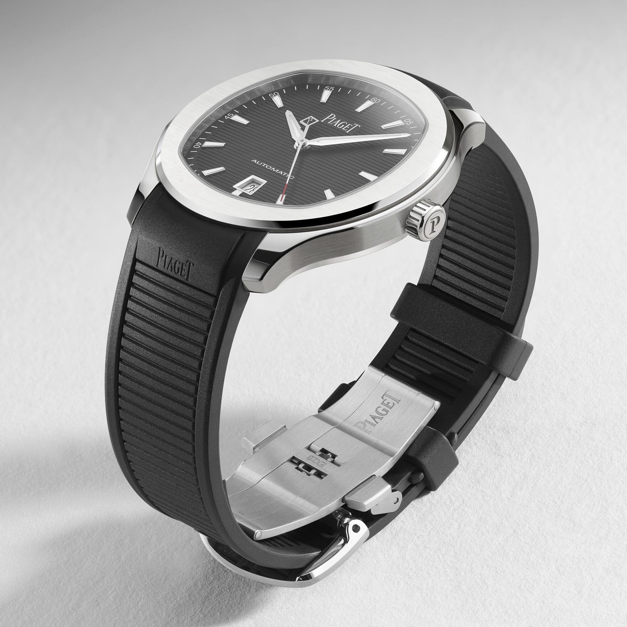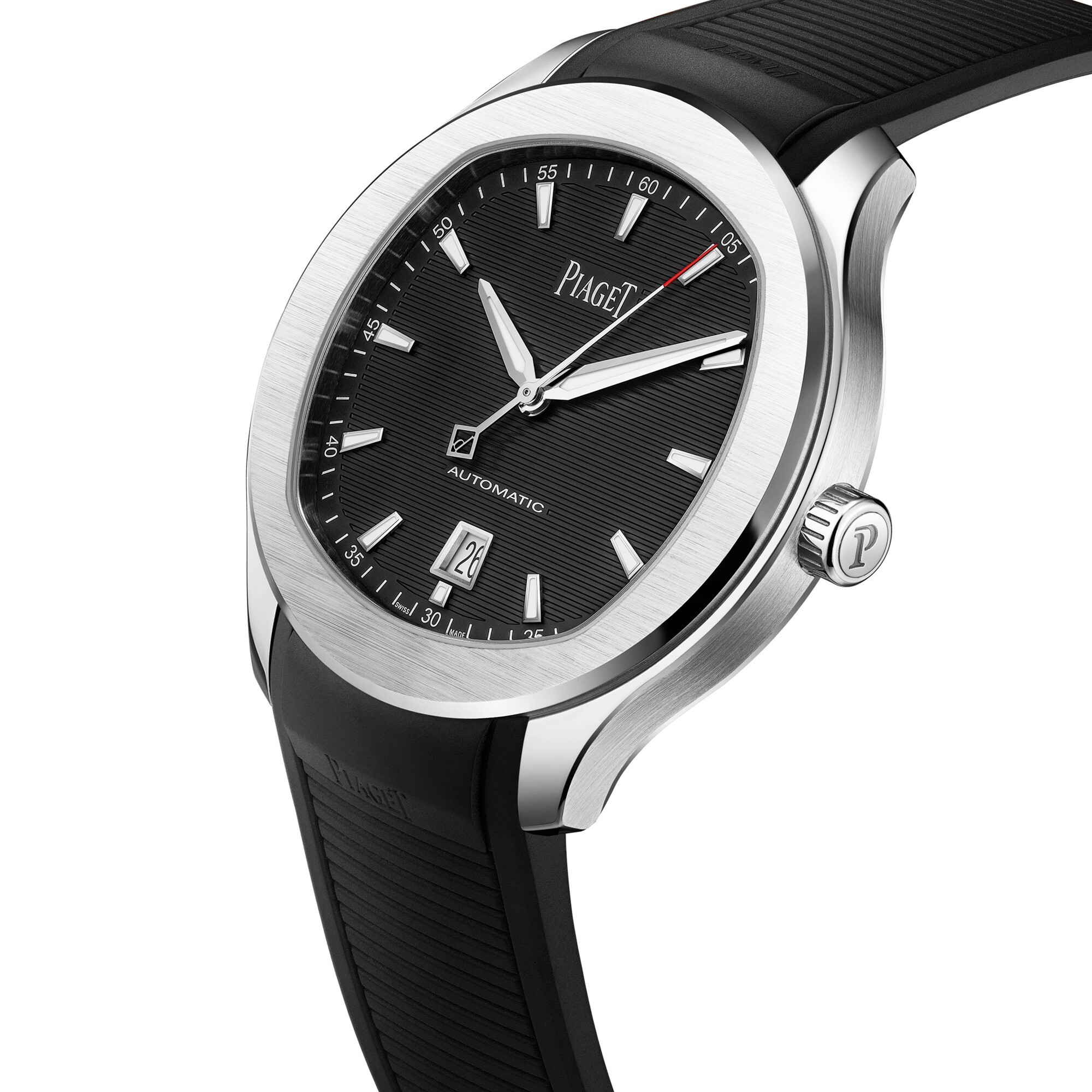 The understated black dial features a standard three-hand layout. The applied hour markers and Baton-style hands are coated with white Super-LumiNova for nighttime legibility. The counterweight of the seconds hand is cut out in the shape of the letter “P”, with a red tip serving as the dial’s most vibrant accent. A trapezoidal date window is positioned at 6 o’clock. The horizontal engraved pattern extends from the dial onto the rubber strap, giving the watch a unified and fluid aesthetic.
