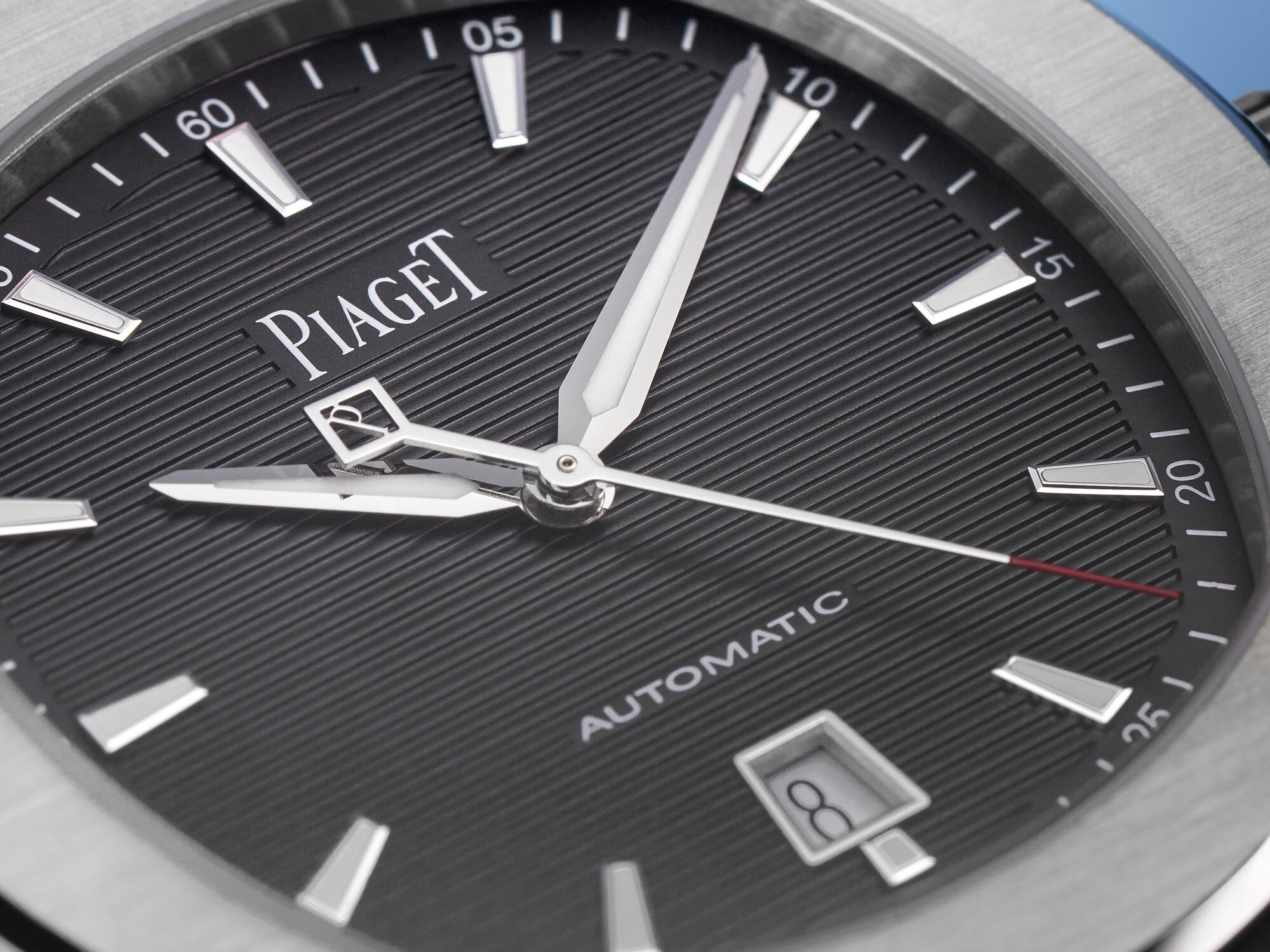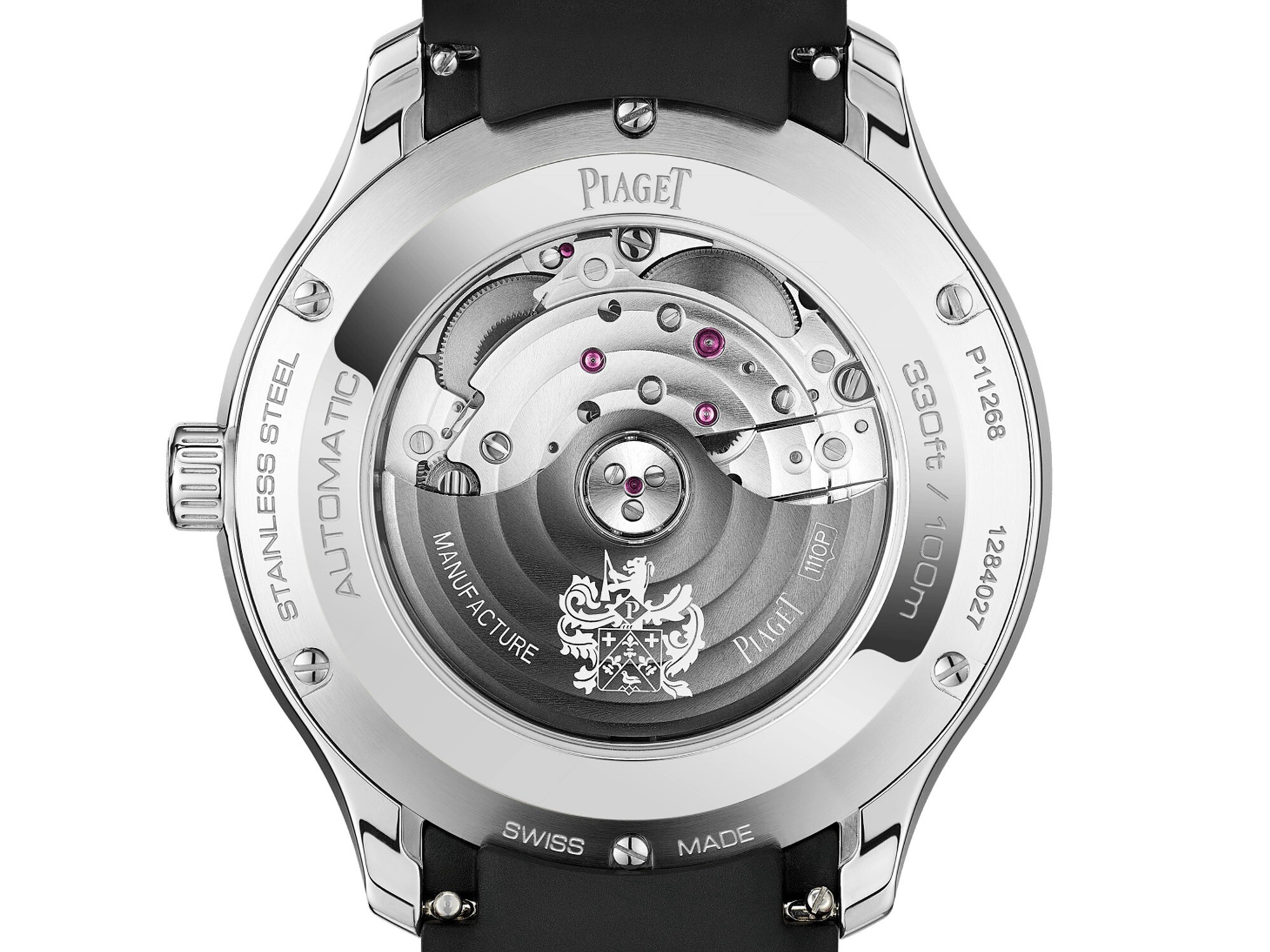 It is powered by the Caliber 1110P self-winding movement, beating at 28,800 vibrations per hour and offering a 50-hour power reserve. This movement comprises 180 components and is just 4mm thick. It features a hack seconds mechanism, allowing for more precise time setting. The fine finishing of the movement can be admired through the sapphire crystal caseback, with the grey oscillating weight adorned with circular Côtes de Genève and the PIAGET coat of arms.
