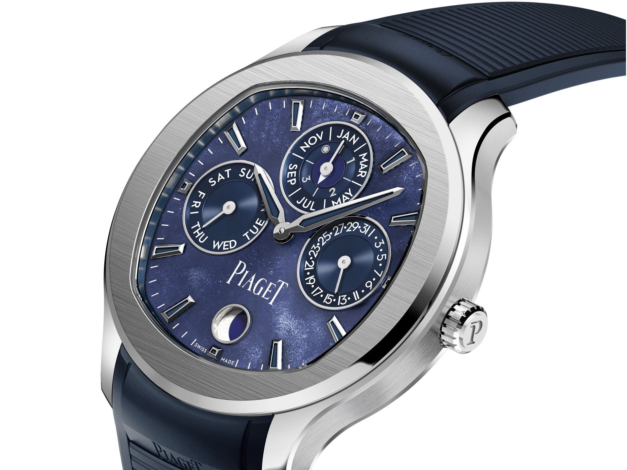 The square-pillow-shaped dial is made from obsidian slices, a natural gemstone formed by the rapid cooling of volcanic lava. Polished to a mirror-like finish, it has an iridescent sheen and unique texture that makes each piece distinct. The dial continues the classic layout of the Polo Perpetual Calendar watch, with month and leap year at 12 o’clock, a date display at 3 o’clock, a moonphase window at 6 o’clock, and a day indicator at 9 o’clock.