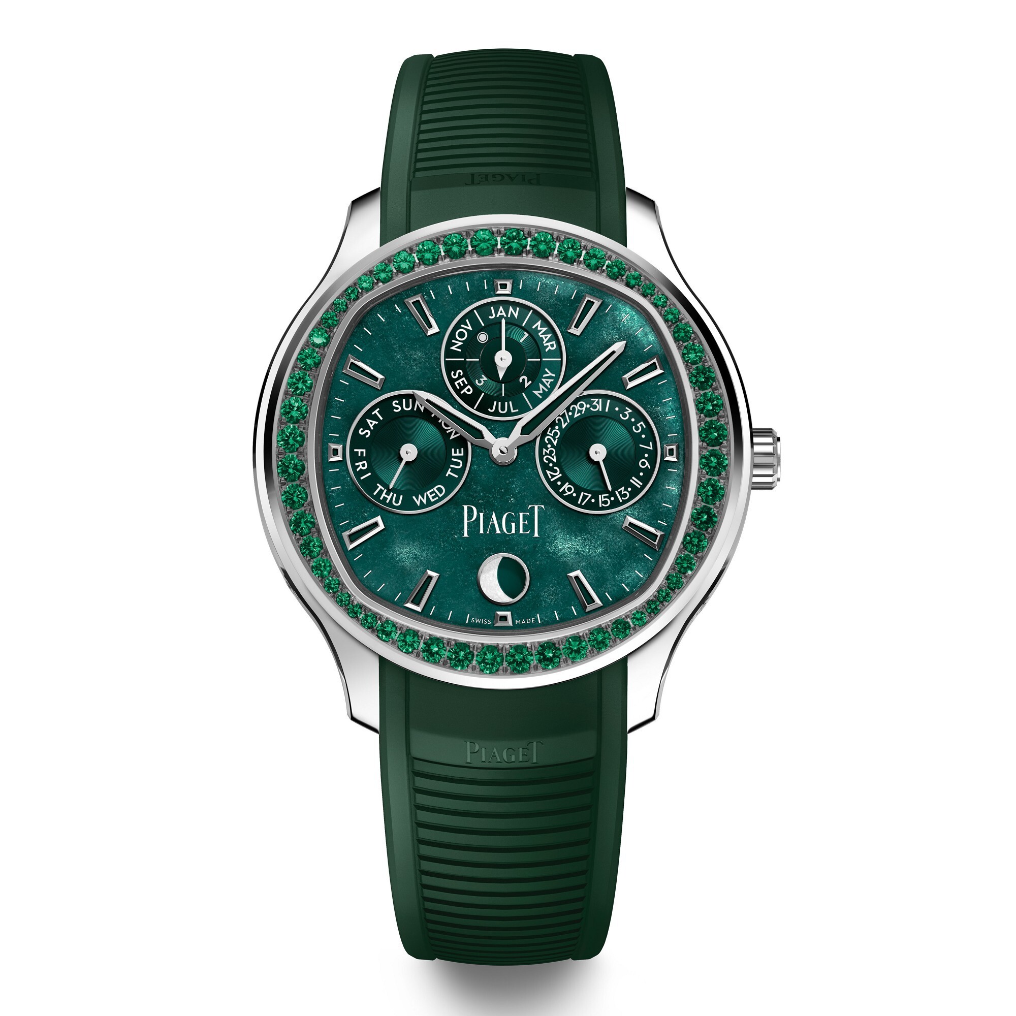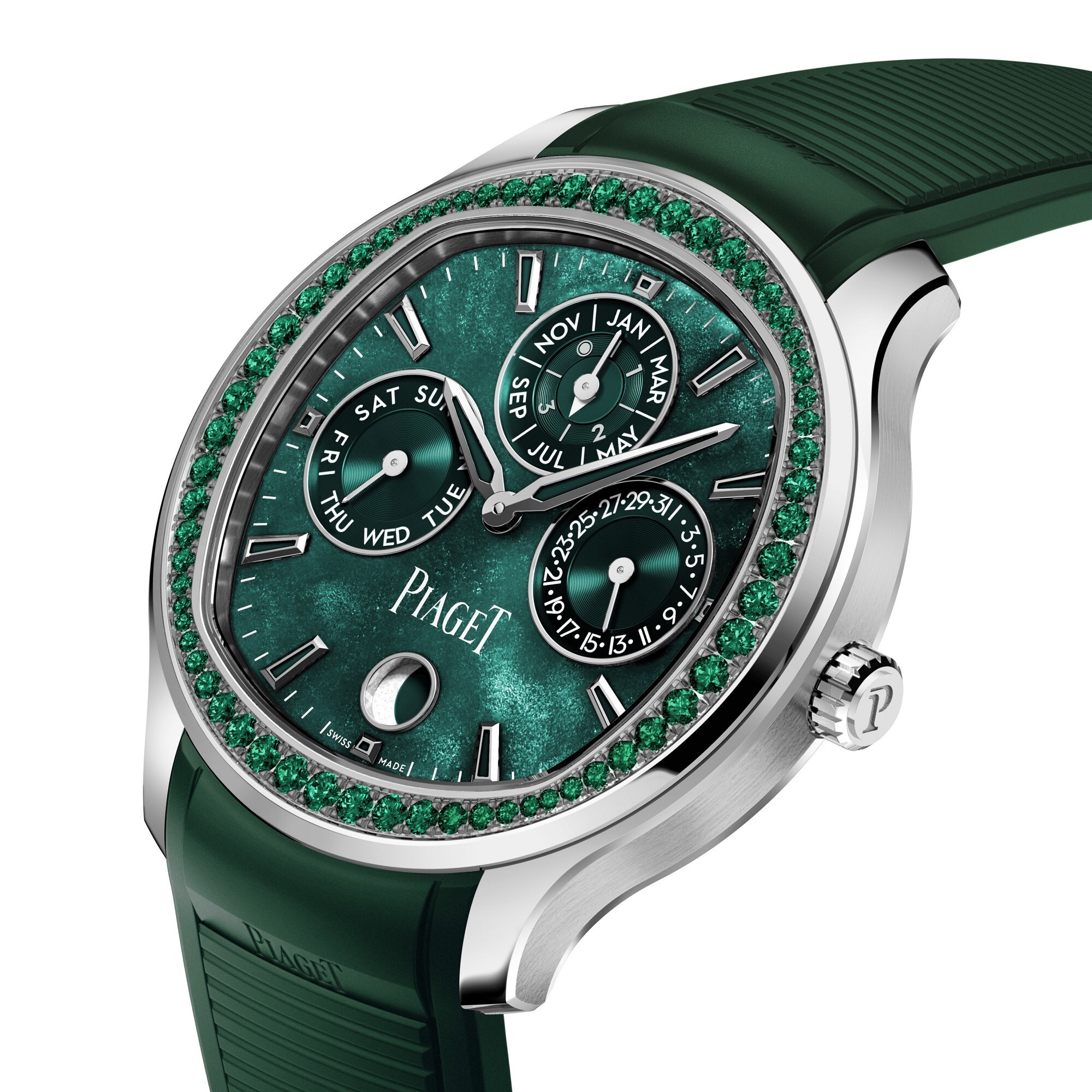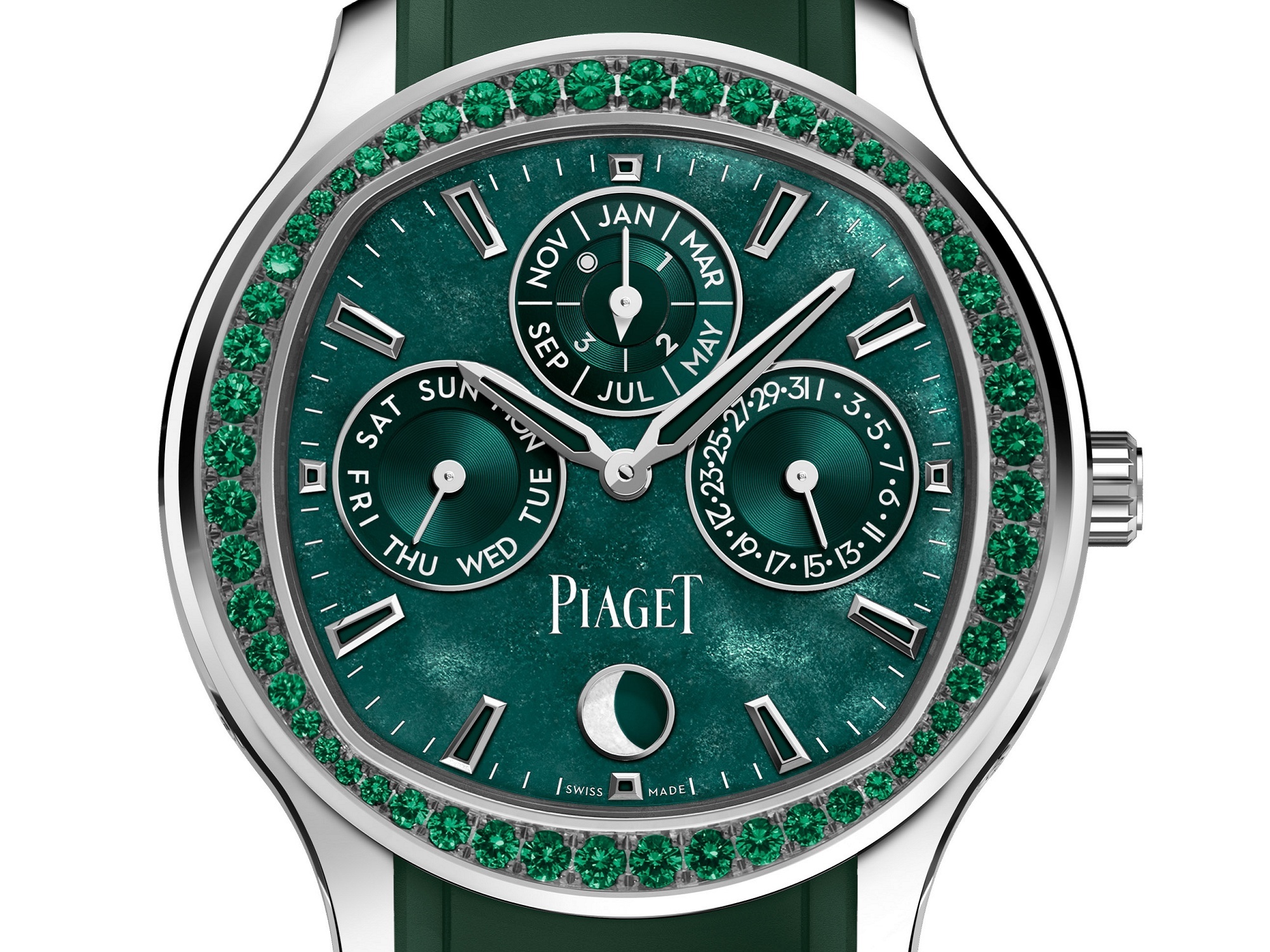 PIAGET unveils a new addition to its Polo series, featuring a perpetual calendar complication. The watch continues the unique “round exterior, square interior” case design, with one model boasting a natural green obsidian dial paired with an emerald bezel, seamlessly blending the colors of both gemstones. The other version features a deep blue obsidian dial, where the unique gemstone texture evokes a serene, mesmerizing starry sky.