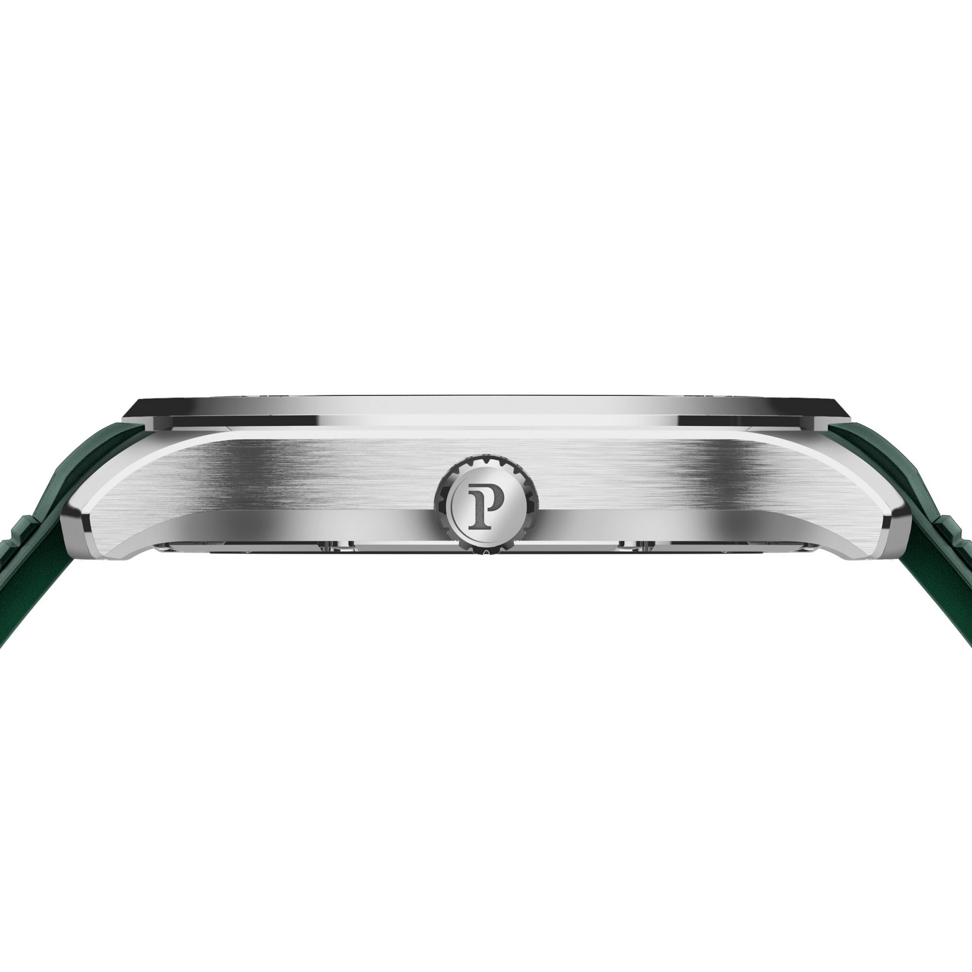 18K platinum case, 42mm diameter, 8.65mm thickness, platinum bezel or bezel set with emeralds, platinum crown, sapphire crystal, blue or green obsidian dial, platinum hands, Caliber 1255P automatic movement, 25 jewels, 21,600 vibrations per hour, 42-hour power reserve, green rubber strap, water resistance 30 meters.