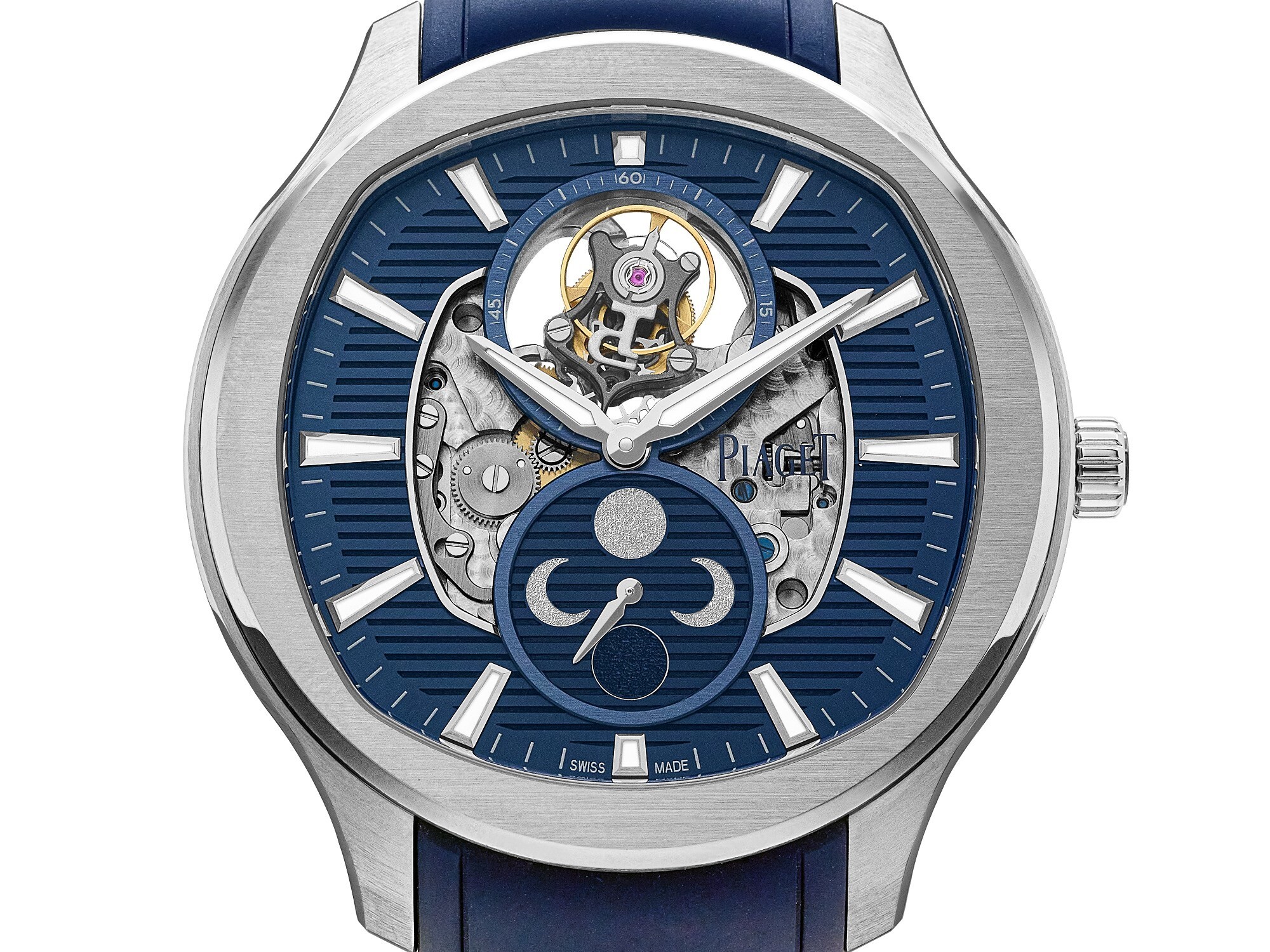 The classic blue dial, with gadroon decoration, adopts a figure-eight symmetric layout: the flying tourbillon frame in a signature “P” shape is located at 12 o’clock and serves as the seconds indicator with a one-minute rotation; at 6 o’clock sits the moon-phase display, which requires correction only once every 122 years. The hour and minute hands and indices are coated with Super-LumiNova for legibility in the dark. The central cushion shape echoes the case contour, and the open-worked dial reveals the movement’s fine polishing and bevelled edges.