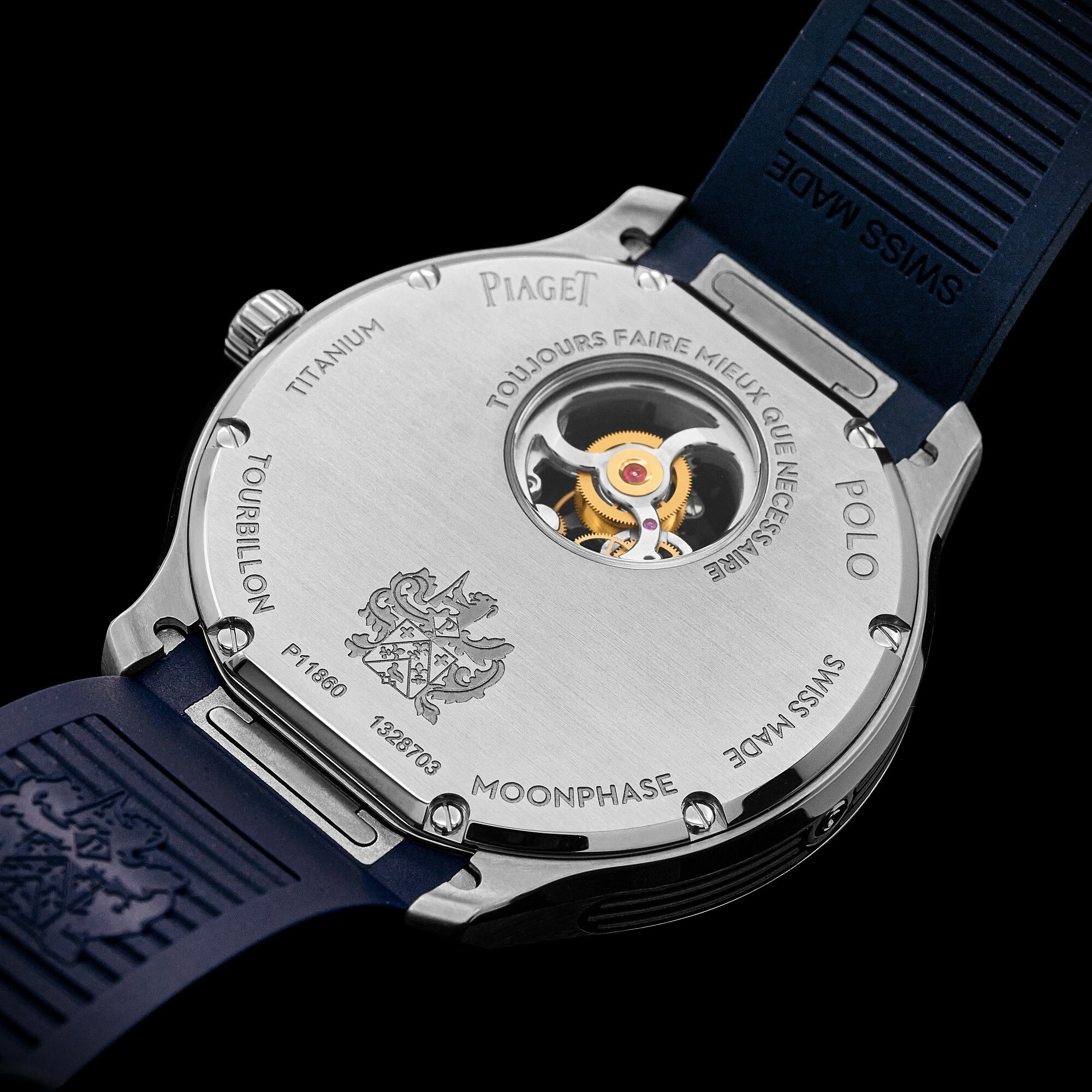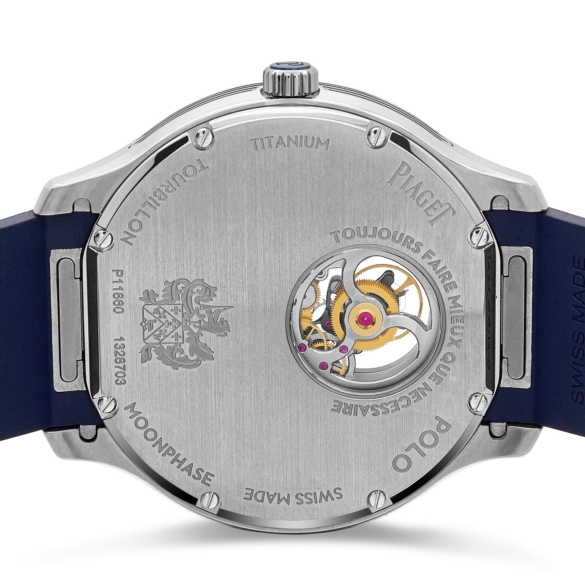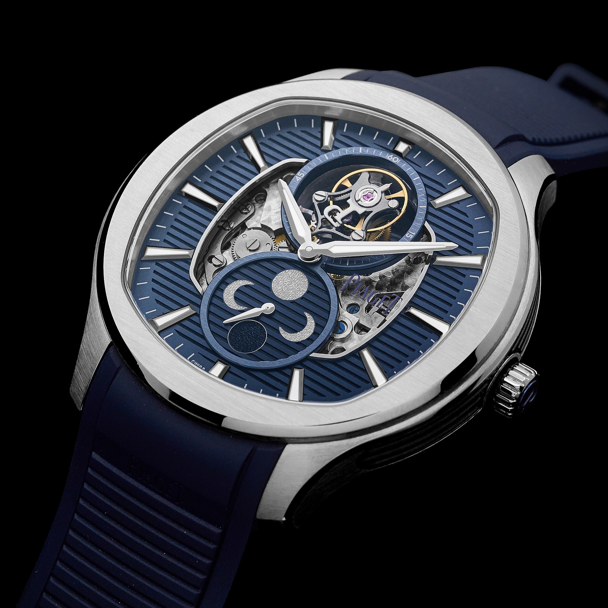 The 44 mm titanium case, continuing the Polo series’ “style within a form” design, is just 9.8 mm thick, offering a light and comfortable wear. The case is treated with alternating horizontal satin-brushed and mirror-polished surfaces, producing a striking play of light and shadow. The case flank features blue PVD-coated gadroon-style decorations; a hidden pusher at 9 o’clock adjusts the moon-phase display. The watch is water-resistant to 100 metres.