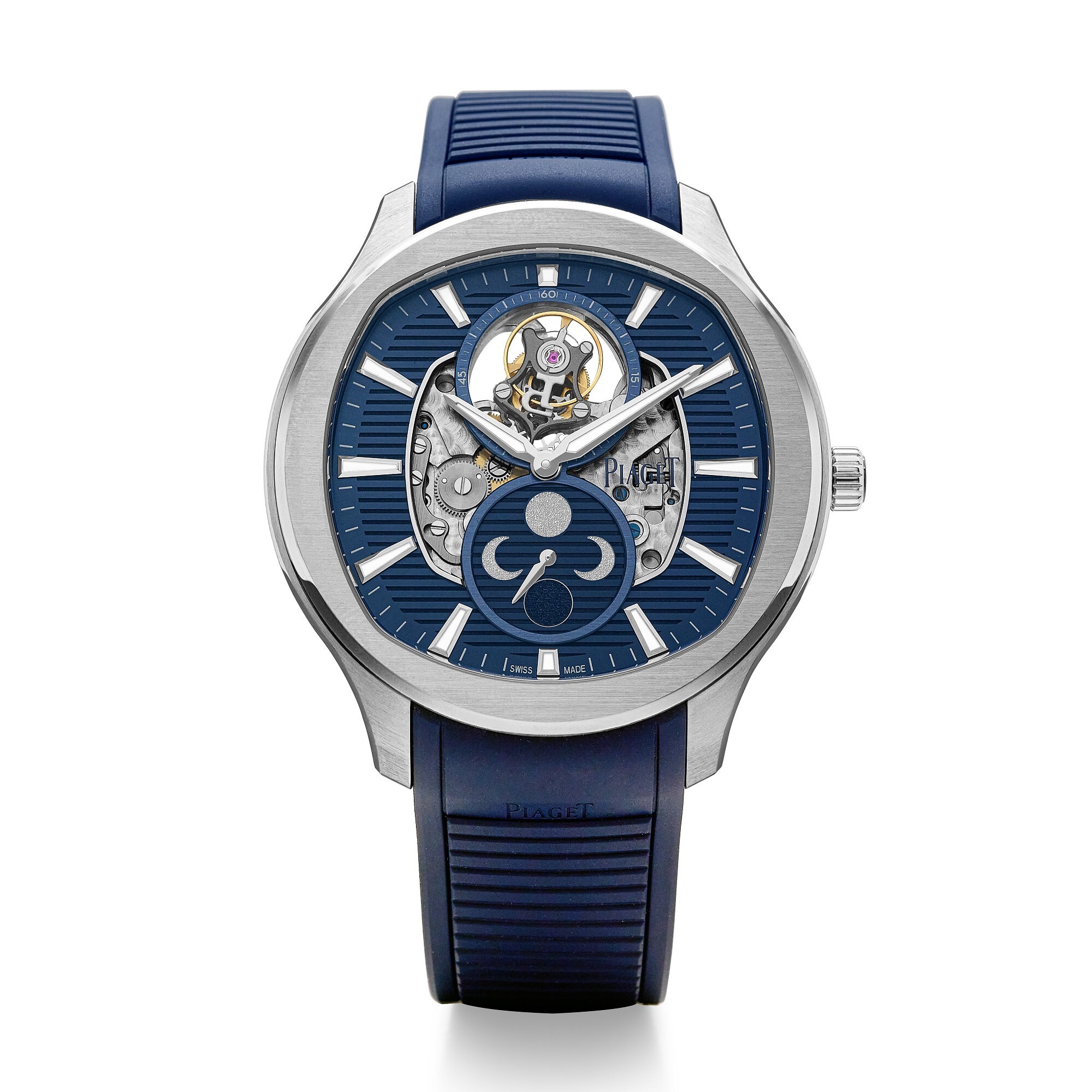 Piaget presents this Polo Flying Tourbillon Moonphase — the first time in the Polo series that a flying tourbillon and a precision moon-phase indicator are integrated into an ultra-thin movement. The cushion-shaped skeleton dial maximises visibility of the movement’s refined finishing, making the intricate details truly memorable.