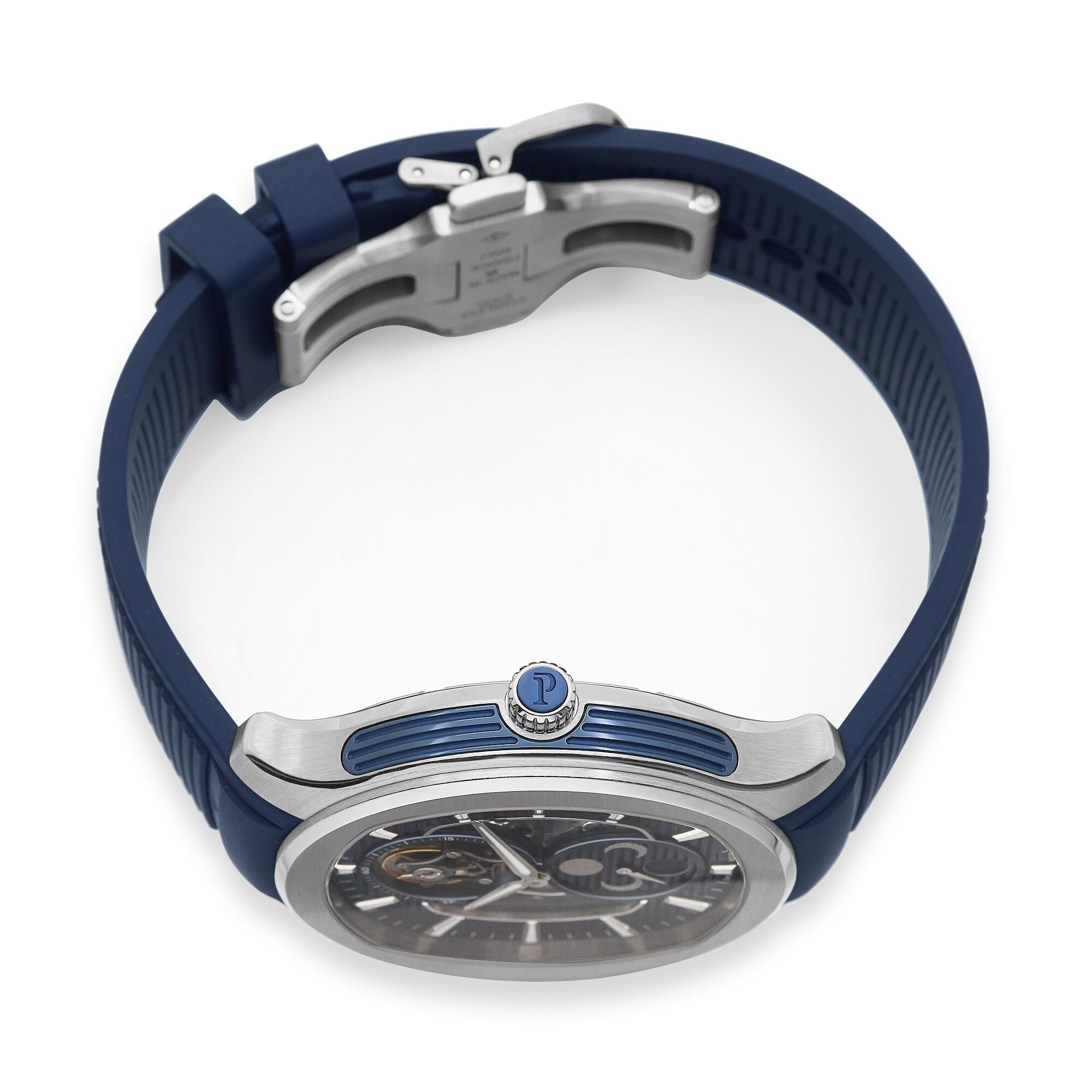 Titanium case, 44 mm diameter, approx. 9.8 mm thickness; titanium bezel, titanium crown; sapphire crystal; blue skeleton dial; silver hands; calibre 642P manual-wind movement; 23 jewels; 21,600 vph; approx. 40-hour power reserve; blue rubber strap; folding clasp; 100 m water resistance.