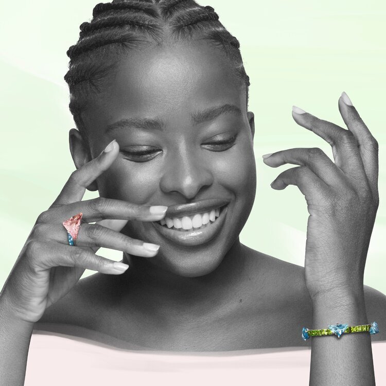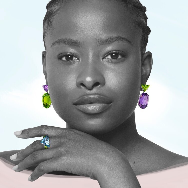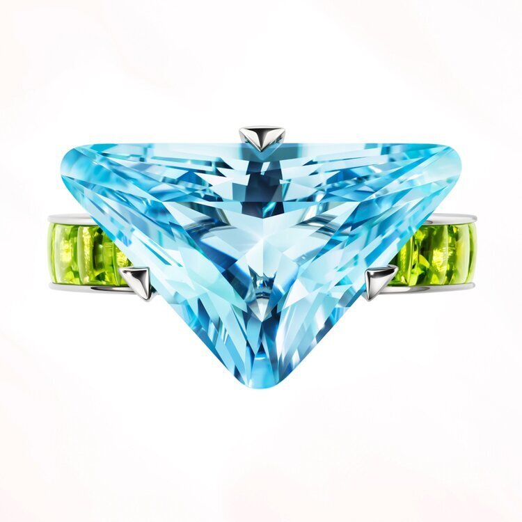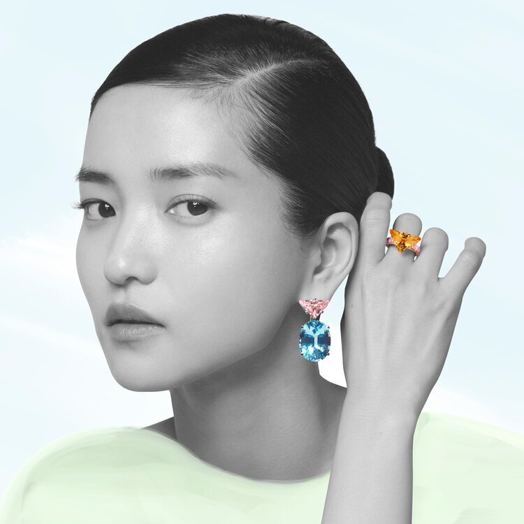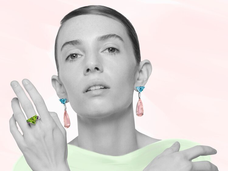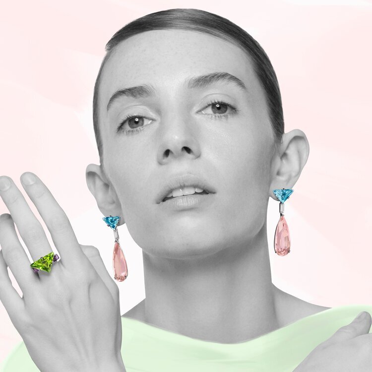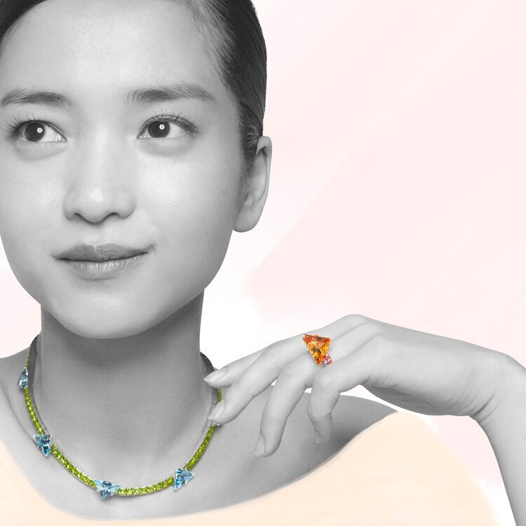 In the new collection, each ring centers on a triangular-cut colored gemstone, set upon an eternity band adorned with step-cut stones. The earrings play with symmetry — the left and right gems feature opposite cuts, creating a playful, modern balance. The necklace showcases a chain of square-cut gemstones linked together, with five interlaced triangular stones seamlessly embedded along the neckline — a design that exudes both opulence and grace.