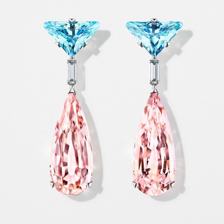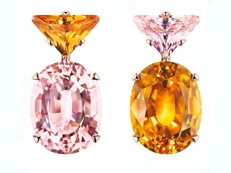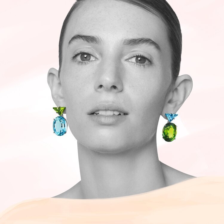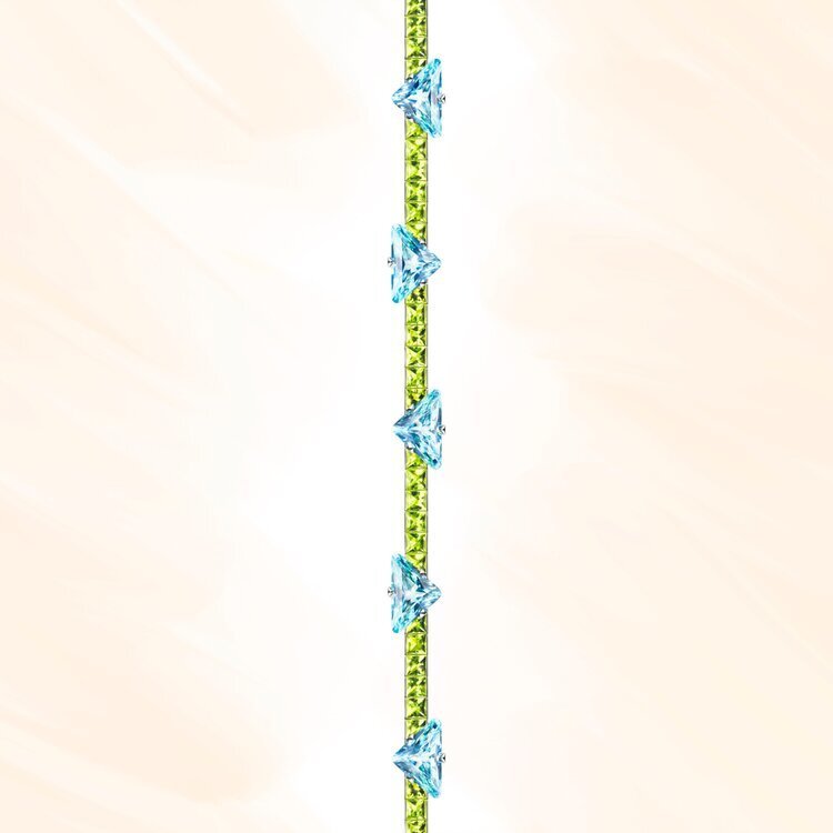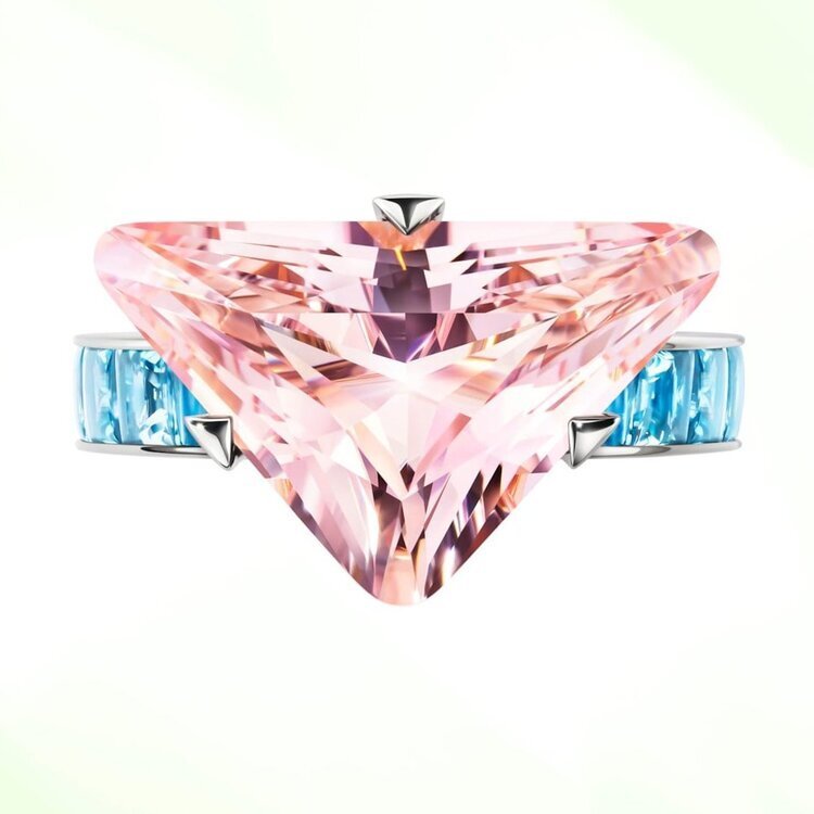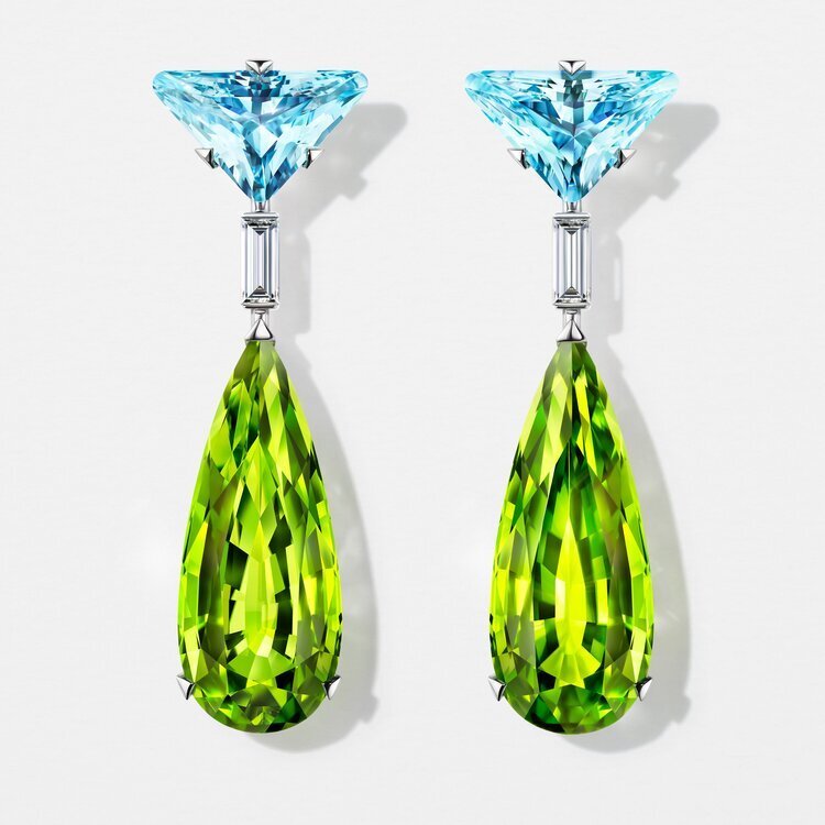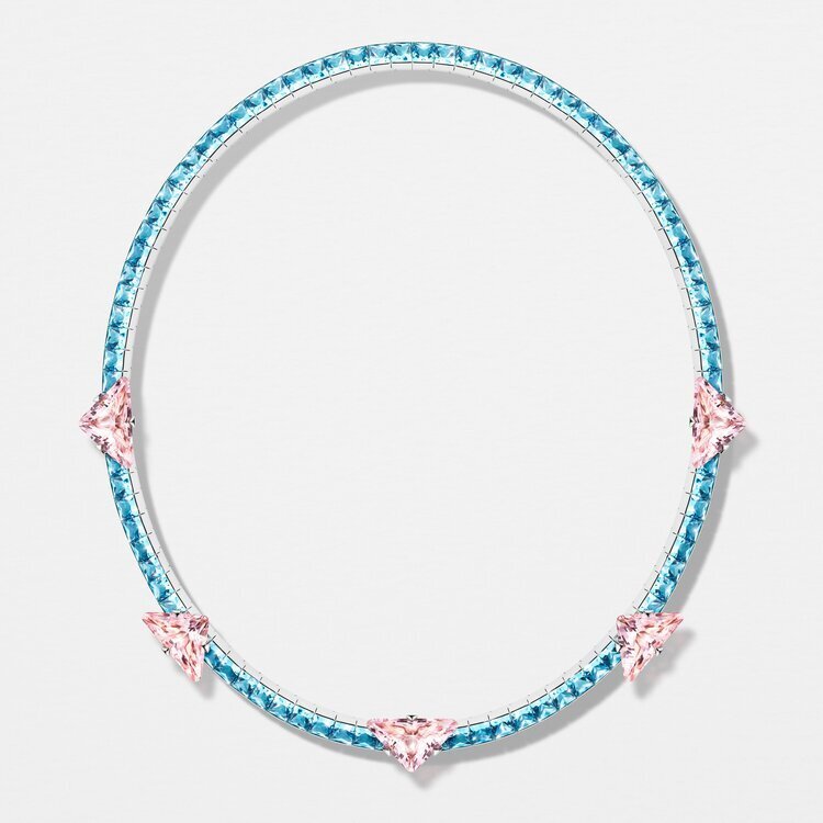 In the new collection, each ring centers on a triangular-cut colored gemstone, set upon an eternity band adorned with step-cut stones. The earrings play with symmetry — the left and right gems feature opposite cuts, creating a playful, modern balance. The necklace showcases a chain of square-cut gemstones linked together, with five interlaced triangular stones seamlessly embedded along the neckline — a design that exudes both opulence and grace.